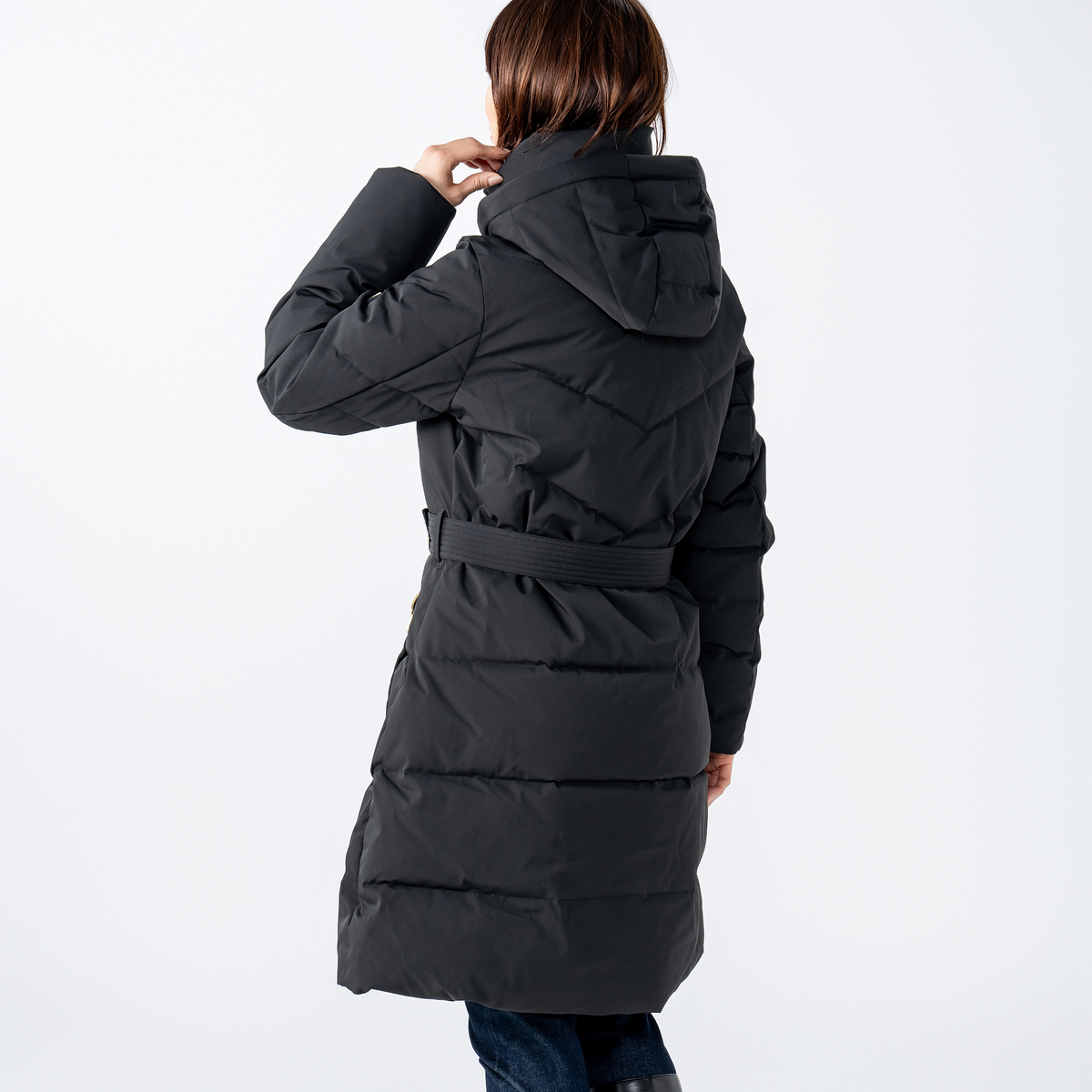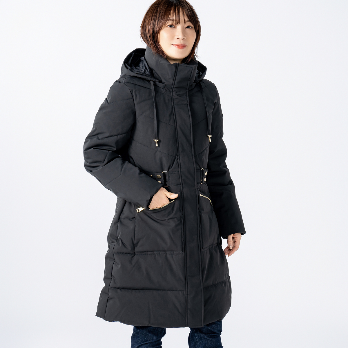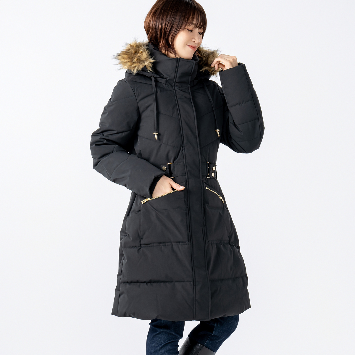 肉厚なキルティングとフェイクファー付きフードが華やかな、ロングパファージャケット。ウエストのベルトが体のラインを引き立て、すっきりとした印象をもたらします