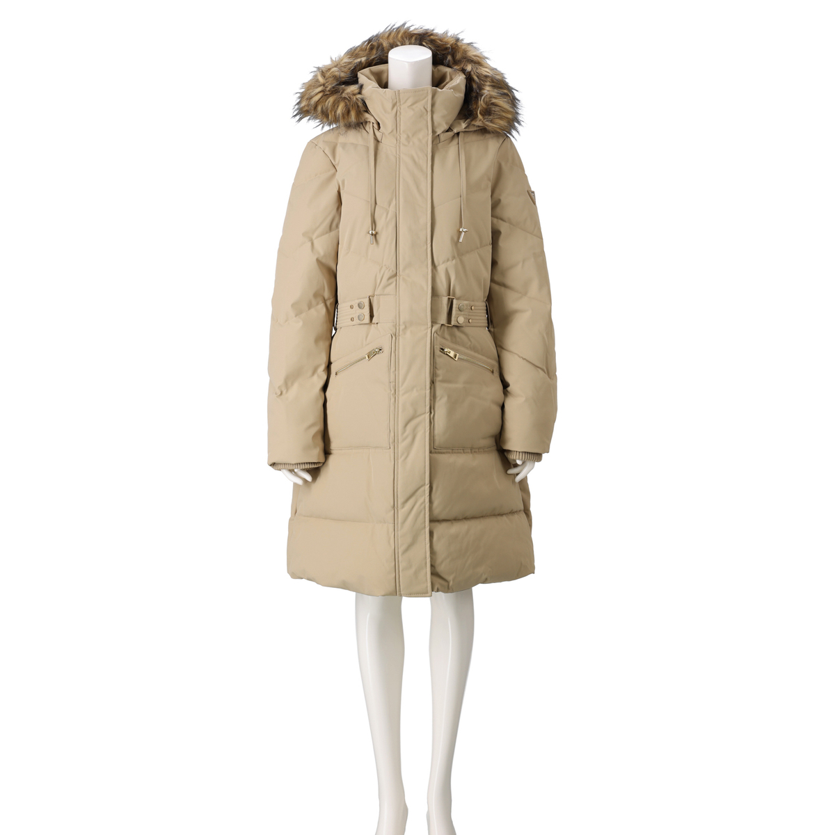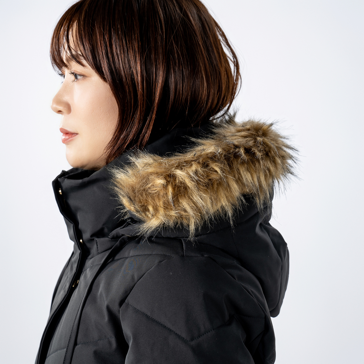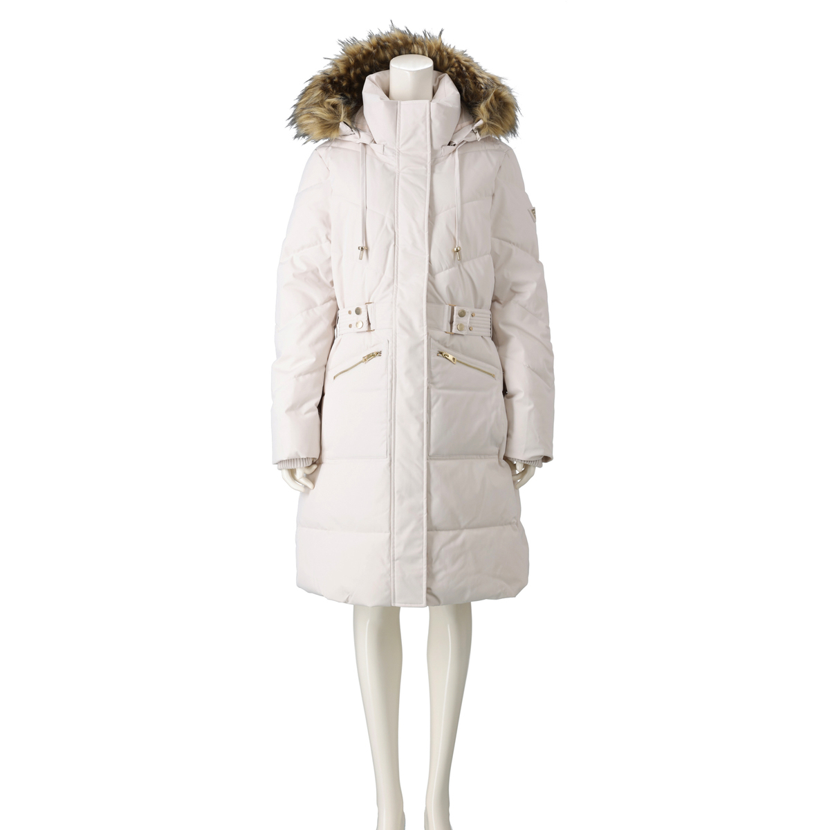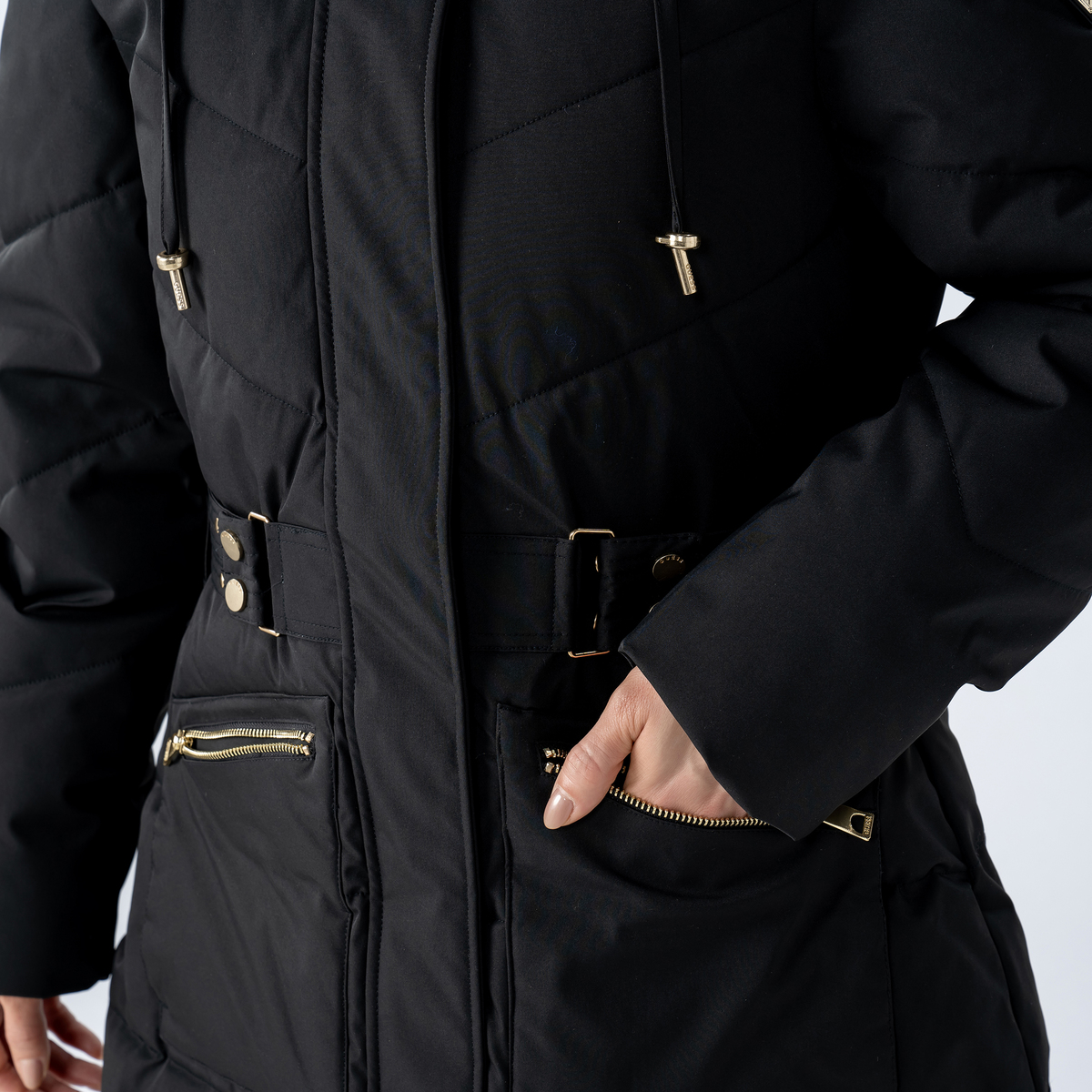 肉厚なキルティングとフェイクファー付きフードが華やかな、ロングパファージャケット。ウエストのベルトが体のラインを引き立て、すっきりとした印象をもたらします