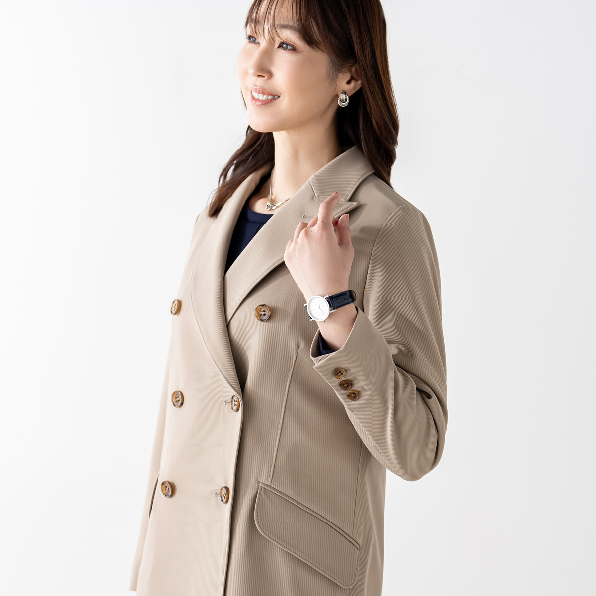 フォーマルシーンにも、カジュアルダウンしても映えるピーク衿のジャケット。ウエストを適度に絞ったフェミニンなBOXシルエットで、様々なボトムスに合わせやすい丈感。後ろ中心の裾は動きやすいベント仕様です