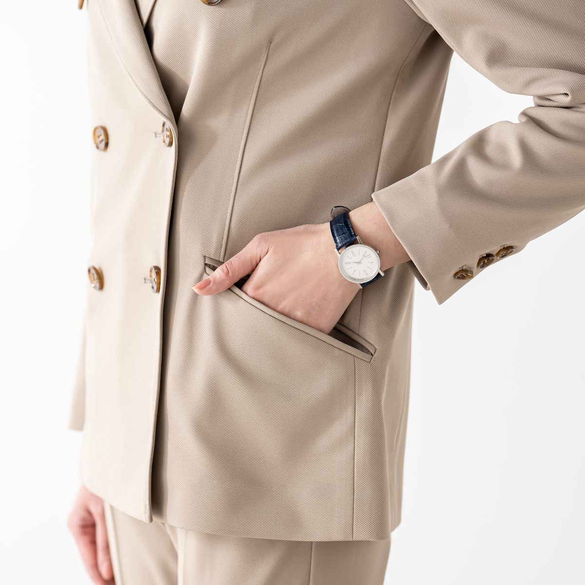 ラペル端のフラワーホールにはお手持ちのラペルピンやブローチを飾れる仕様。また、袖口は本切羽仕様で、ボタンを外して袖をまくった着こなしも楽しめます