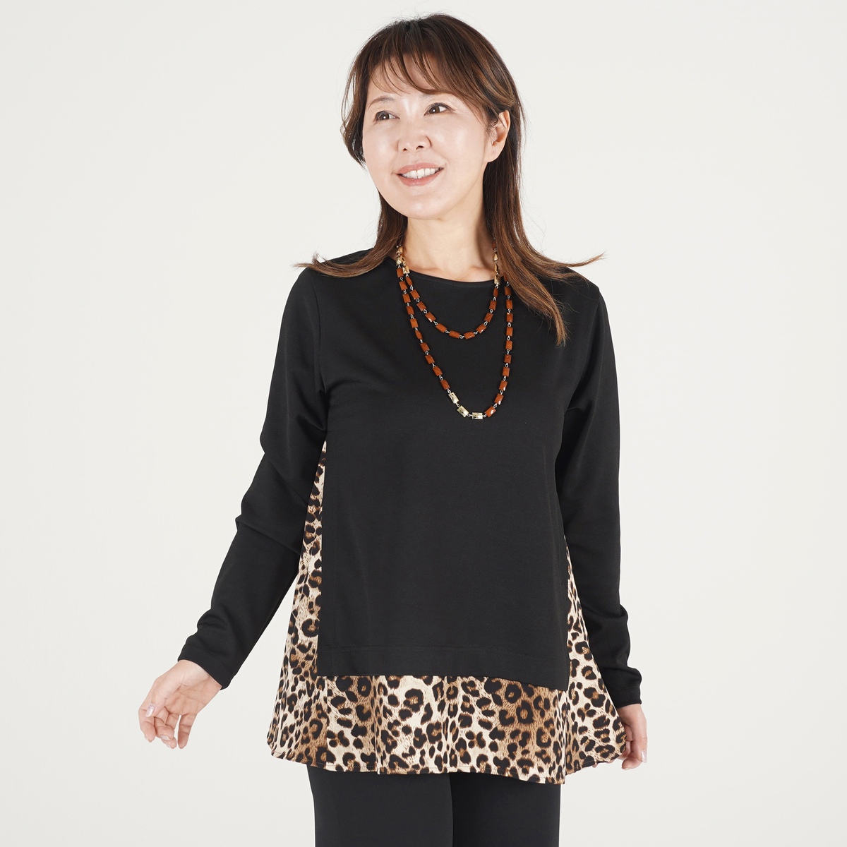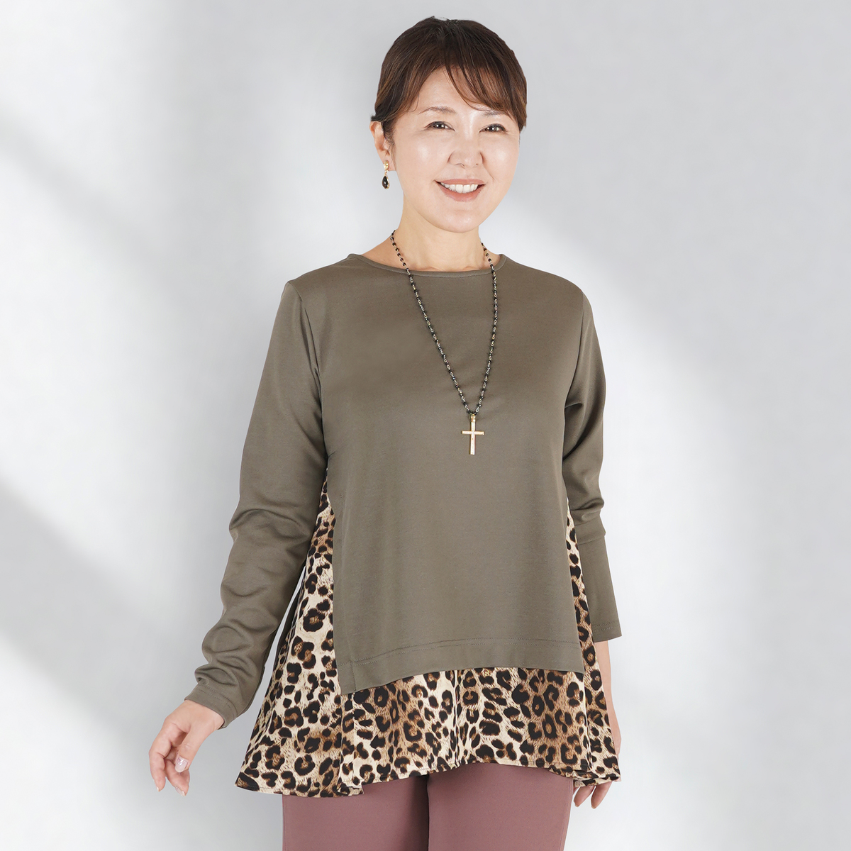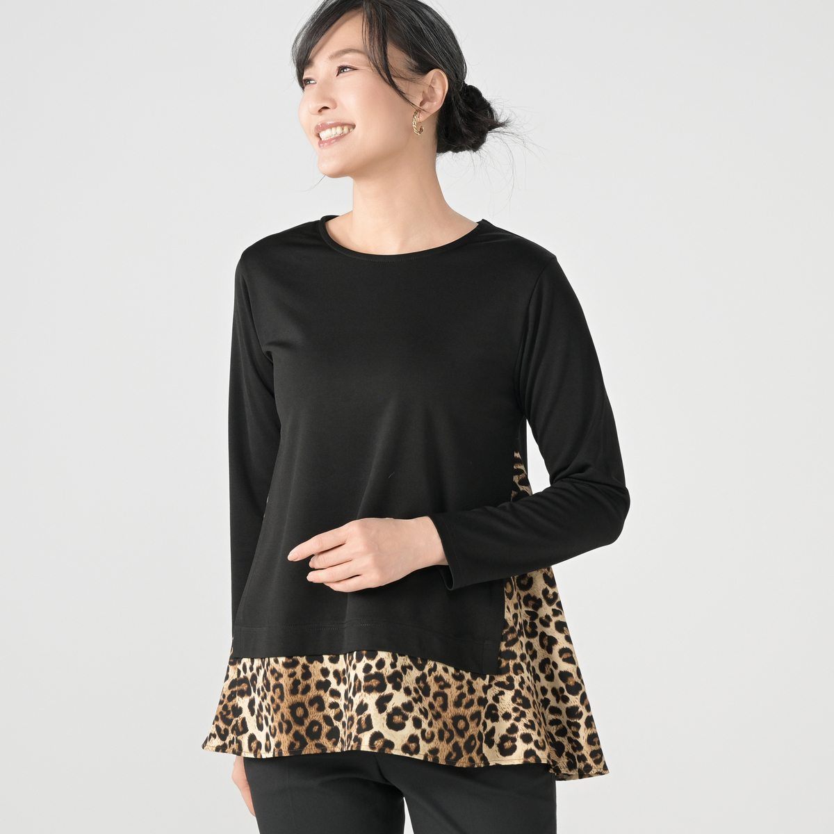 シンプルなクルーネックとセットインスリーブの組合せが上品さを醸し出すプルオーバー。身幅にはほどよいゆとりを持たせ、脇から裾部分を切替えて、レオパード柄のフレアをドッキングしています