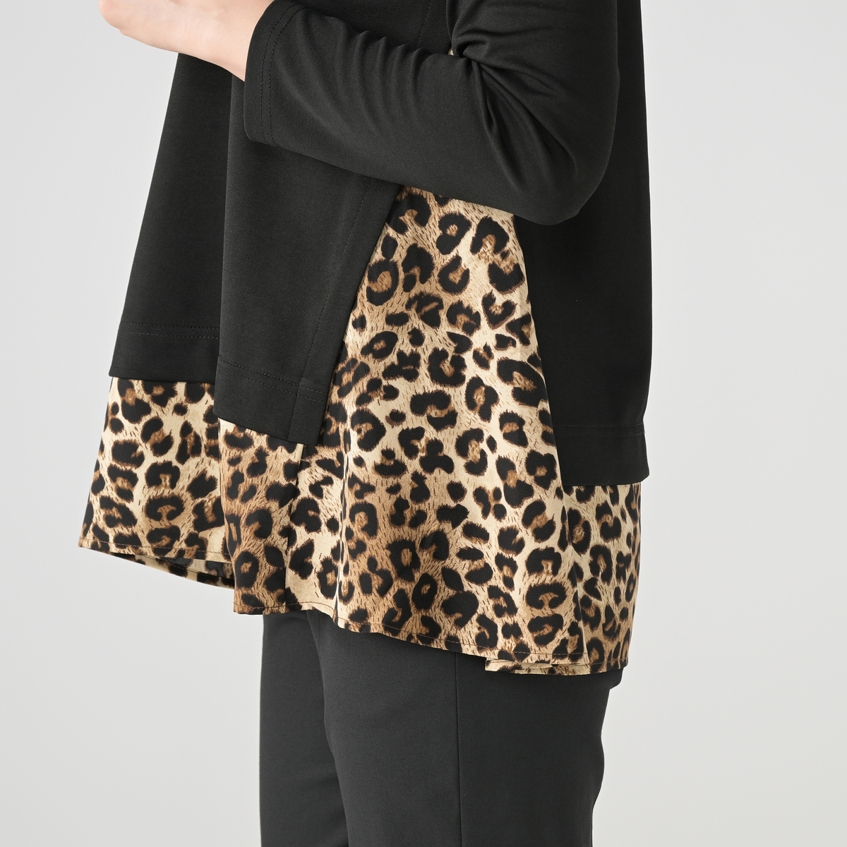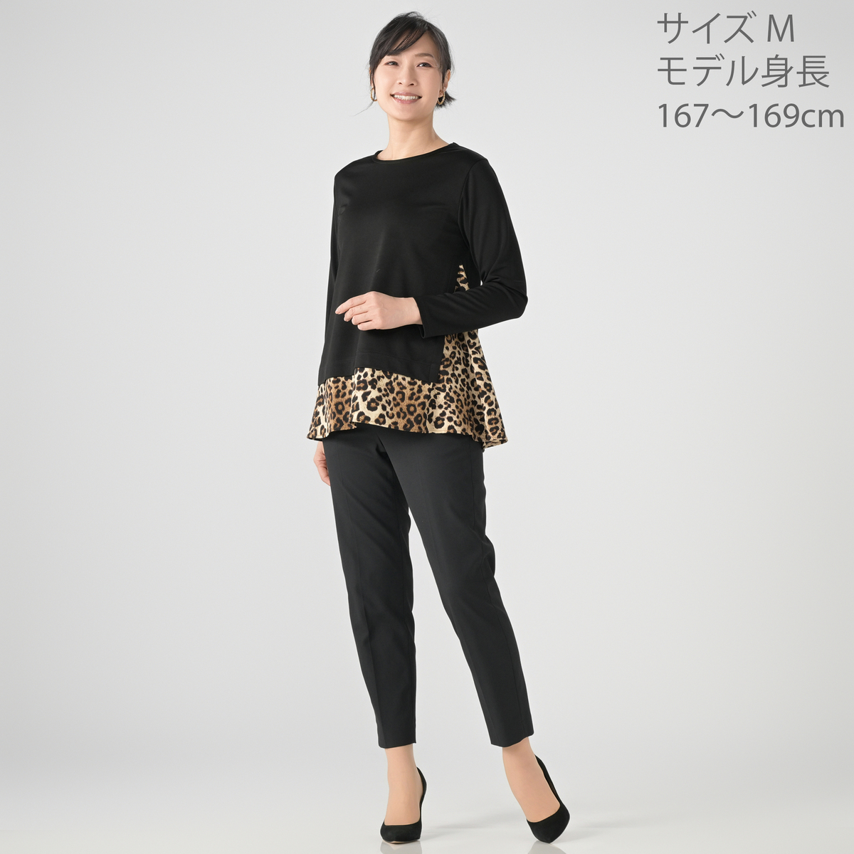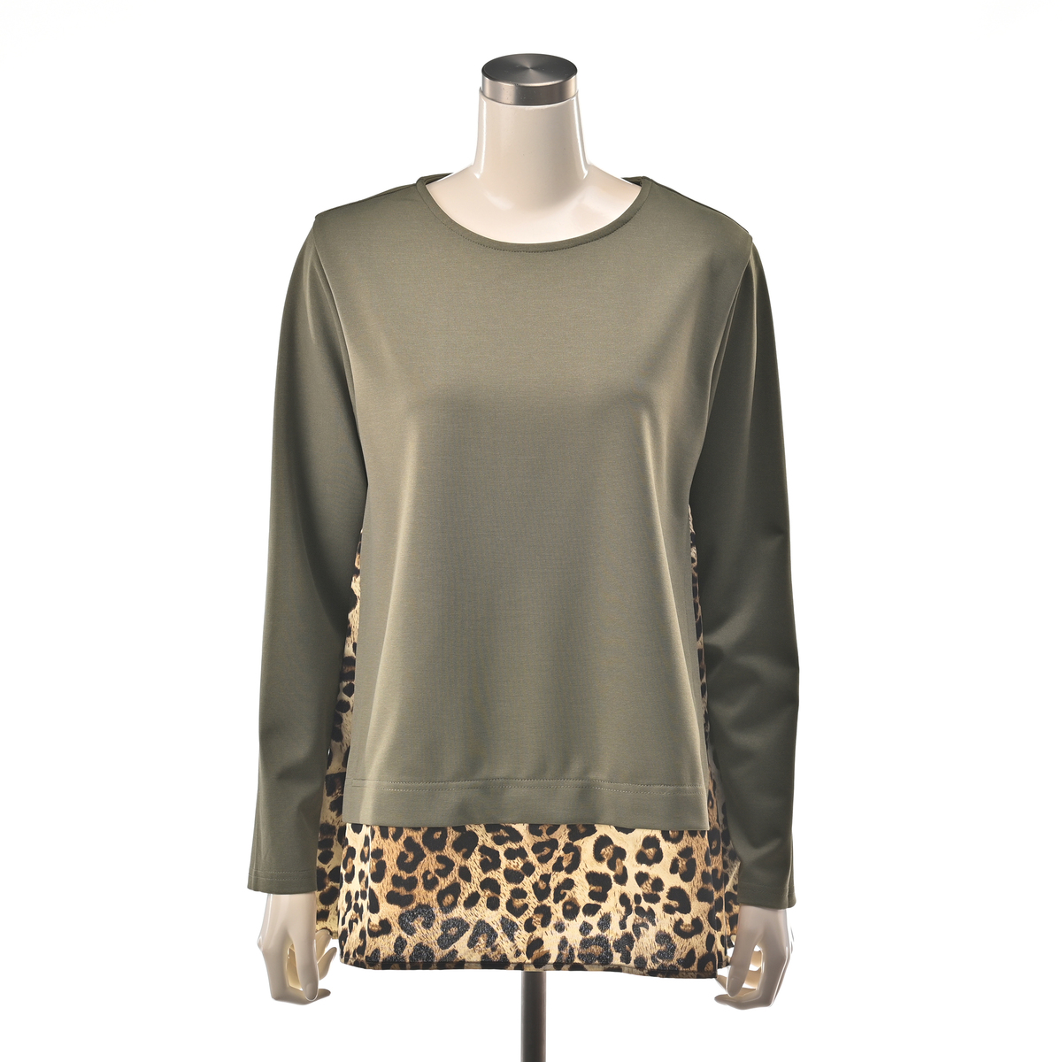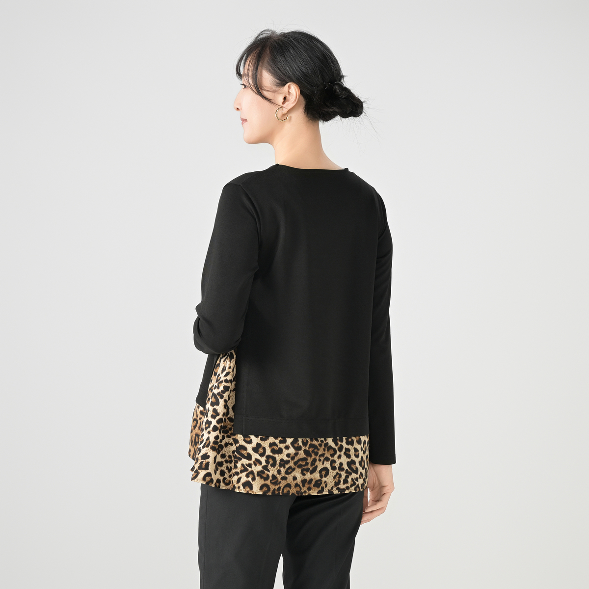 シンプルなクルーネックとセットインスリーブの組合せが上品さを醸し出すプルオーバー。身幅にはほどよいゆとりを持たせ、脇から裾部分を切替えて、レオパード柄のフレアをドッキングしています