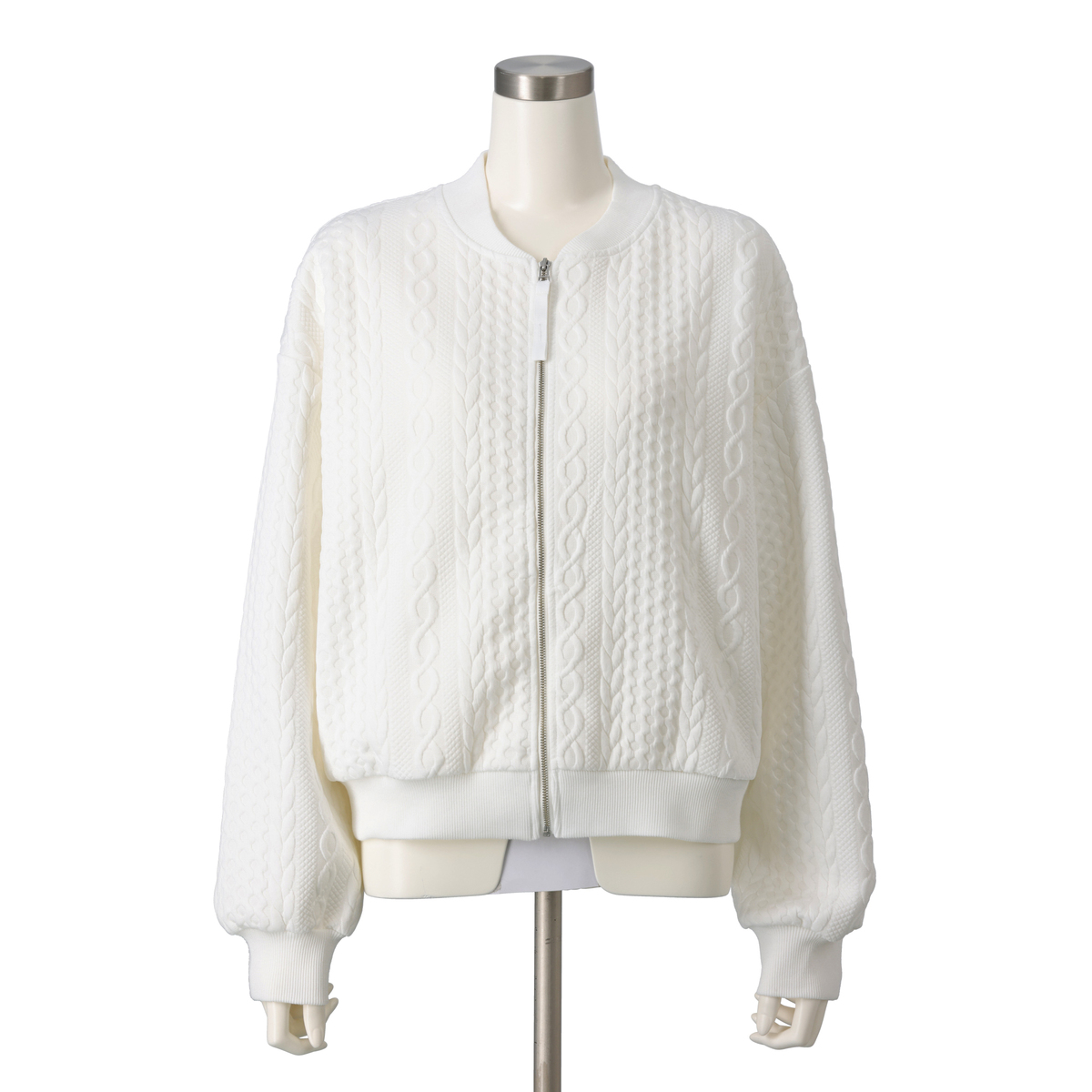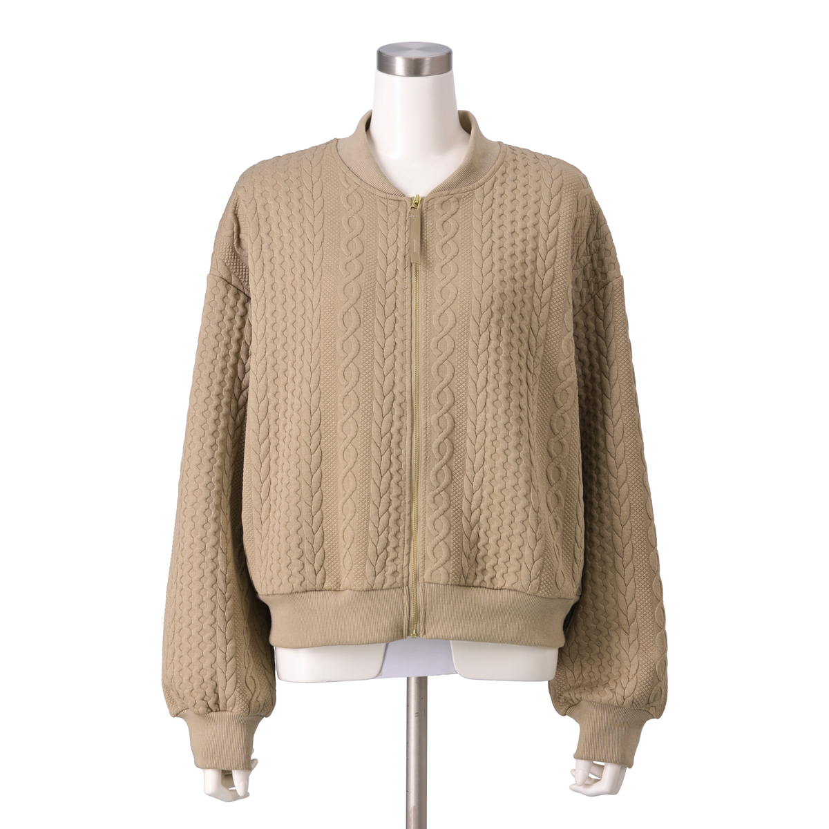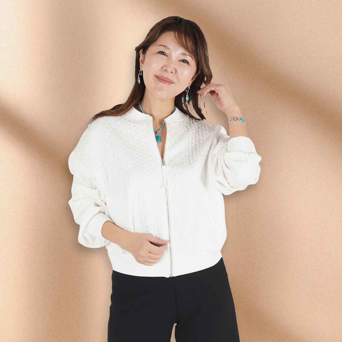 立体的なケーブル柄が映えるジャカード素材のブルゾン。軽くふんわりとした膨らみ感と柔らかな着心地に加え、ストレッチ性で動きやすく快適です。程よい厚みで一枚でも安心。光沢感のある金属ファスナーがモダンな印象を添え、さらに本体にはUVカット機能も備えています