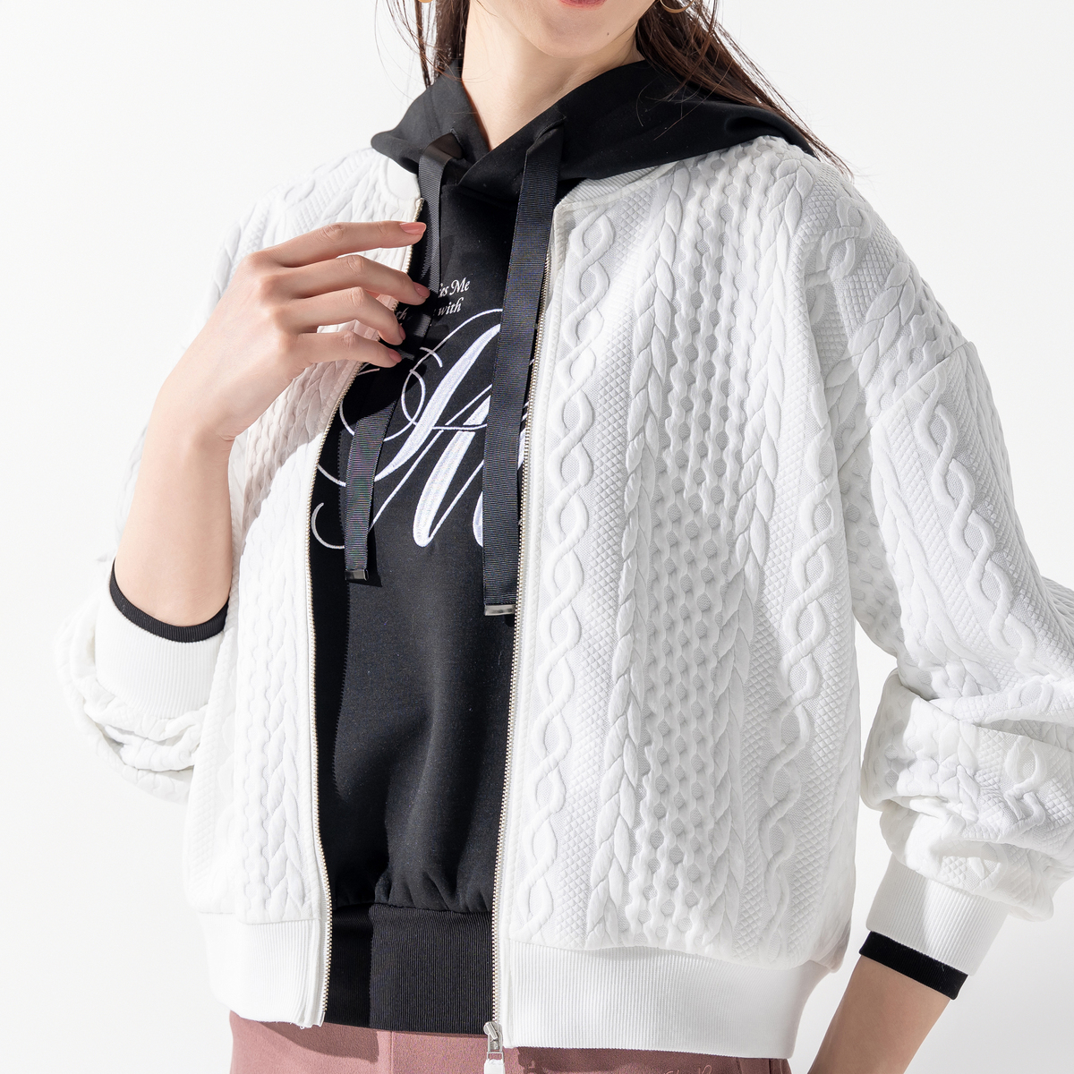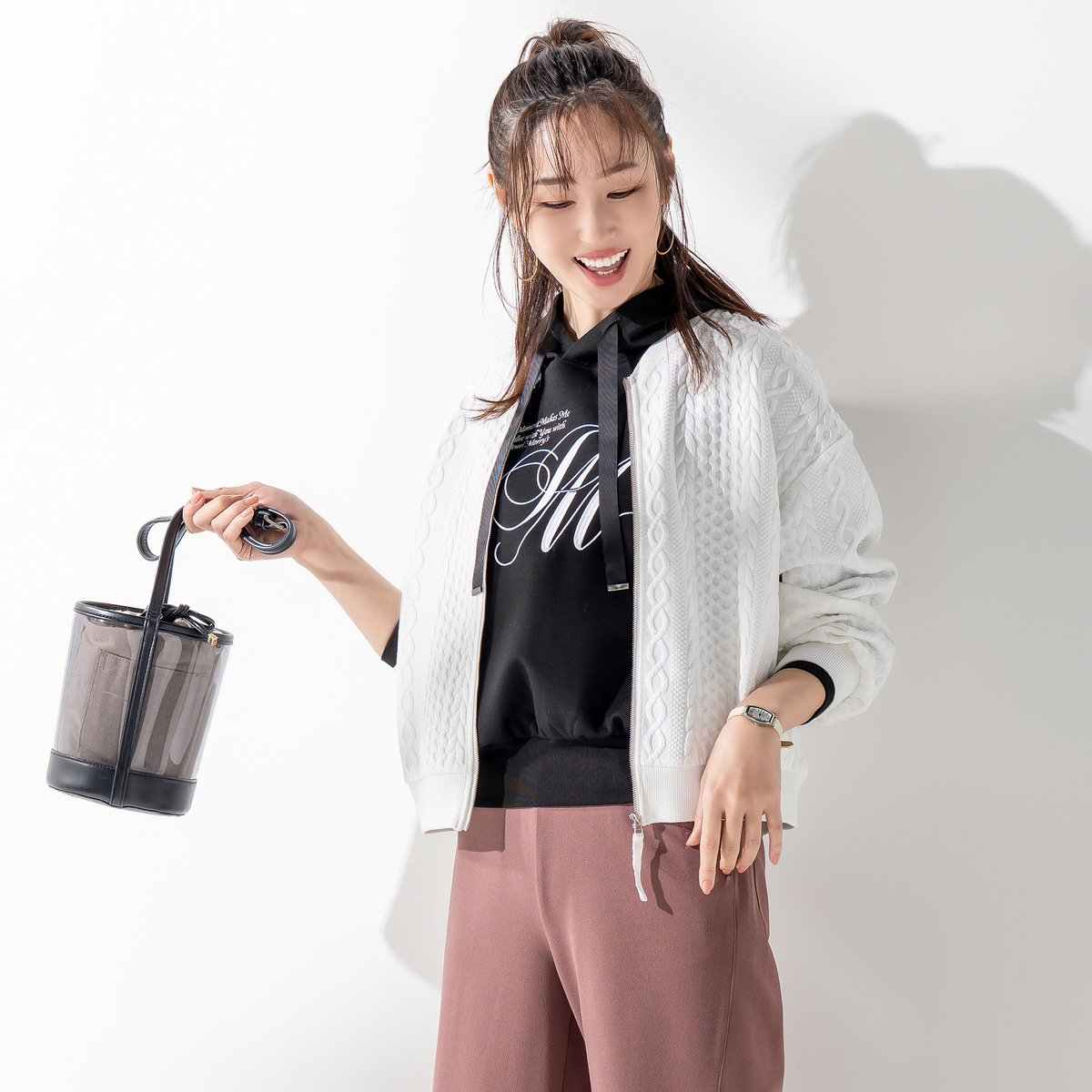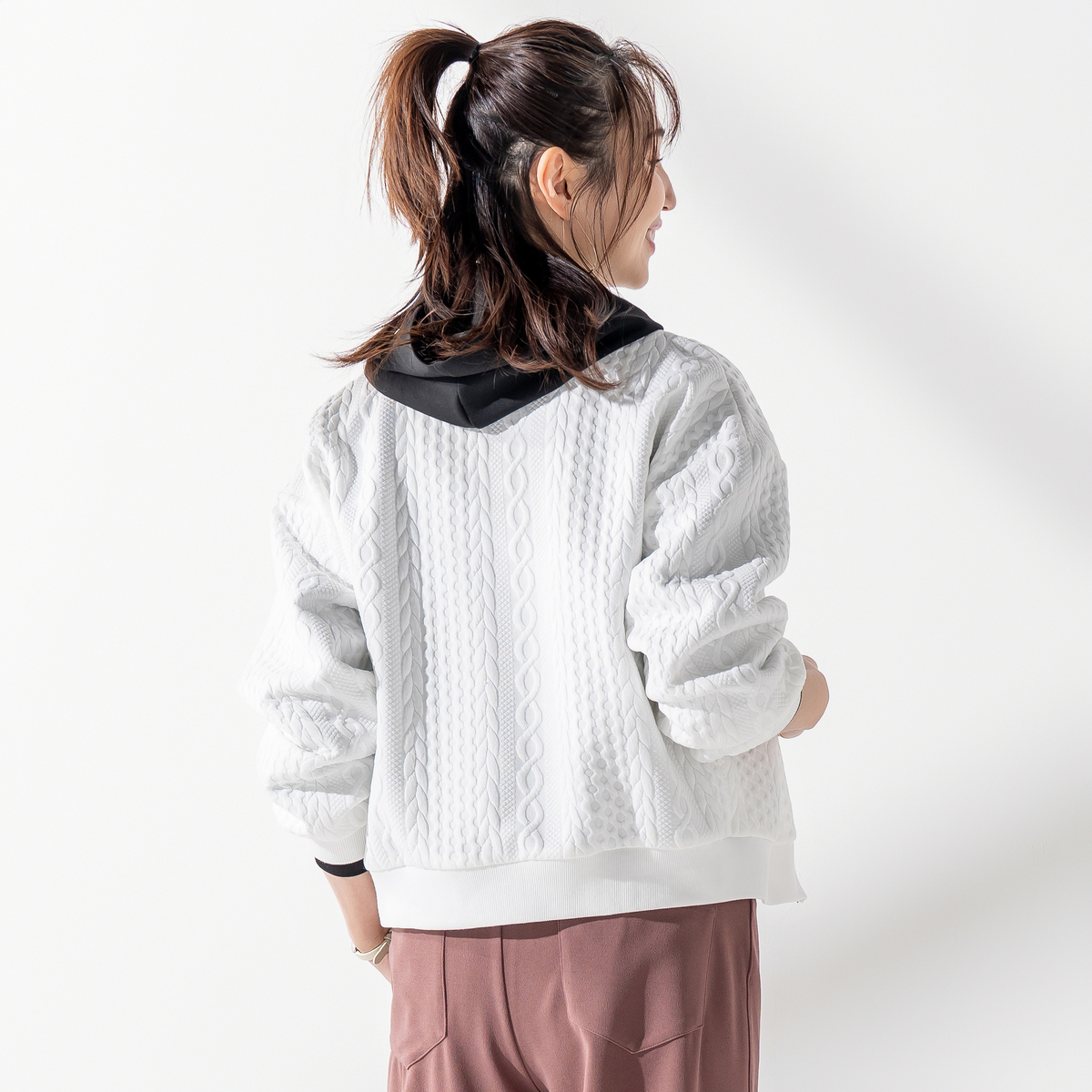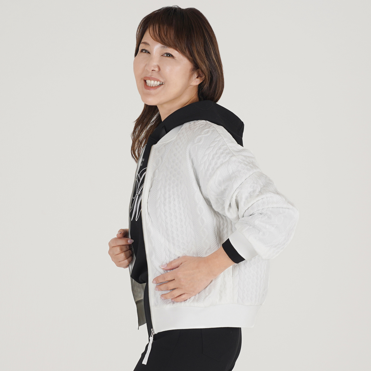 立体的なケーブル柄が映えるジャカード素材のブルゾン。軽くふんわりとした膨らみ感と柔らかな着心地に加え、ストレッチ性で動きやすく快適です。程よい厚みで一枚でも安心。光沢感のある金属ファスナーがモダンな印象を添え、さらに本体にはUVカット機能も備えています