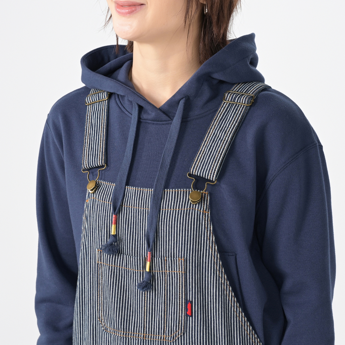 脇のハンマーループや胸当て部分のツールポケットなど、ワークウェアらしい実用的なデザイン。脇のボタンで簡単に着脱でき、肩のアジャスターで丈を調整できます