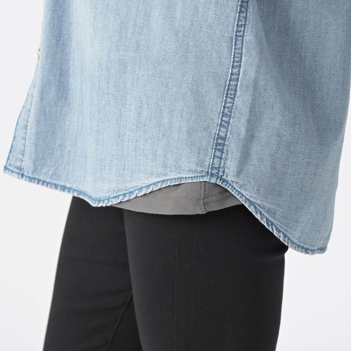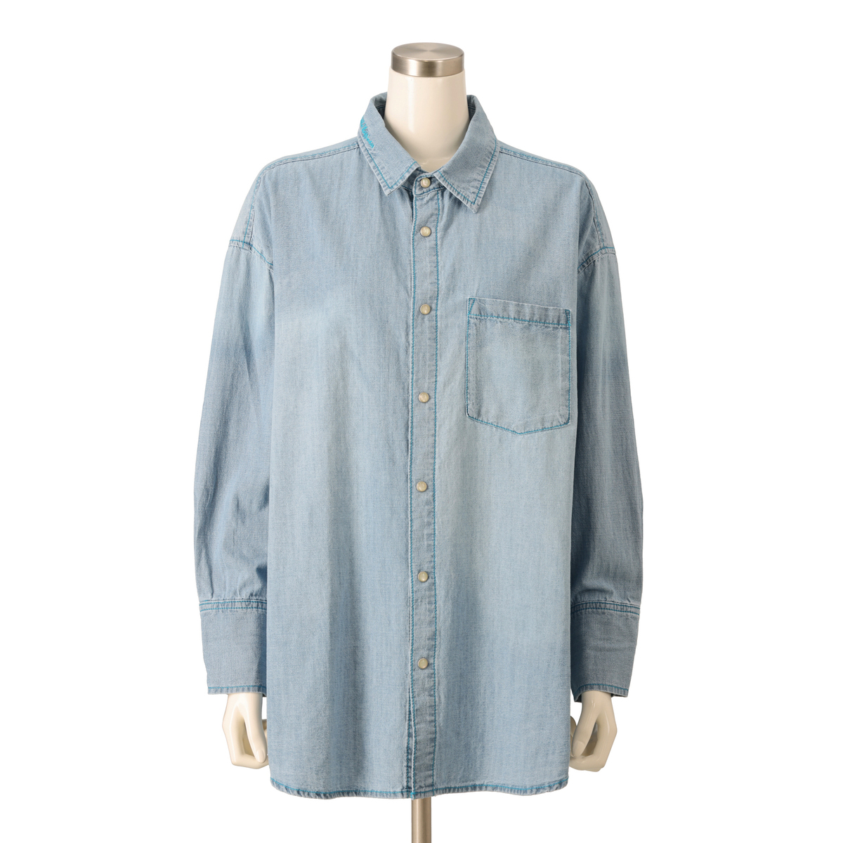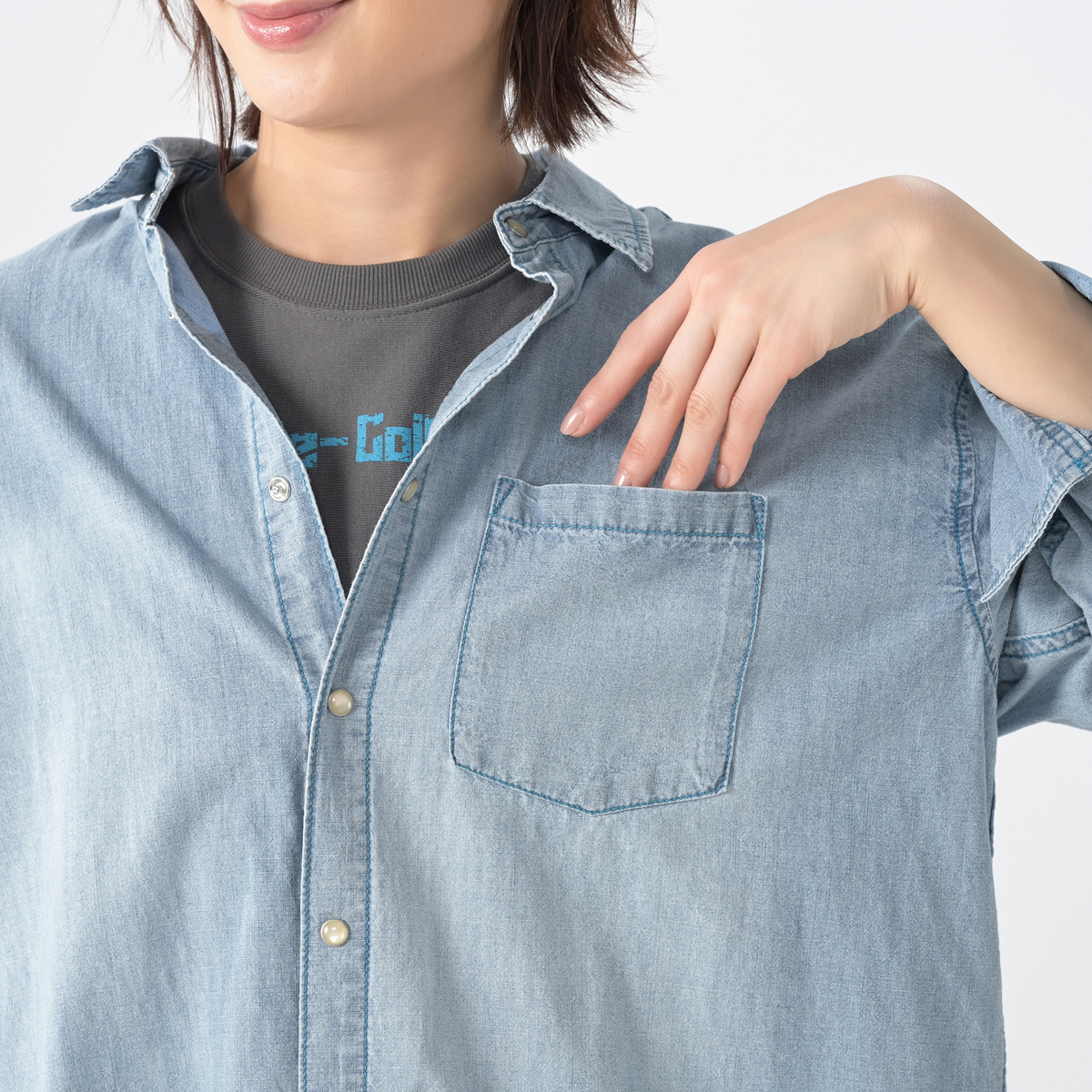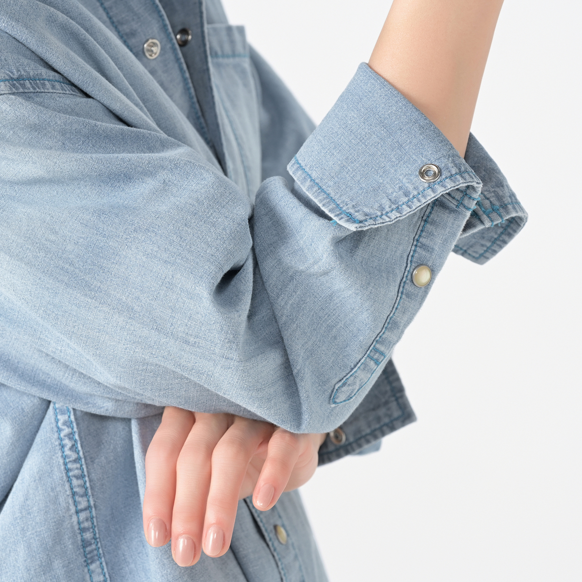 薄手のデニムシャツを探していてこれは良いかも!と思いポチリ。 164/54でMを購入しましたが全体的に大きすぎました。 特にニットなどのインすると裾幅が広すぎてもたつきます。 私はデニムシャツを羽織として着るのはあまり好きではないのでこれは利用できないと返品しました。 ブルーの色味もボタンもステッチの色も可愛いし生地も柔らかくとても気に入ったのですが残念です。
