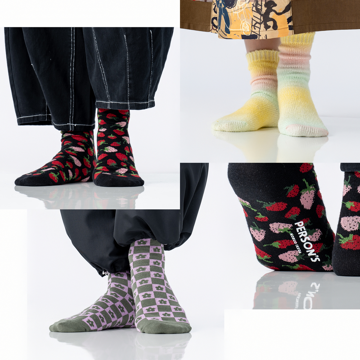 ストロベリー柄、グラデーション柄、フラワーチェック柄の3足セット。オリジナルポーチに入れてお届けします。デイリー使いはもちろん、ギフトにもおすすめのアイテムです