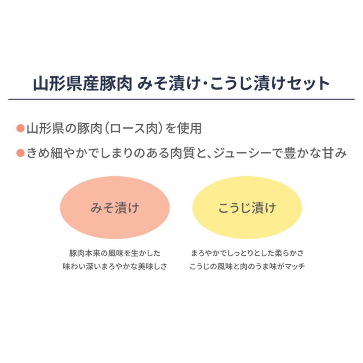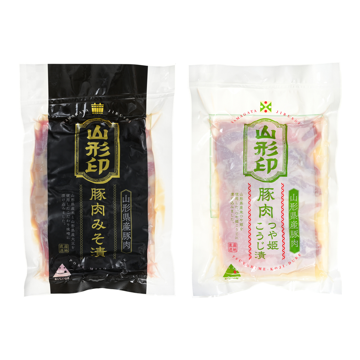 [アレルギー物質特定原材料8品目] なし [セット内容] ・味噌漬け 250g ・つや姫こうじ漬け 250g [賞味期限] 出荷時点で賞味期限まで35日以上ある商品をお届けします [保存方法] 開封前:冷凍(ー18℃以下)で保存してください 開封後:開封後はお早めにお召し上がりください [お召し上がり方] 袋のまま4℃前後の冷蔵庫にて解凍してください ※必ずお肉を中心まで充分に加熱してお召し上がりください [注意事項] ※再冷凍する事はおやめください ※味付け処理をしておりますので、中心部まで加熱してお召し上がりください [原料原産地] 味噌漬け:豚肉(山形県産) つや姫こうじ漬け:豚肉(山形県産)、麹(米麹(山形県産米)) [原産国] 日本 [原材料] 豚ロースみそ漬け:豚肉(山形県産)、みそダレ(みそ、米糖化液、糖類(砂糖、ぶどう糖果糖液糖)、酒粕、その他、(一部に豚肉・大豆を含む) 豚ロース麹漬:豚肉(山形県産)、麹(米麹(山形県産米)、上白糖、清酒、パイナップル濃縮果汁、水あめ混合ぶどう糖果糖液糖、食塩、酒粕、その他)、(一部に豚肉を含む)
