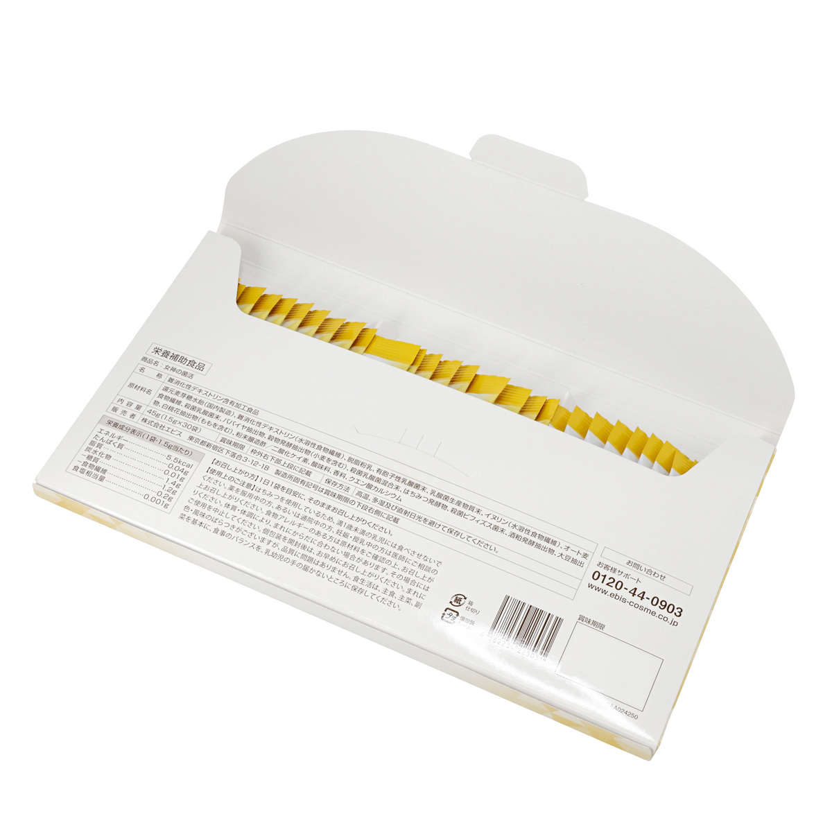 [アレルギー物質特定原材料8品目] 小麦、乳 ※はちみつを使用しているため、満1歳未満の乳児には食べさせないでください。 [内容量] 45g(1.5g×30袋)×2箱 [目安量] 1日1袋 [お召し上がり方] 1日1袋を目安に、そのままお召し上がりください [栄養成分表示](1袋1.5g当たり) エネルギー5.5kcal たんぱく質0.04g 脂質0.01g 炭水化物1.4 g -糖質1.2g -食物繊維0.2g 食塩相当量0.001g [保存方法] 高温、多湿及び直射日光を避け、涼しいところに保存してください [注意事項] ※薬を服用中の方、あるいは通院中の方、妊娠・授乳中の方は医師にご相談の上お召し上がりください ※はちみつを使用しているため、満1歳未満の乳児には食べさせないでください ※食物アレルギーのある方は原材料をご確認の上、お召し上がりください ※体質・体調により、まれにからだに合わない場合があります。その場合にはご使用を中止してください ※個包装を開封後は、お早めにお召し上がりください ※まれに色・風味のばらつきがございますが、品質に問題はありません ※食生活は、主食、主菜、副菜を基本に、食事のバランスを ※乳幼児の手の届かないところに保存してください [原料原産地] 還元麦芽糖水飴(国内製造) [原産国] 日本 [原材料]還元麦芽糖水飴(国内製造)、難消化性デキストリン(水溶性食物繊維)、脱脂粉乳、有胞子性乳酸菌末、乳酸菌生産物質末、イヌリン(水溶性食物繊維)、オート麦食物繊維、殺菌乳酸菌末、パパイヤ抽出物、穀物発酵抽出物(小麦を含む)、殺菌乳酸菌混合末、はちみつ発酵物、殺菌ビフィズス菌末、酒粕発酵抽出物、大豆抽出物、白桃花抽出物(ももを含む)、粉末醸造酢/二酸化ケイ素、酸味料、香料、クエン酸カルシウム