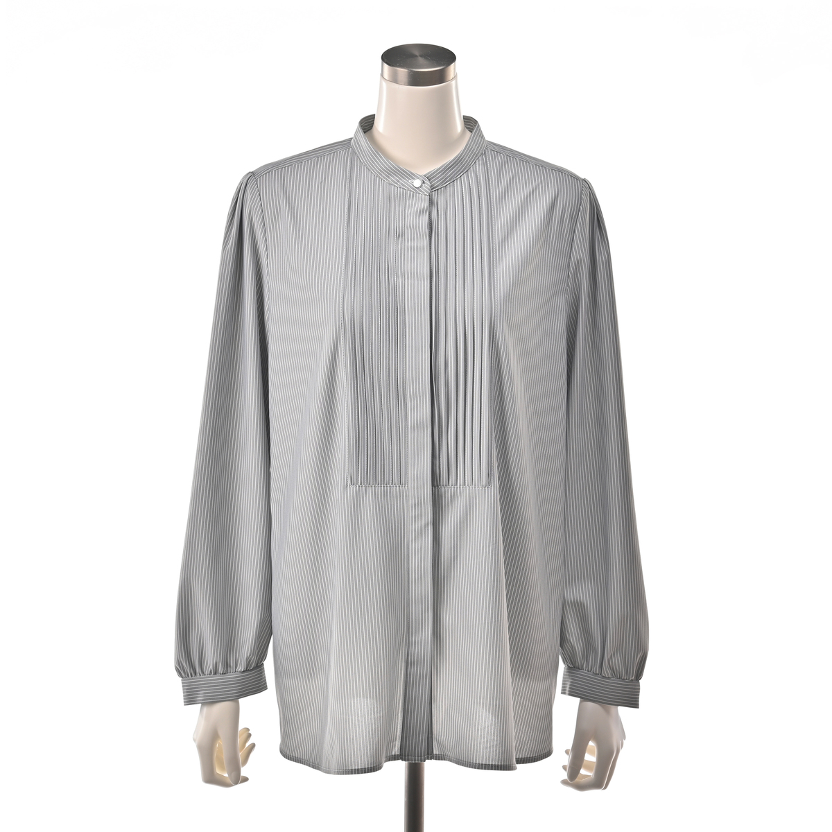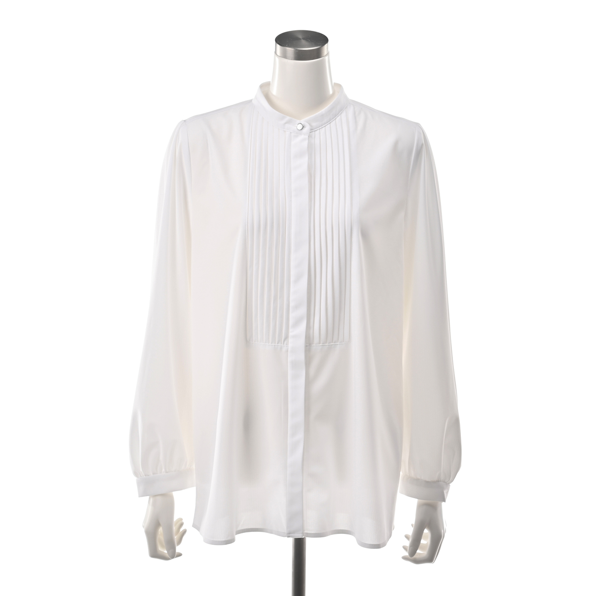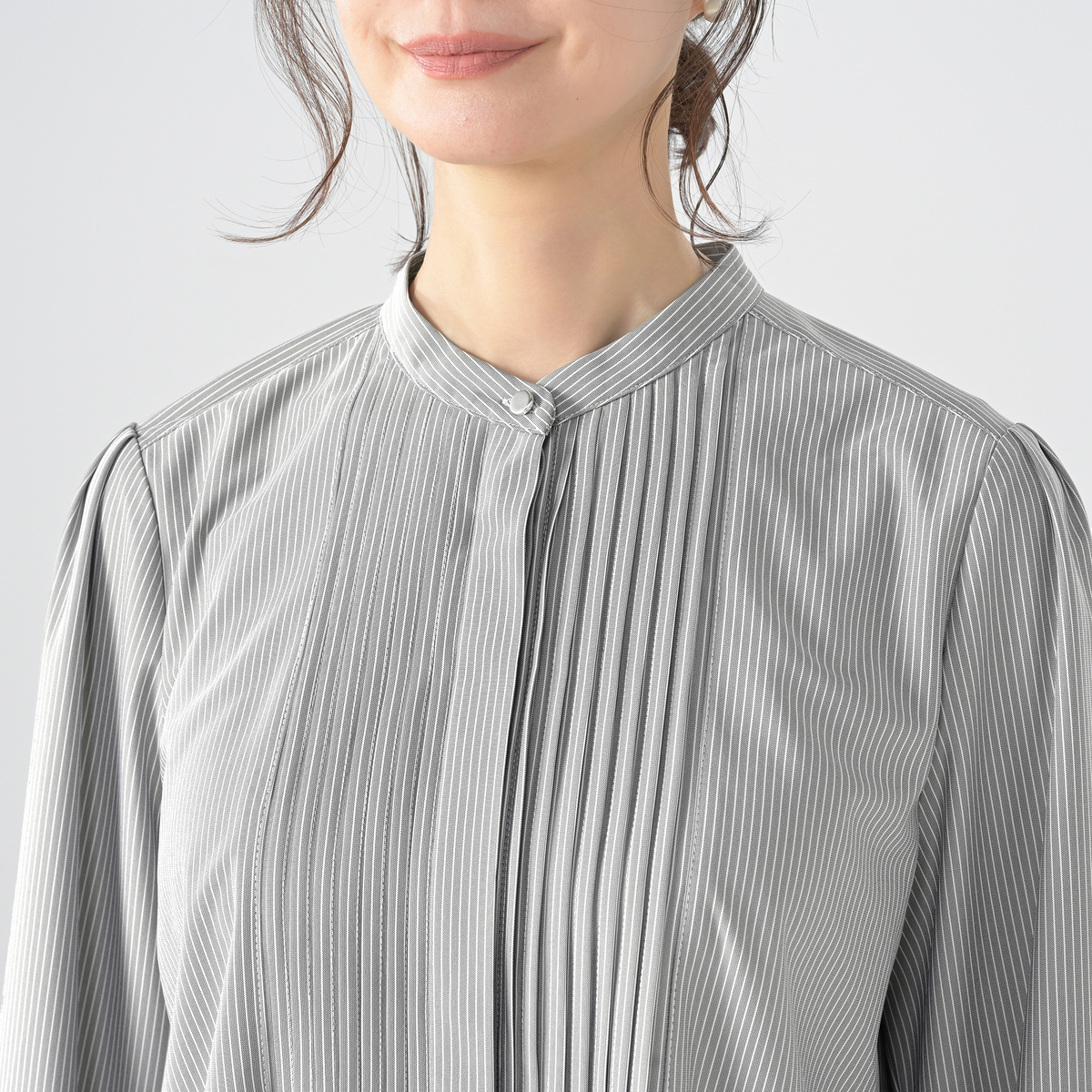 すっきりした印象を与えてくれるスタンド衿に、前身にはタックをあしらった仕立て。ブザムカラーにした、前開き仕様の比翼デザインです。ジャケットのインナーとしても1枚着としても重宝するブラウスです