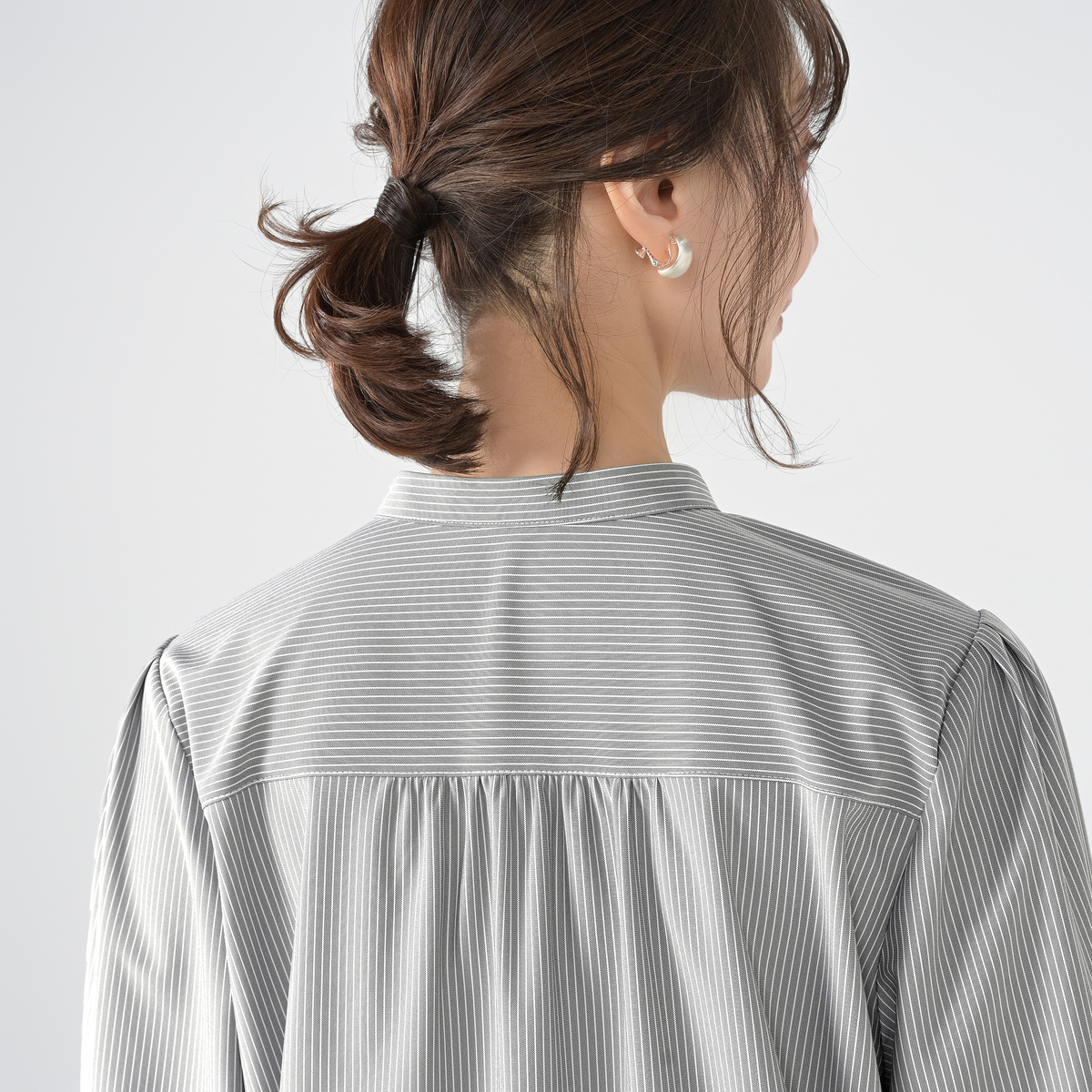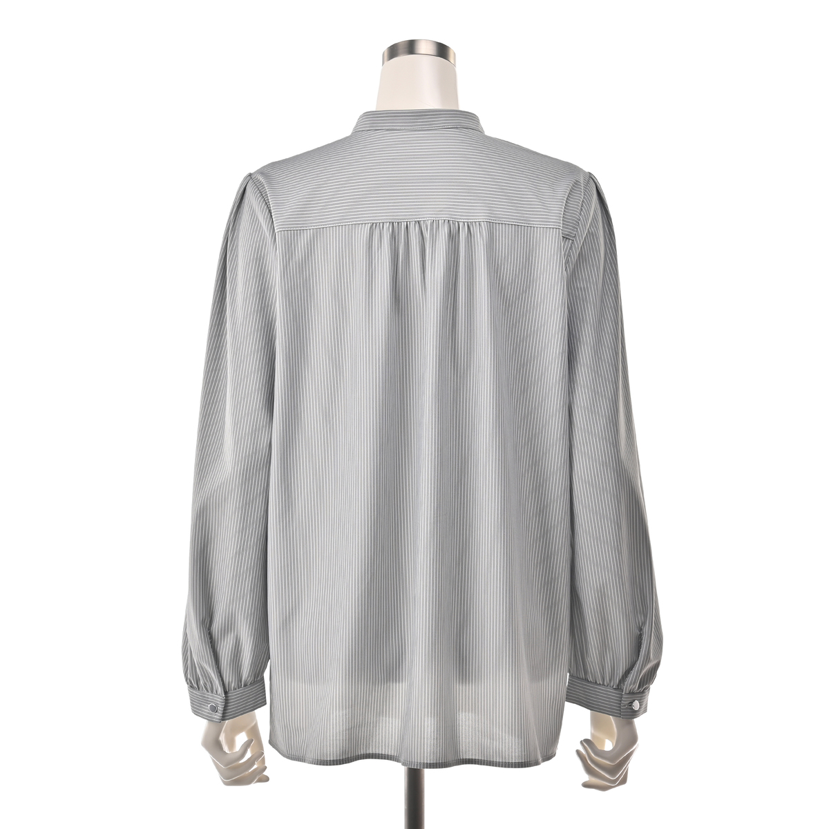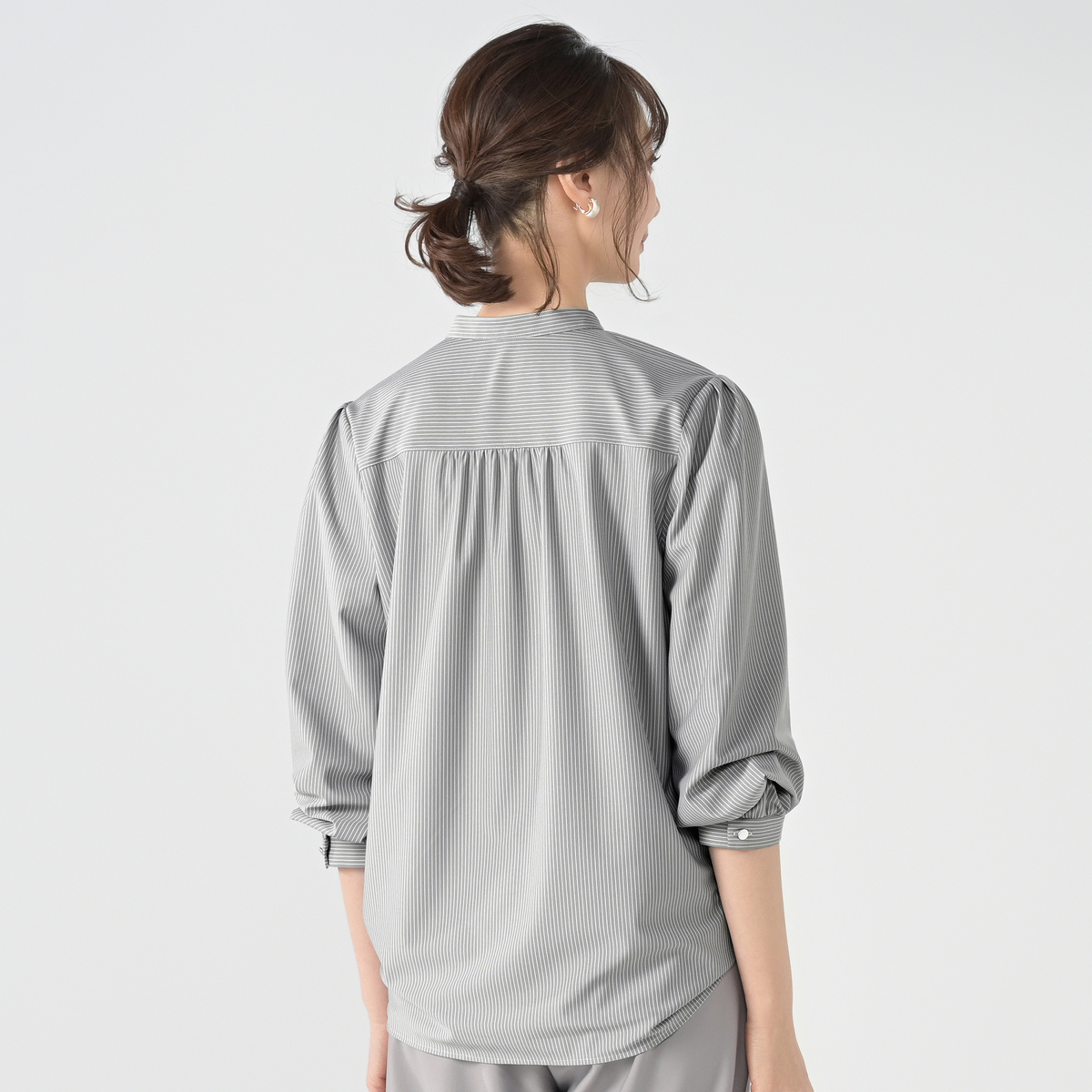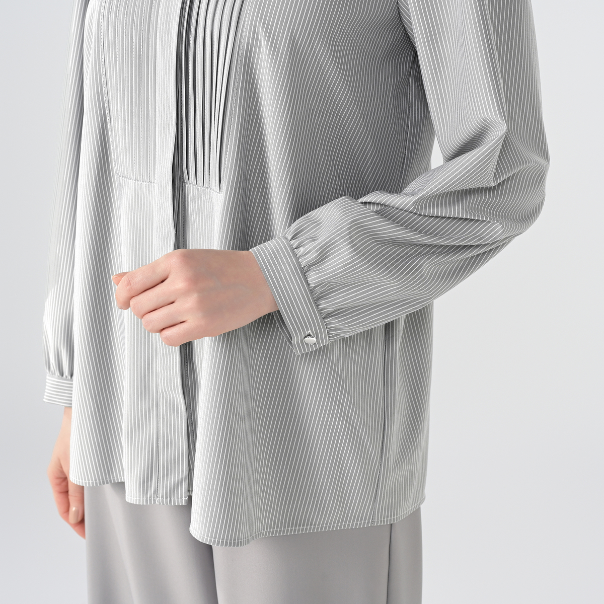 すっきりした印象を与えてくれるスタンド衿に、前身にはタックをあしらった仕立て。ブザムカラーにした、前開き仕様の比翼デザインです。ジャケットのインナーとしても1枚着としても重宝するブラウスです