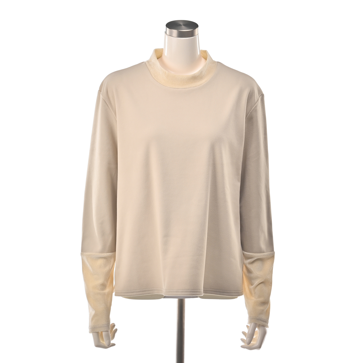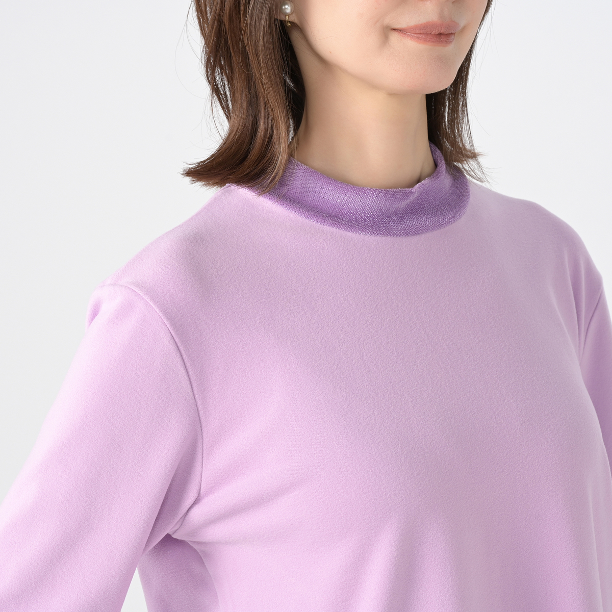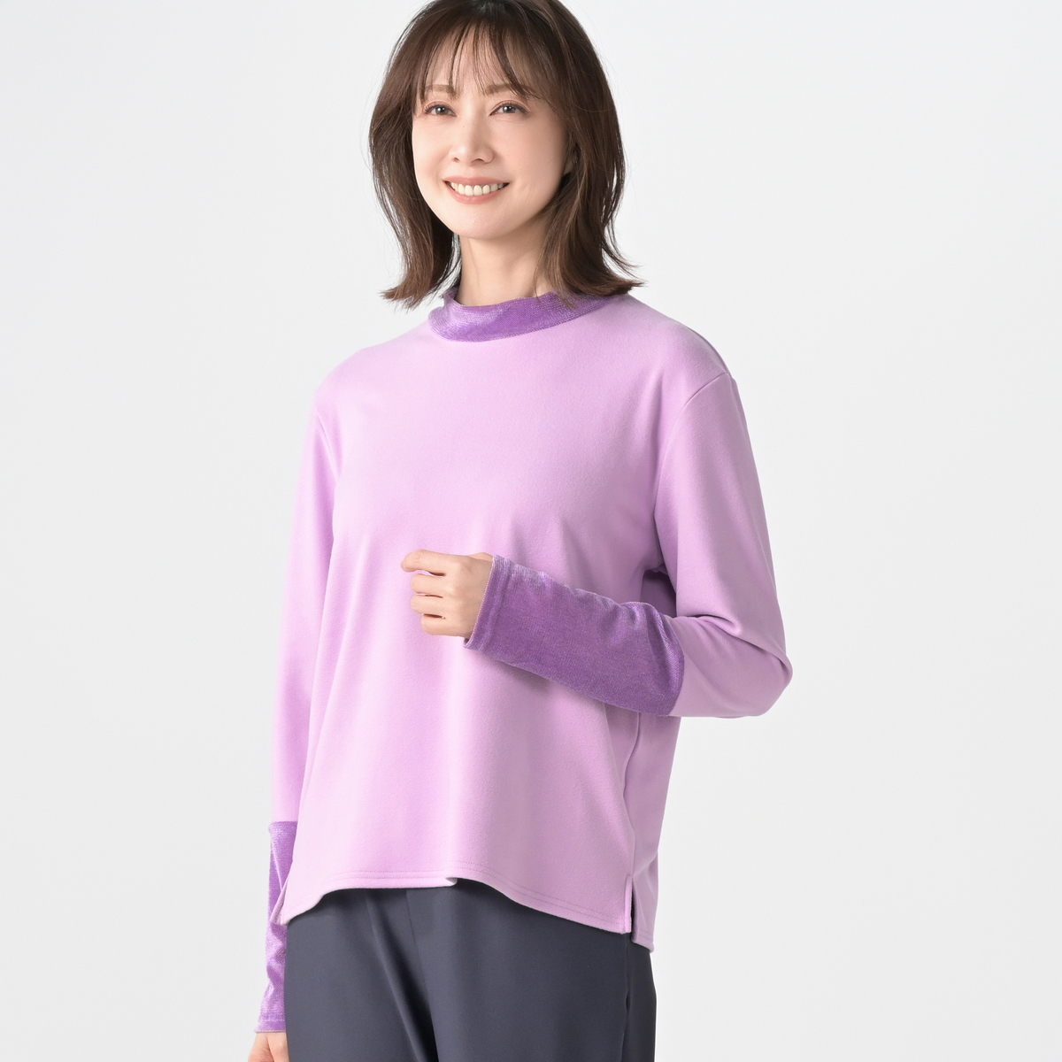 襟元と袖にチュールベロアを使用したカットソープルオーバー。襟元と袖先は透け感がありながらも表面を起毛させたチュールベロアを使用し、季節感とトレンド感のあるデザインです