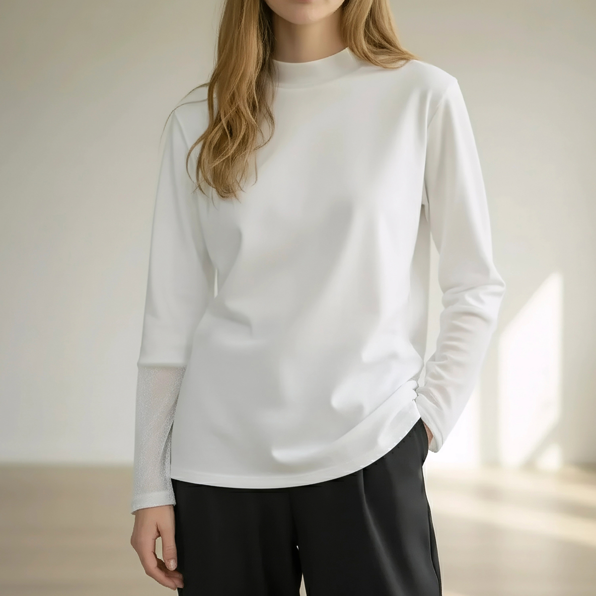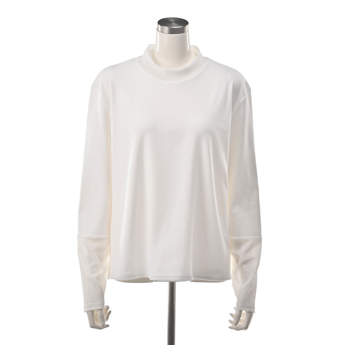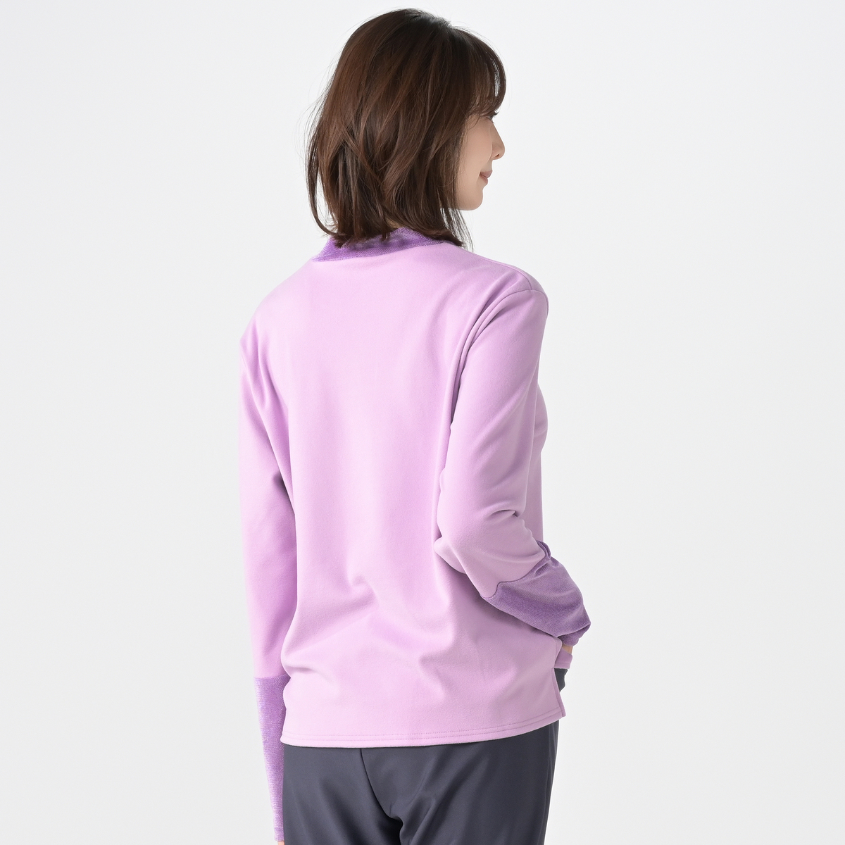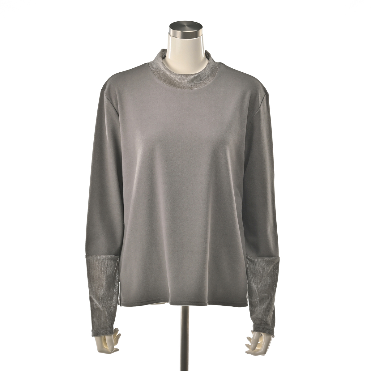 襟元と袖にチュールベロアを使用したカットソープルオーバー。襟元と袖先は透け感がありながらも表面を起毛させたチュールベロアを使用し、季節感とトレンド感のあるデザインです
