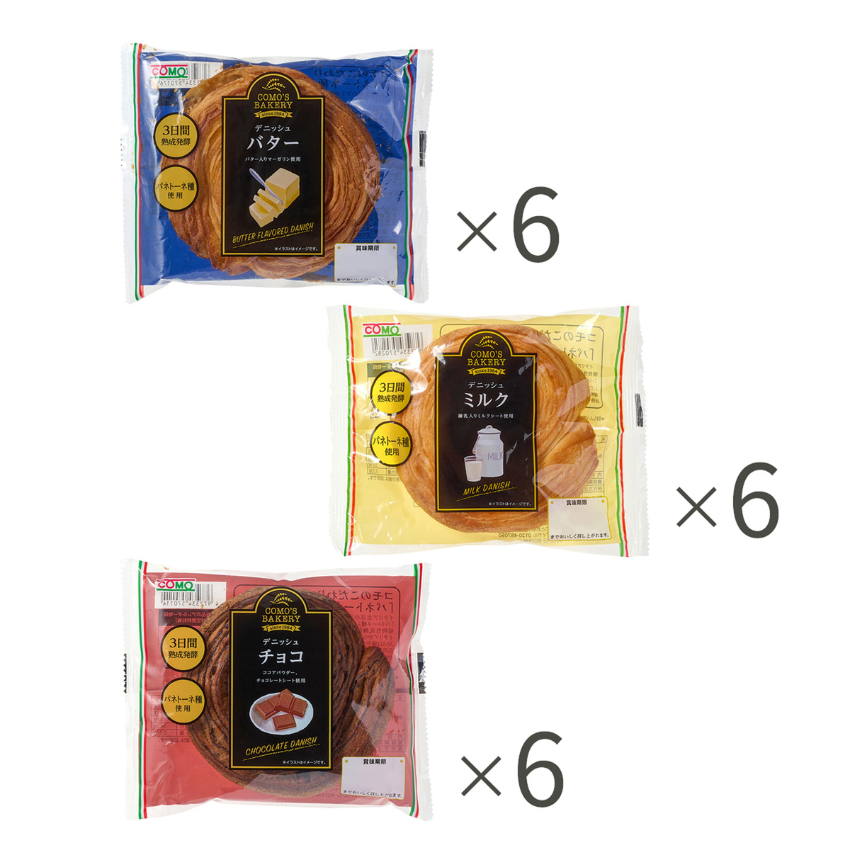 [アレルギー物質特定原材料8品目] 卵、小麦、乳 [セット内容] ・デニッシュバター ・デニッシュミルク ・デニッシュチョコ 各6個 計18袋 [賞味期間] 製造日より60日 [保存方法] 開封前:直射日光をさけて、常温で保存してください 開封後:開封後はお早めにお召し上がりください [お召し上がり方] そのままお召し上がりください [原料原産地] 小麦粉(国内製造) [原産国] 日本 [原材料] ■デニッシュバター: 小麦粉(国内製造)、砂糖、マーガリン、ショートニング、 バター入りマーガリン、パネトーネ種、卵、ぶどう糖、脱脂粉乳、野菜だし入り調味料(トマトエキス、ぶどう糖果糖液糖、食塩、マッシュルームエキス、野菜だし)、食塩、麦芽エキス、酵母/乳化剤、香料、着色料(カロテン)、(一部に小麦・卵・乳成分・大豆を含む) ■デニッシュミルク: 小麦粉(国内製造)、ミルクフラワーペースト、砂糖、 ショートニング、パネトーネ種、マーガリン、卵、ぶどう糖、全粉乳、脱脂粉乳、野菜だし入り調味料(トマトエキス、ぶどう糖果糖液糖、食塩、マッシュルームエキス、野菜だし)、食塩、麦芽エキス、酵母/加工デンプン、香料、乳化剤、増粘多糖類、 pH調整剤、着色料(カロテン)、(一部に小麦・卵・乳成分を含む) ■デニッシュチョコ: 小麦粉(国内製造)、チョコレートフラワーペースト、砂糖、 ショートニング、パネトーネ種、マーガリン、卵、ぶどう糖、ココアパウダー、脱脂粉乳、野菜だし入り調味料(トマトエキス、ぶどう糖果糖液糖、食塩、マッシュルームエキス、野菜だし)、食塩、麦芽エキス、酵母/加工デンプン、乳化剤、香料、pH調整剤、増粘多糖類、 着色料(カロテン)、(一部に小麦・卵・乳成分・大豆を含む)