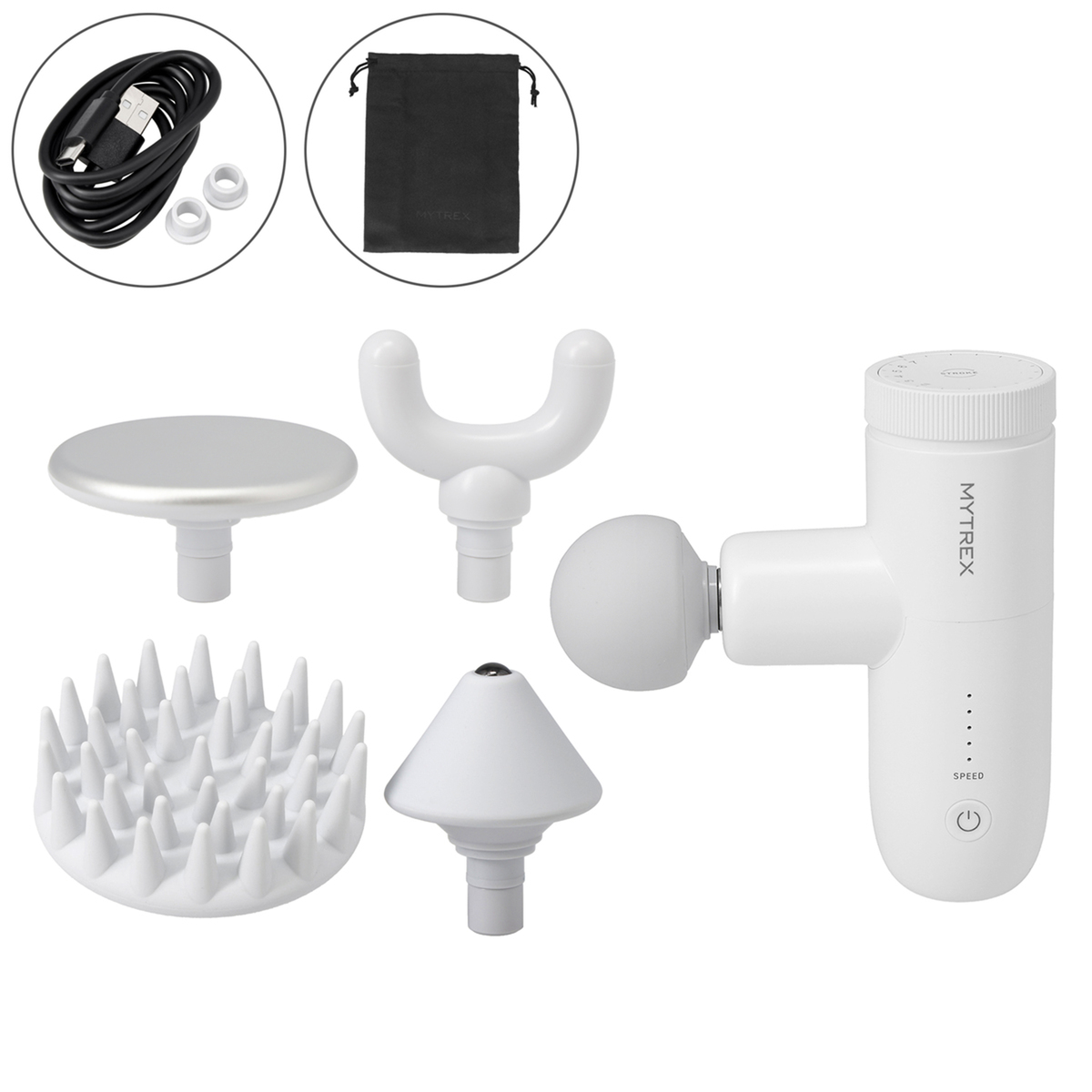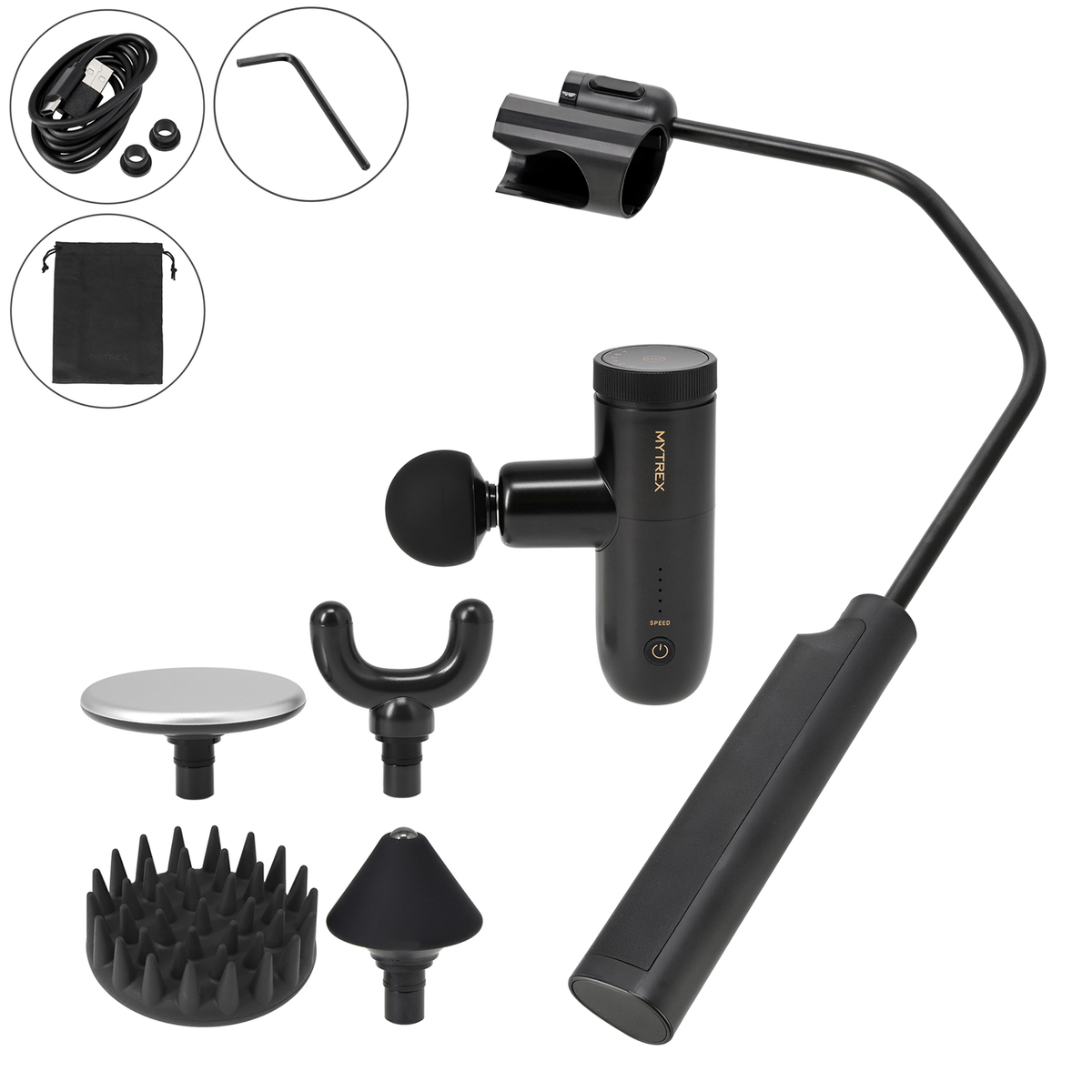 [サイズ] 約44.5×30×4.7cm(組立後) [重量] 約228g(組立後) [材質] ホルダー部:PC+ABS、POK、シリコン アーム部:アルミ グリップ部:TPU、PC+ABS [使用方法] 1.グリップ部とアーム部を固定する ・アーム部の先端がグリップ部のくぼみにあうように差し込みます ・付属のネジを穴に入れ、六角棒レンチでしっかりと固定します 2.ホルダー部をアーム部に取り付ける ※カチッというまでスライドしながら差し込んで下さい <REBIVE MINI XS 2本体(別売り)の取り付けかた> ・REBIVE MINI XS 2 本体をホルダー部に挿し込む ※止まるまで押し込みます ※手指を挟まないように十分にご注意下さい ※必要以上に強く押さないで下さい。本体およびバックケアアームが破損するおそれがあります [お手入れ] ・汚れた場合は、乾いたやわらかい布で拭き取って下さい。汚れが気になる場合は、ぬるま湯で希釈した中性洗剤に柔らかい布をひたし、よくしぼってから本体表面の汚れを丁寧に拭き取って下さい ・アルコール・シンナー・ベンジンなどの溶剤は使用しないで下さい。故障や部品の割れ、変色などの原因になります [注意事項] ※力を入れすぎると、アームが破損する場合がありますのでご注意下さい ※ご使用時は周囲にぶつからないように十分ご注意下さい。子供の手の届くところで使用、保管しないで下さい ■取り扱い説明を充分にご確認の上、ご使用下さい 【中国製】 [セット内容] <MYTREX REBIVE MINI[リバイブ ミニ] XS2> ・本体 ・アタッチメント×5 ・充電用USBコード (TypeーC) ・携帯用布袋 ・アタッチメント用ストッパーゴム(予備)×2 ※ACアダプターは付属しません ※充電には「5V/2A」のものをお使いください。2A未満の場合充電に時間がかかる場合があります <リバイブミニ XS2専用 バックケアアーム> ・ホルダー部 ・アーム部 ・グリップ部 ・六角棒レンチ ・ネジ(予備用:1個含む)2個 ※組み立て式 [使用方法] <充電方法> 1.本体底面の充電ポートに、付属の充電用USBコードのType Cコネクター側を接続する 2.USBコードのTypeCコネクター側をお手持ちのACアダプター等のUSBポートに接続する 3.充電完了になったら、USBケーブルを取りはずす <使用方法> 1.電源がオフになっていることを確認して、アタッチメントを取り付ける 2.電源/スピード調整ボタンを長押し(約3〜5秒)して電源をオンにする 3.電源ボタンを押して、振動スピードを選ぶ 4.本体上部のストローク調整ダイヤルを回して、ストロークを選ぶ 5.ハンドル部分をしっかりと手で持ち、肌に軽く当てて使用する 6.使用中に振動を停止するには、電源ボタンを長押し(約3〜5秒)する ※使い始めから10分経つと、自動的に振動が停止します 7.使用後、アタッチメントを取りはずす [お手入れ] ・本体、アタッチメント、およびUSBコードは絶対に水洗いしないで下さい(スカルプ拡張アタッチメントのみ水洗い可) ・アルコール・シンナー・ベンジンなどの溶剤は使用しないで下さい