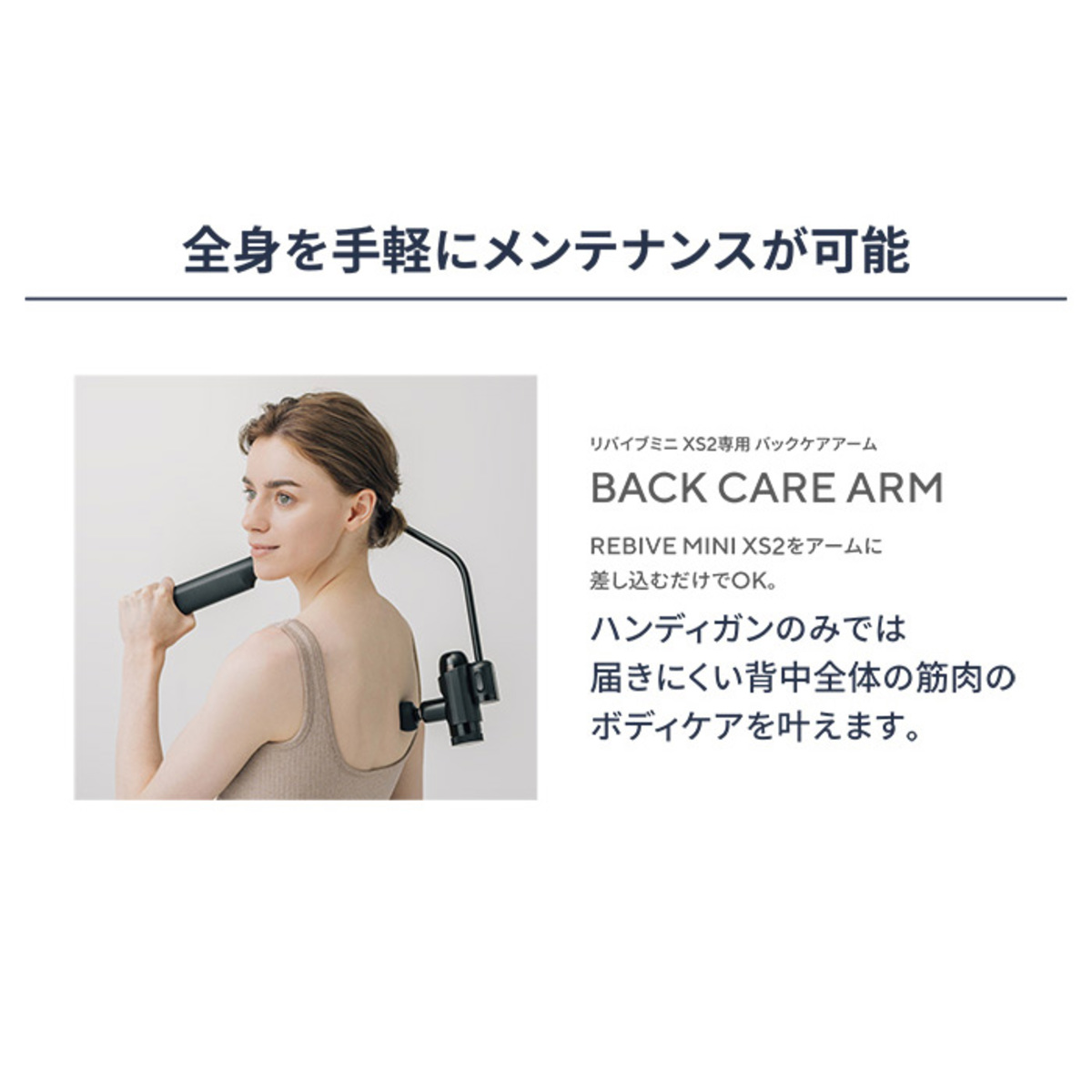 REBIVE MINI XS2をアームに差し込むだけで、使い方も簡単な専用のバックケアアームです
