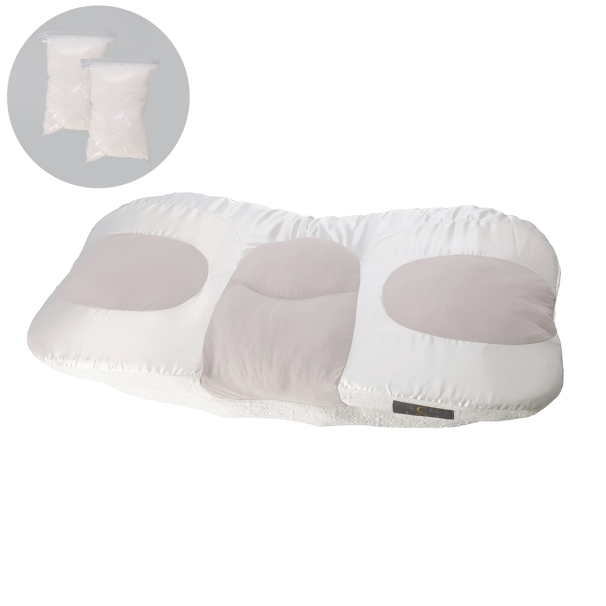 後頭部から首を支える部分と横寝時の側頭部が当たるクッション部分(グレーカラーの部分)には粒わたを採用。粒わたも調節可能で、補充用の粒わたが付属しています