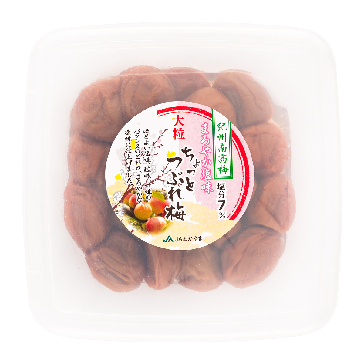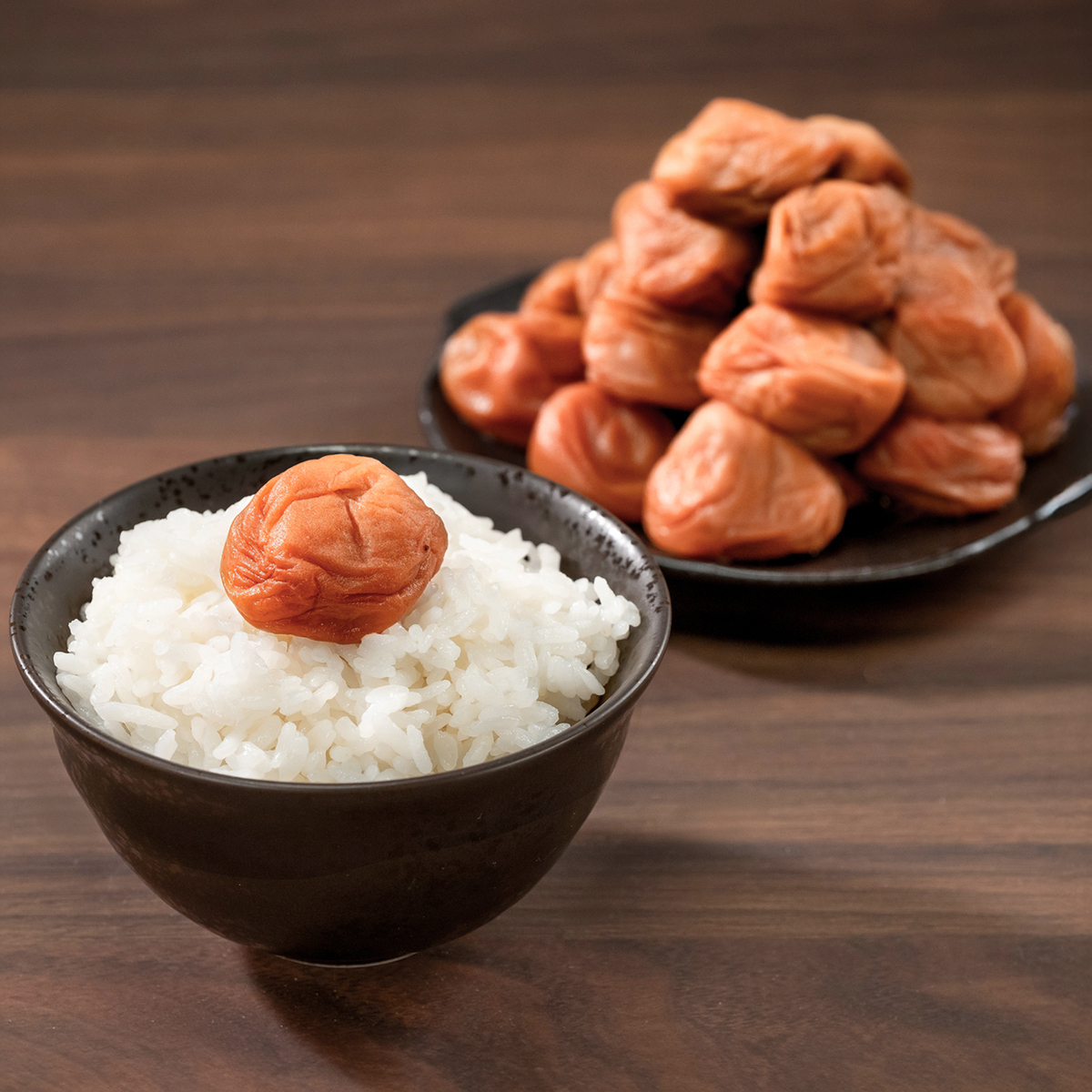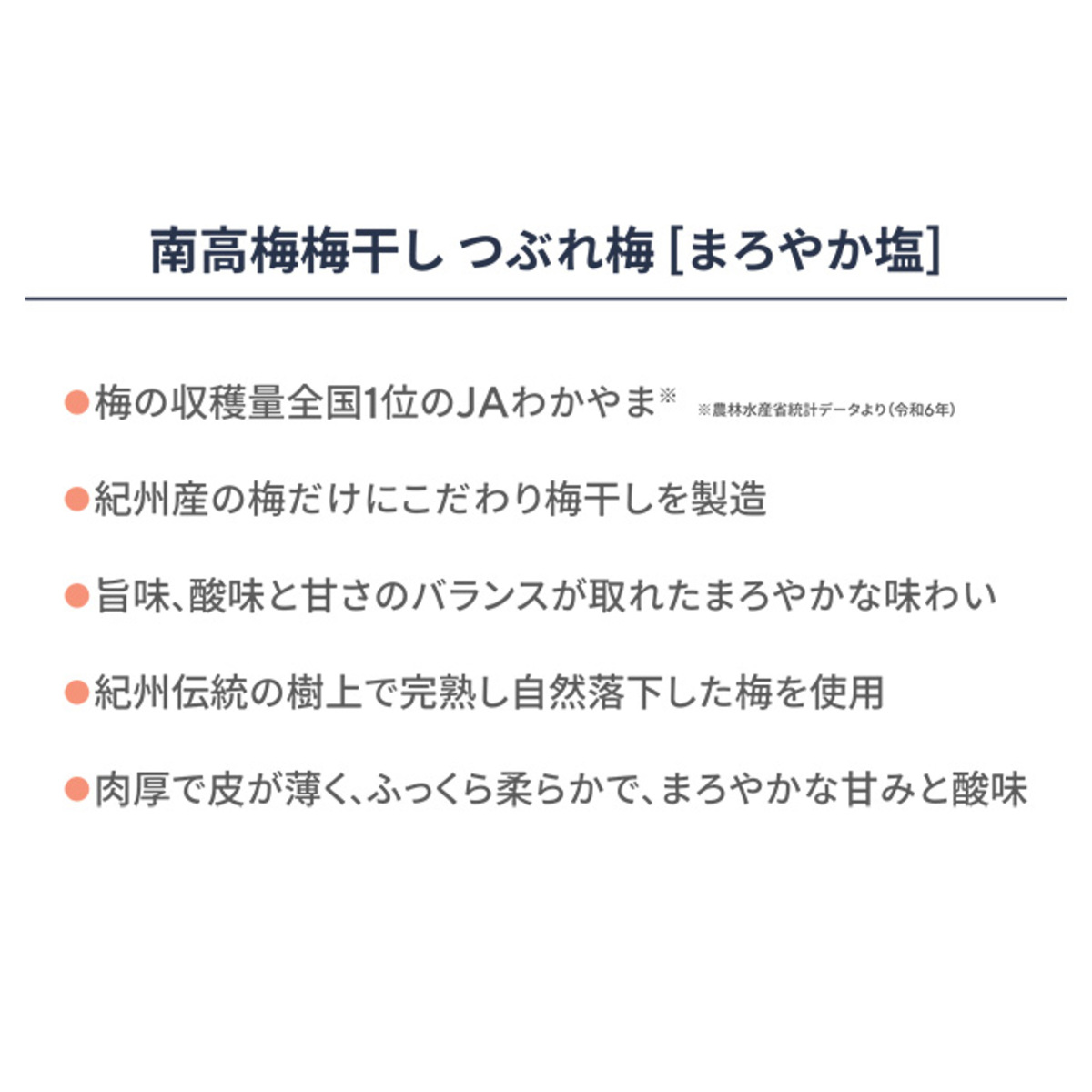 紀州産の肉厚で皮が薄い南高梅を使い、樹上で完熟し自然落下した梅を使用。ふっくらとやわらかく、まろやかな甘みと酸味が充実したおいしい梅干しです。可食部100gあたり塩分約7%のまろやかな味わいをお楽しみいただけます