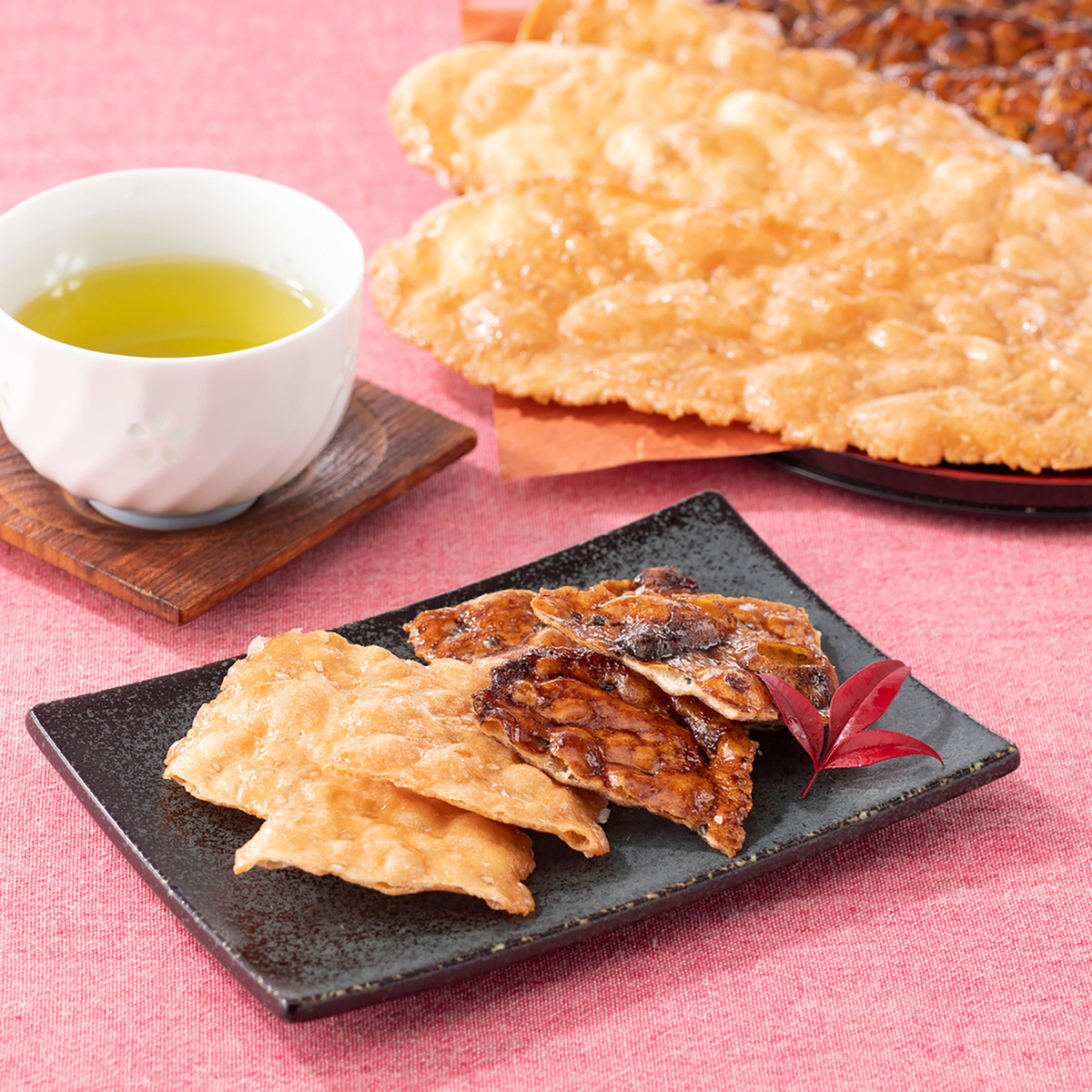 わらじのように薄く大きくのばした、板状かりんとう。大判の形に成形し、油で揚げて香ばしくカリッとした食感に仕上げています。コクのある黒蜜と、上品な白蜜を詰合せました