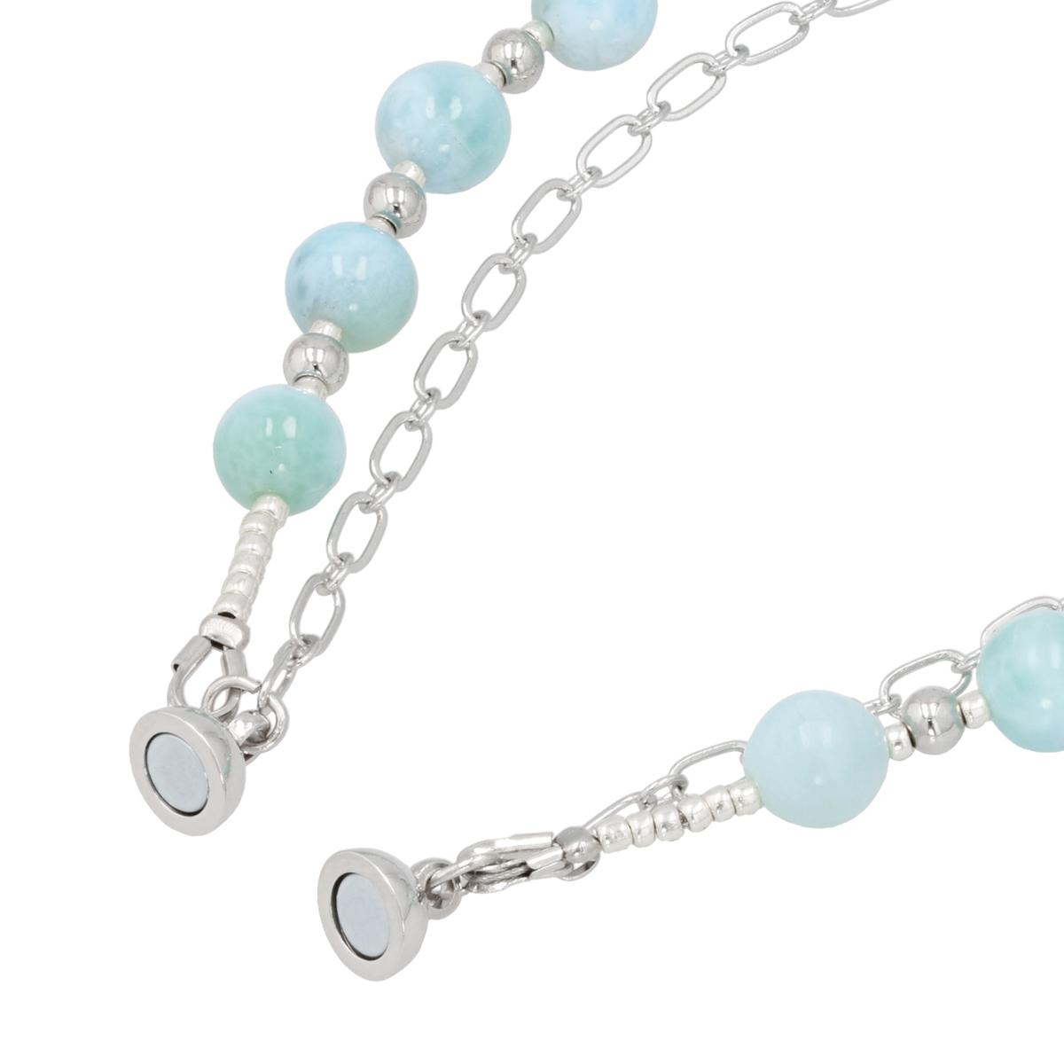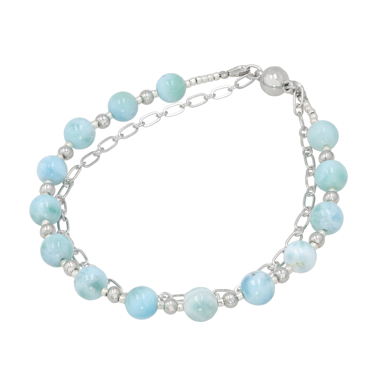 澄んだブルーが美しいラリマーに、繊細にきらめくチェーンを組合せたブレスレット。重ね着けしているような2連のデザインが手元をおしゃれに演出します