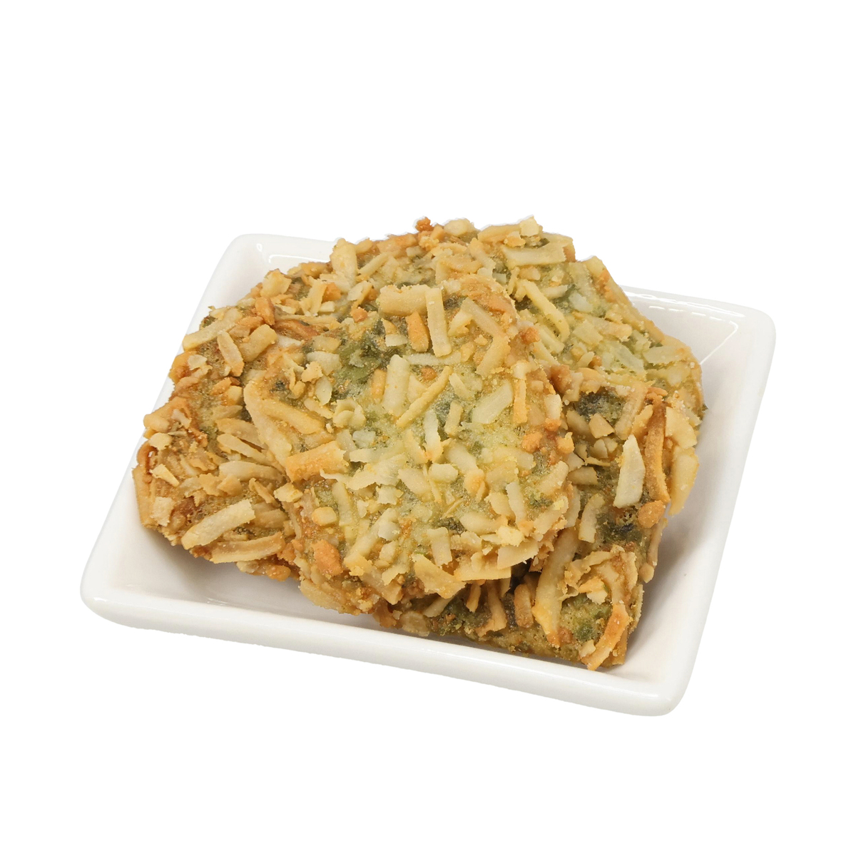城咲仁さん監修。揚げずに焼き上げるノンフライ製法。米粉を原料に使用。オーブンで焼き上げたヘルシー豆腐クランチです