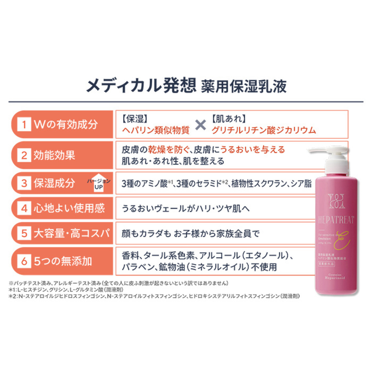 有効成分としてヘパリン類似物質とグリチルリチン酸ジカリウムを配合した薬用保湿乳液です。乾燥や肌あれなどの様々な肌悩みの解決や、肌を潤し、整えることで見違えるような肌印象を目指します