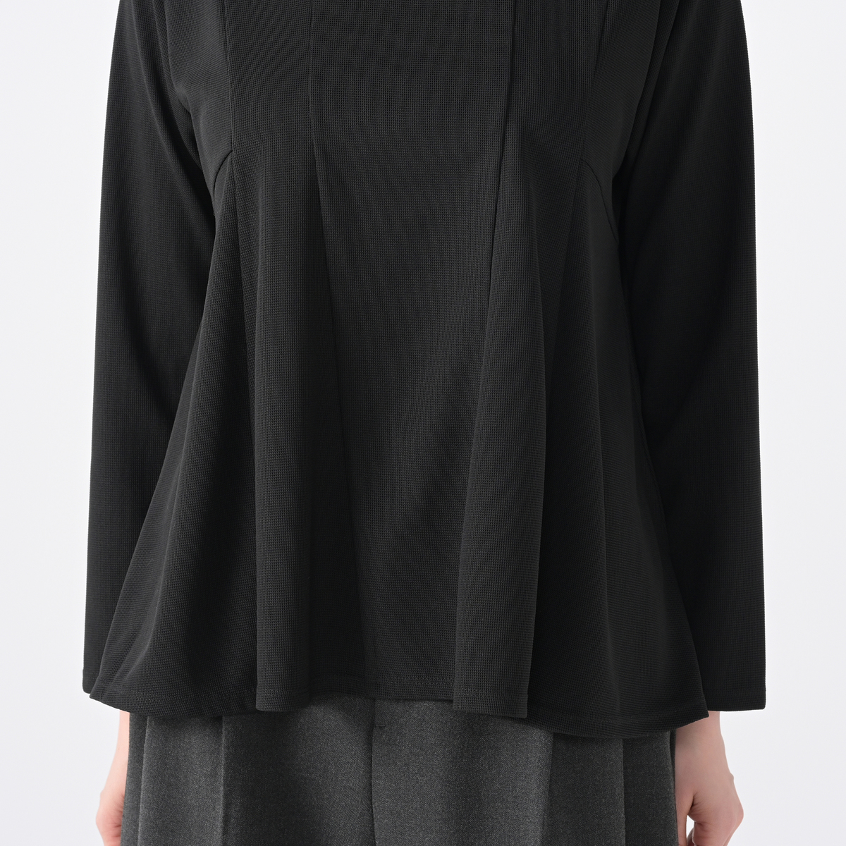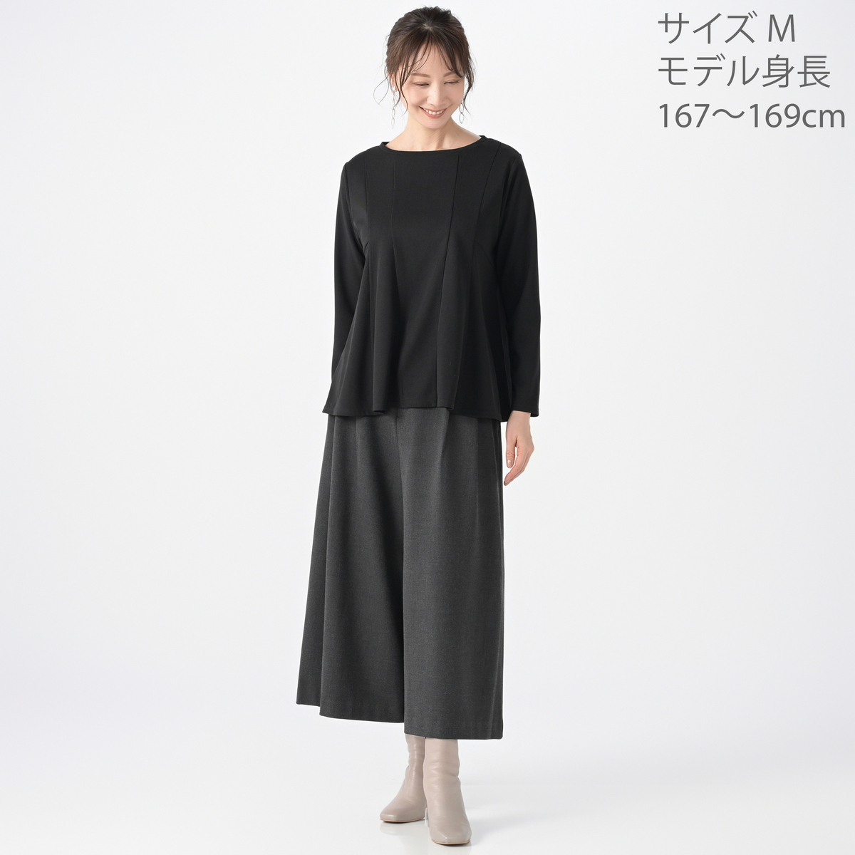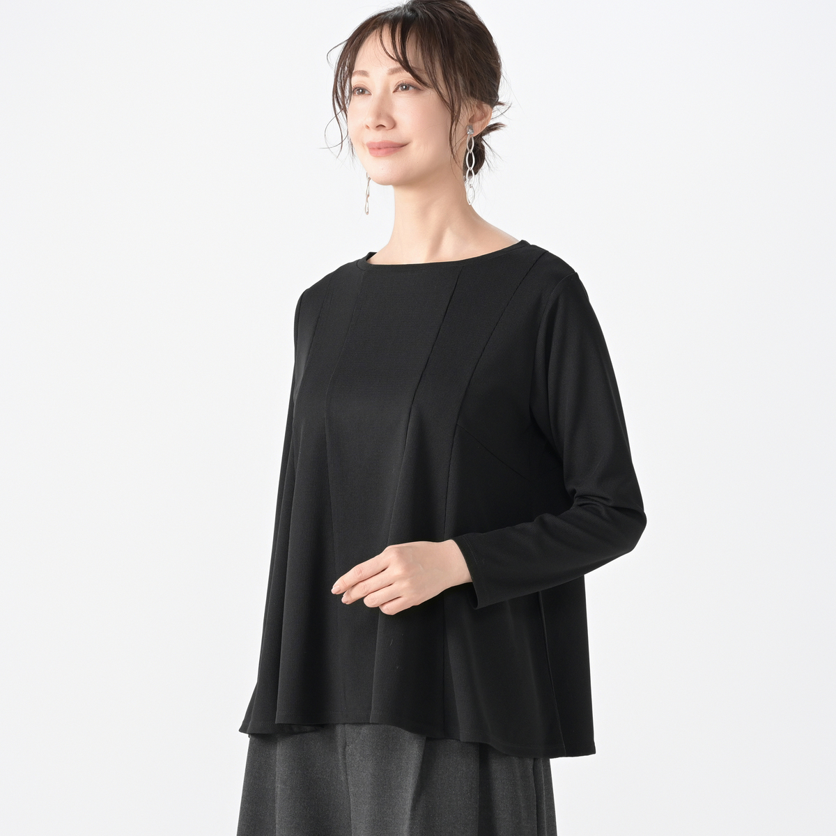 ふわっと広がるフレアシルエットのプルオーバー。ボリューム感があり、お腹やヒップを自然にカバーしてくれます