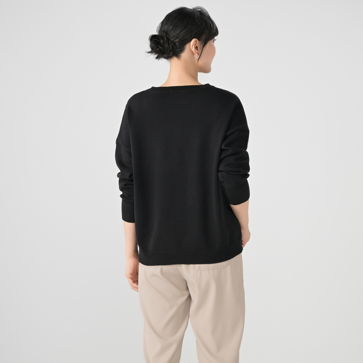 柔らかくもちもちとした糸を使用した肌触りの良いニット。程よい肉感で身体のラインを拾いにくくなっています