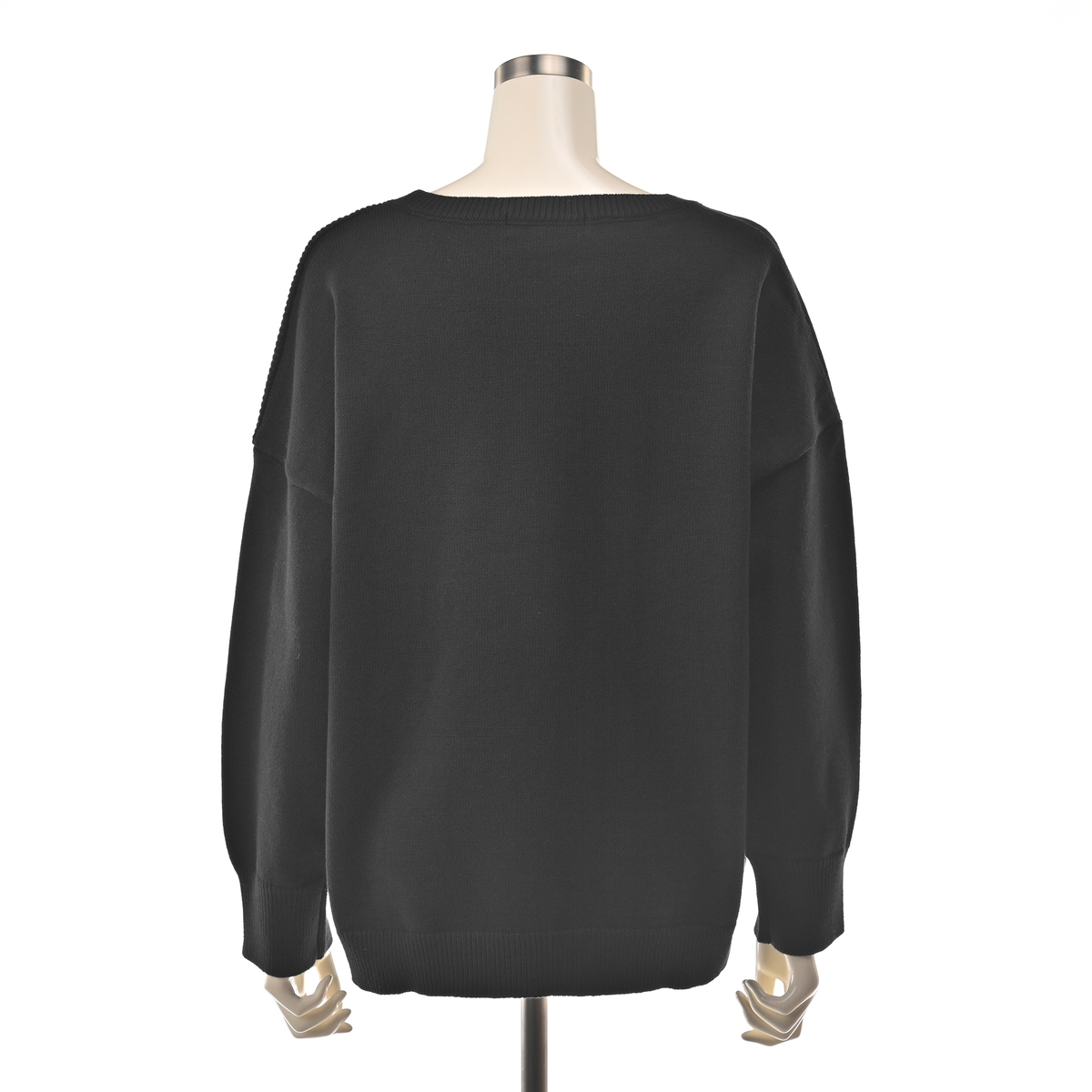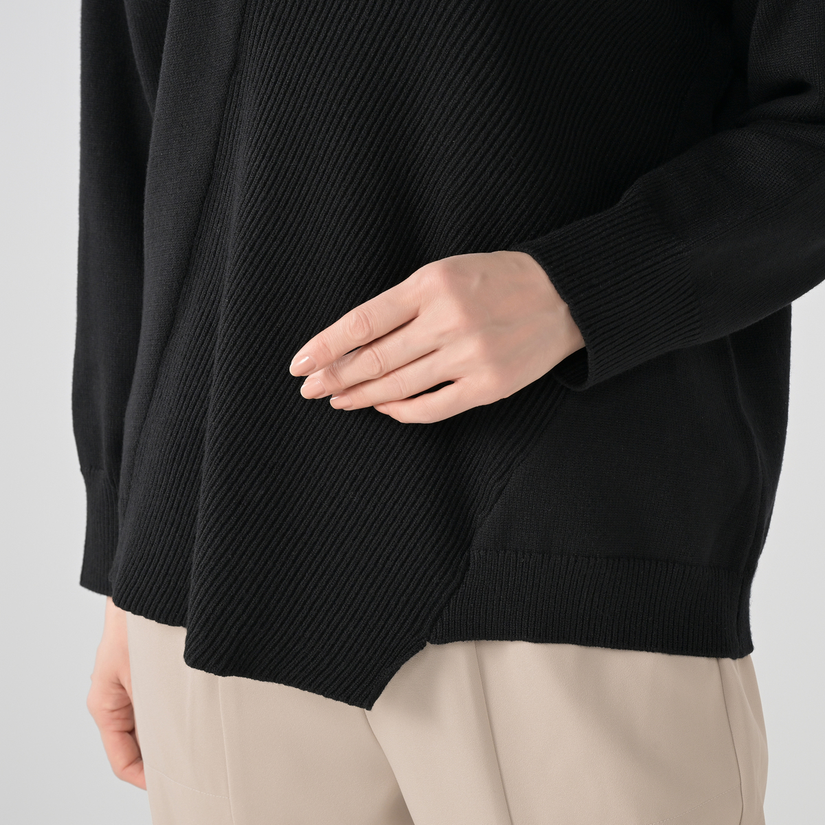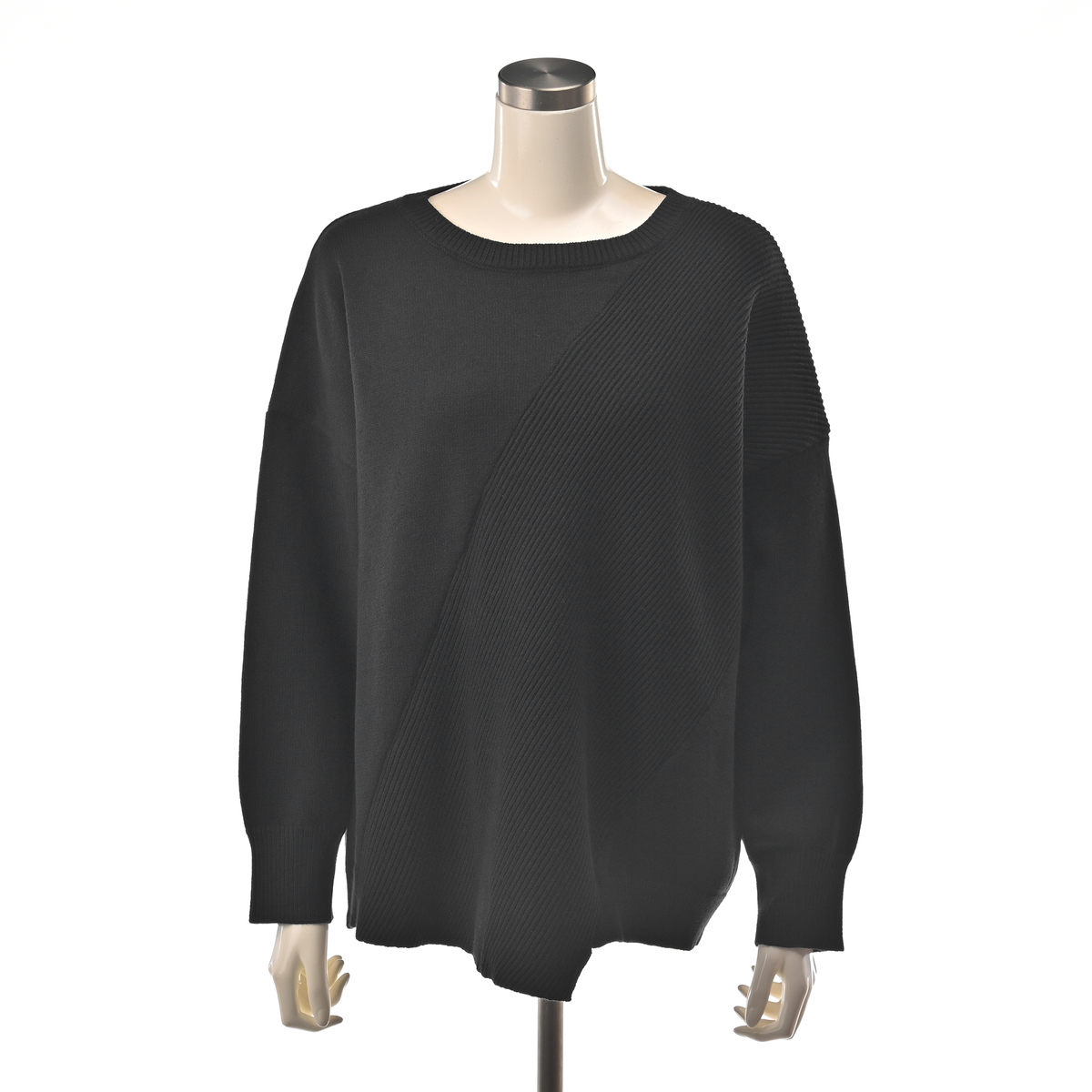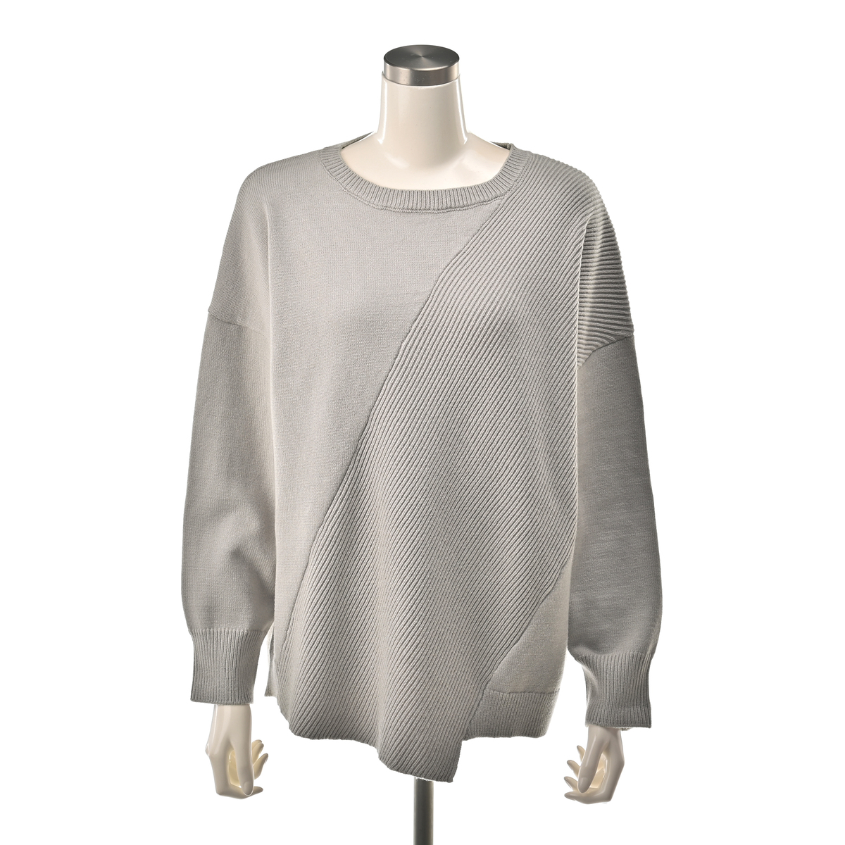 大胆な斜めの切替が目を惹くニットプルオーバー。太幅のリブ編みがアクセントになり、動きのある表情を作ります