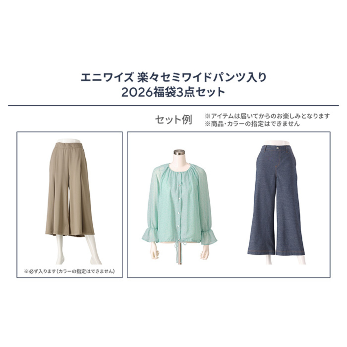 エニワイズの商品が3点入った福袋。セミワイドパンツと、何が届くかお楽しみのファッションアイテム2点を加えた3点セットです