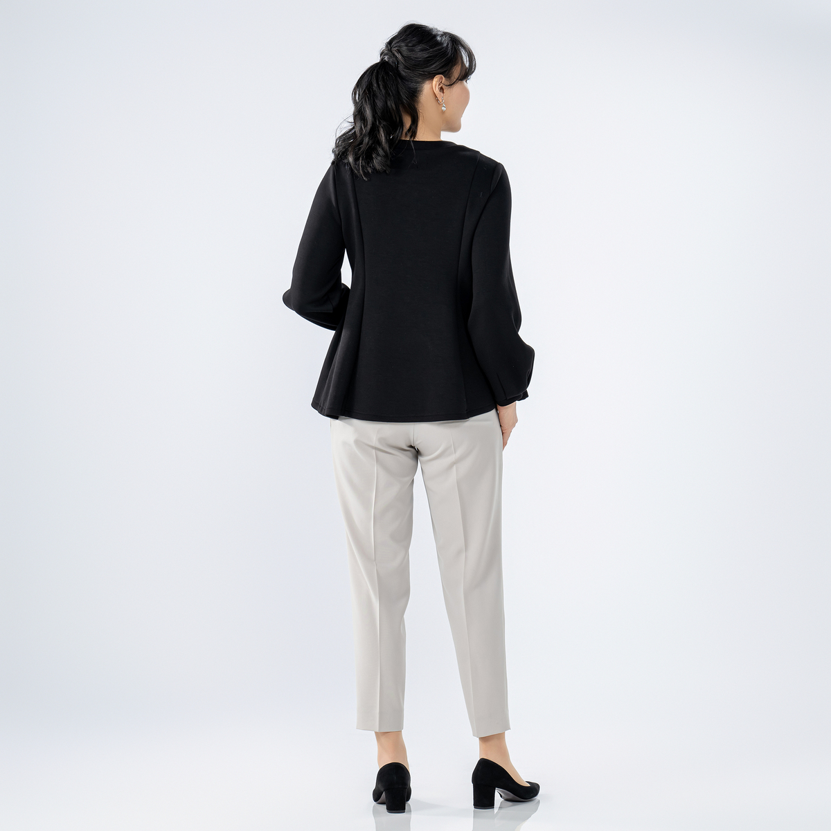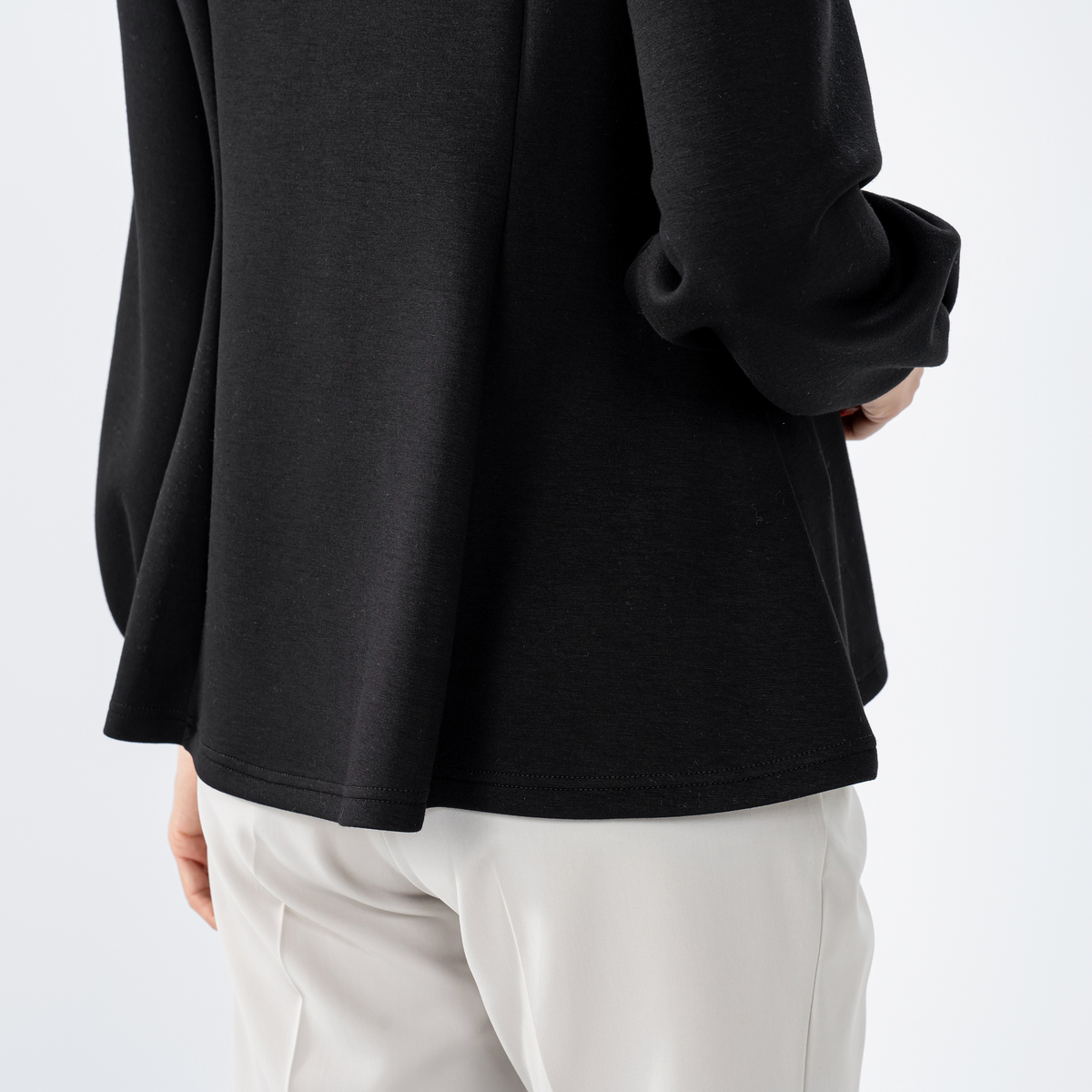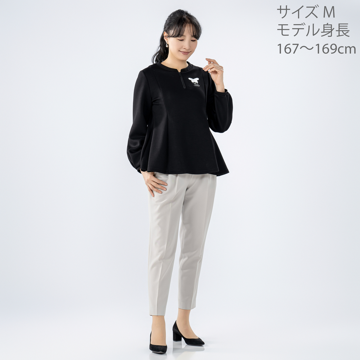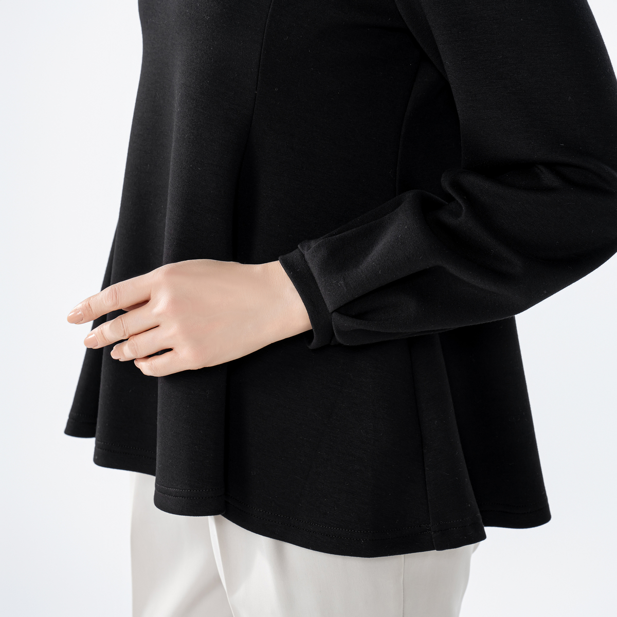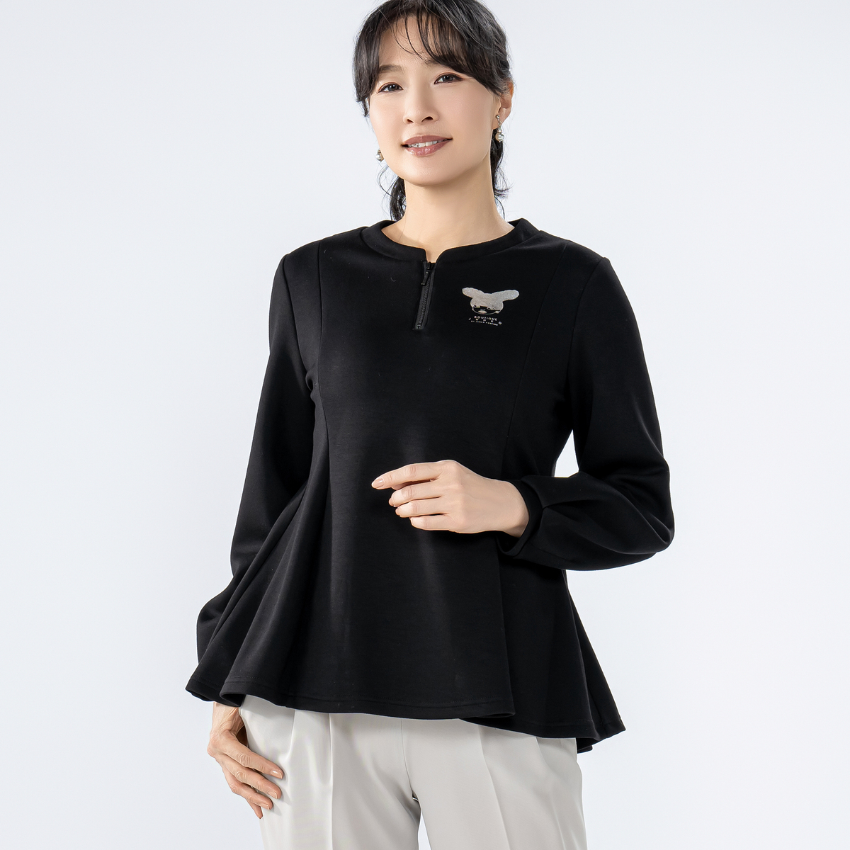 やわらかな風合いで軽やかなダンボールニットを使用したペプラムプルオーバー。程よいペプラムの広がりが甘さを抑えつつ、大人仕様で上品な印象を与えます