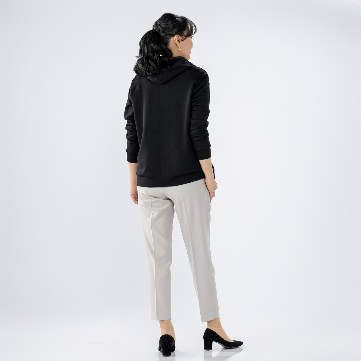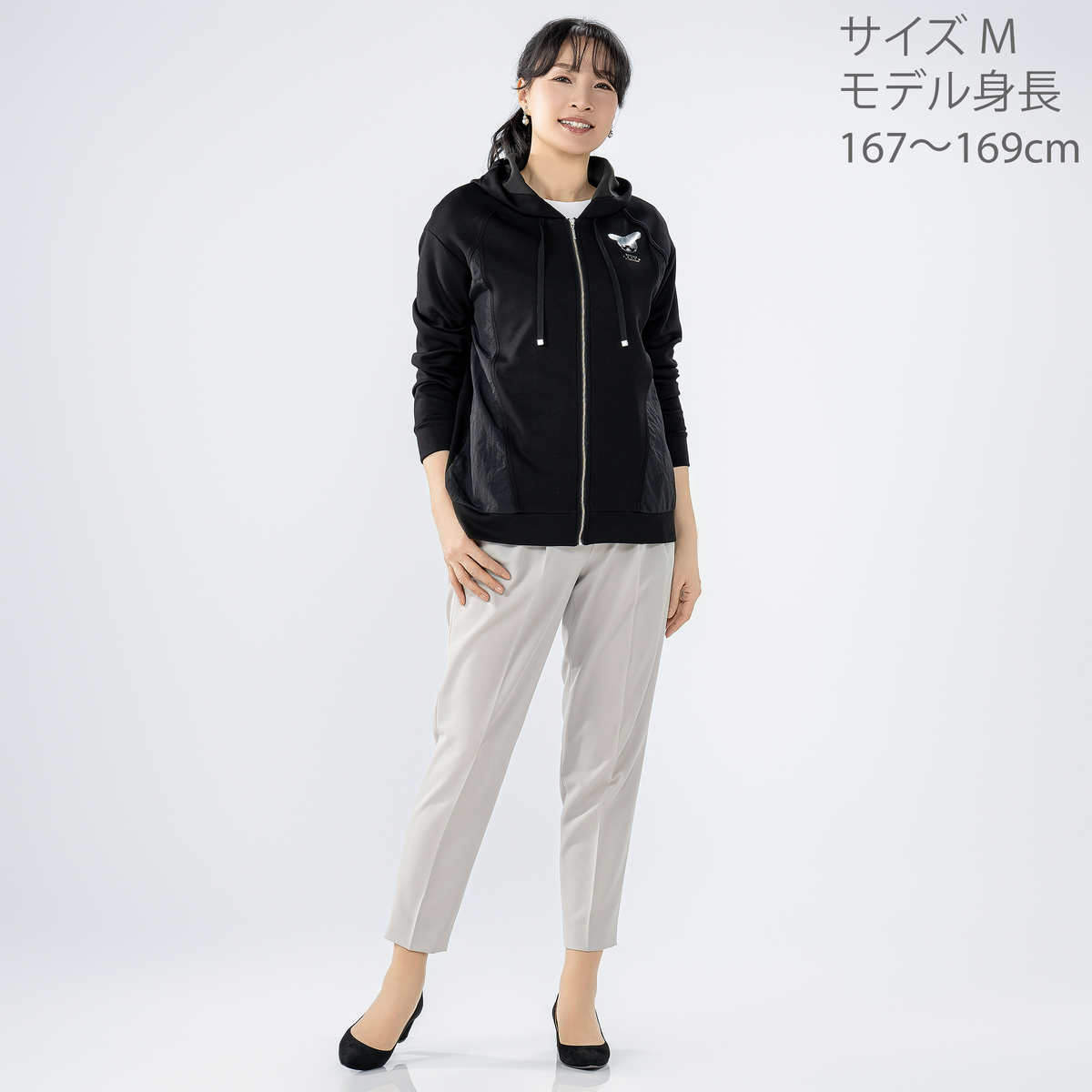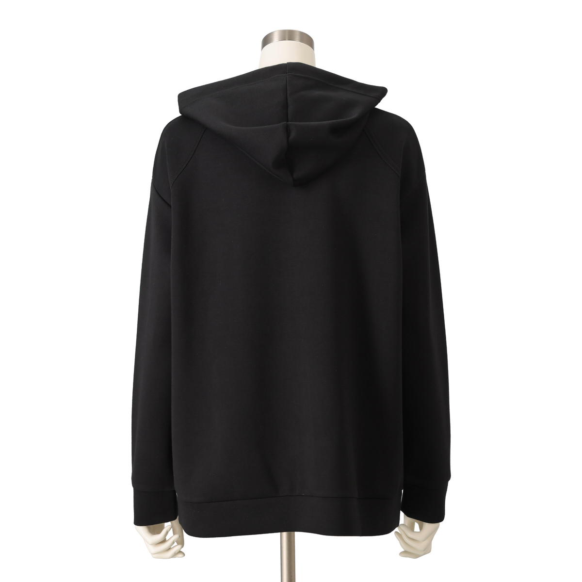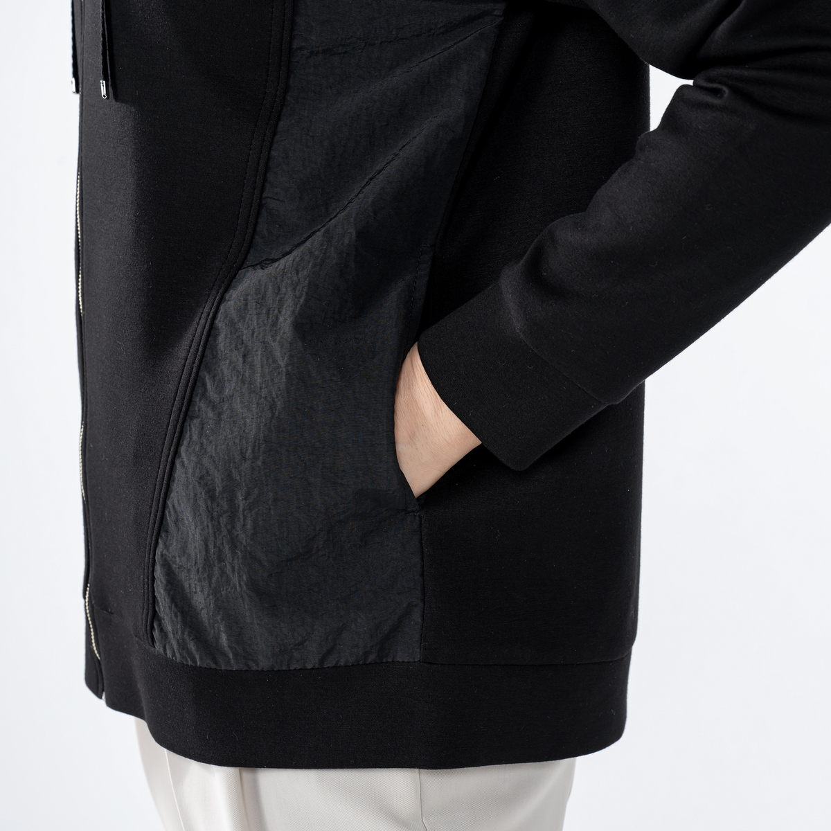 軽くてやわらかいダンボールニットを使用した、ジップアップパーカー。異素材で切替えを入れたシルエットです