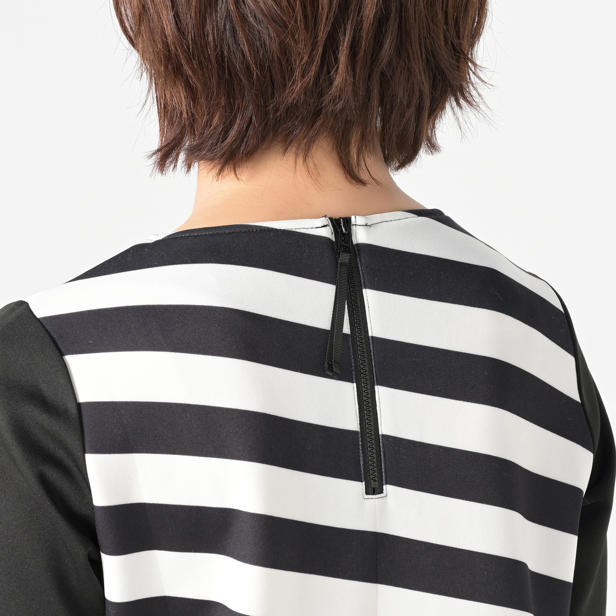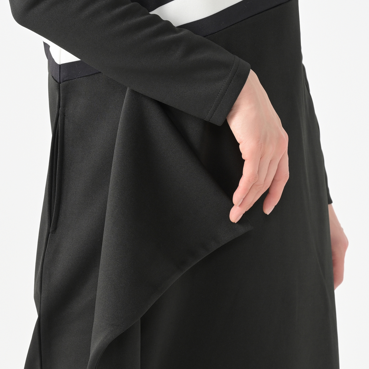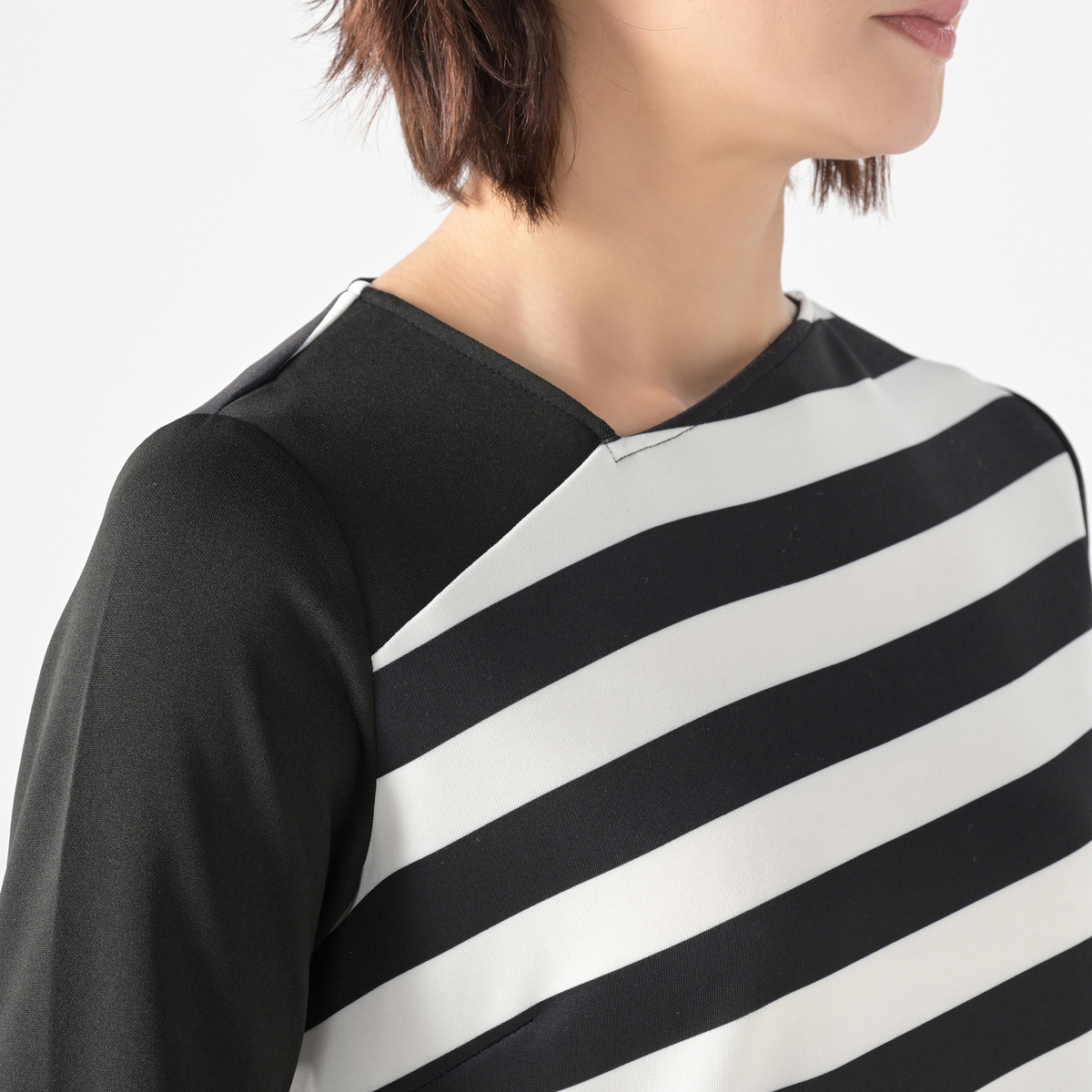 アートの躍動をまとえるアシンメトリープリントワンピース。世界的デザイナー、コシノジュンコさんによるセカンドラインらしく、デザインボーダーを大胆に配し、幾何学的な裁断とドレープが奥行きある表情を生み出します。着る人の動きに寄り添いながら、自然とニュアンスのあるシルエットへ導く、デザイン性の高い一枚です