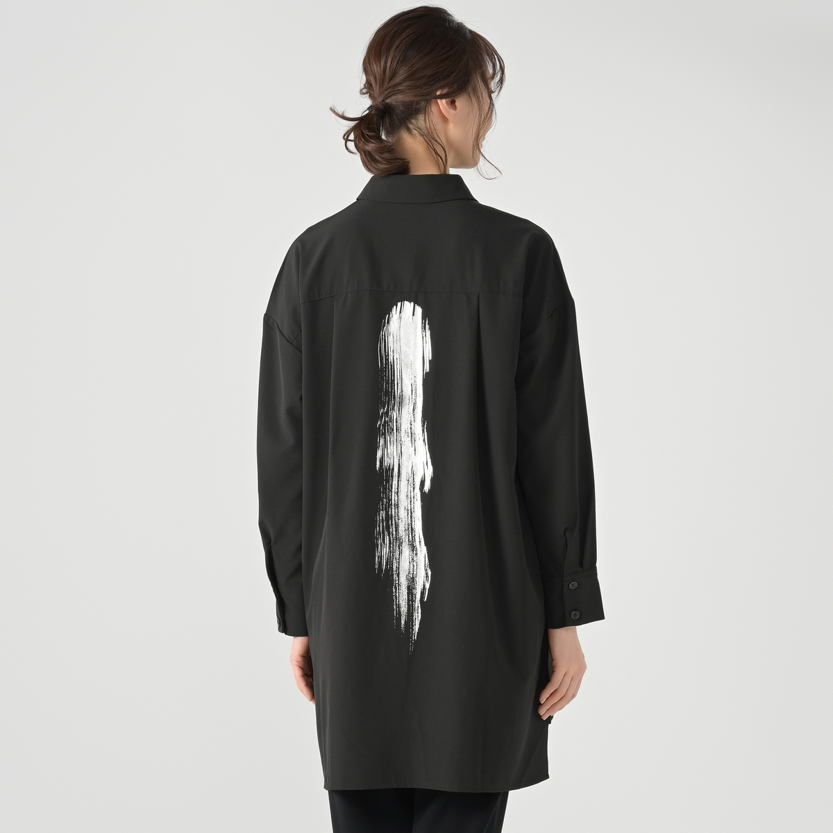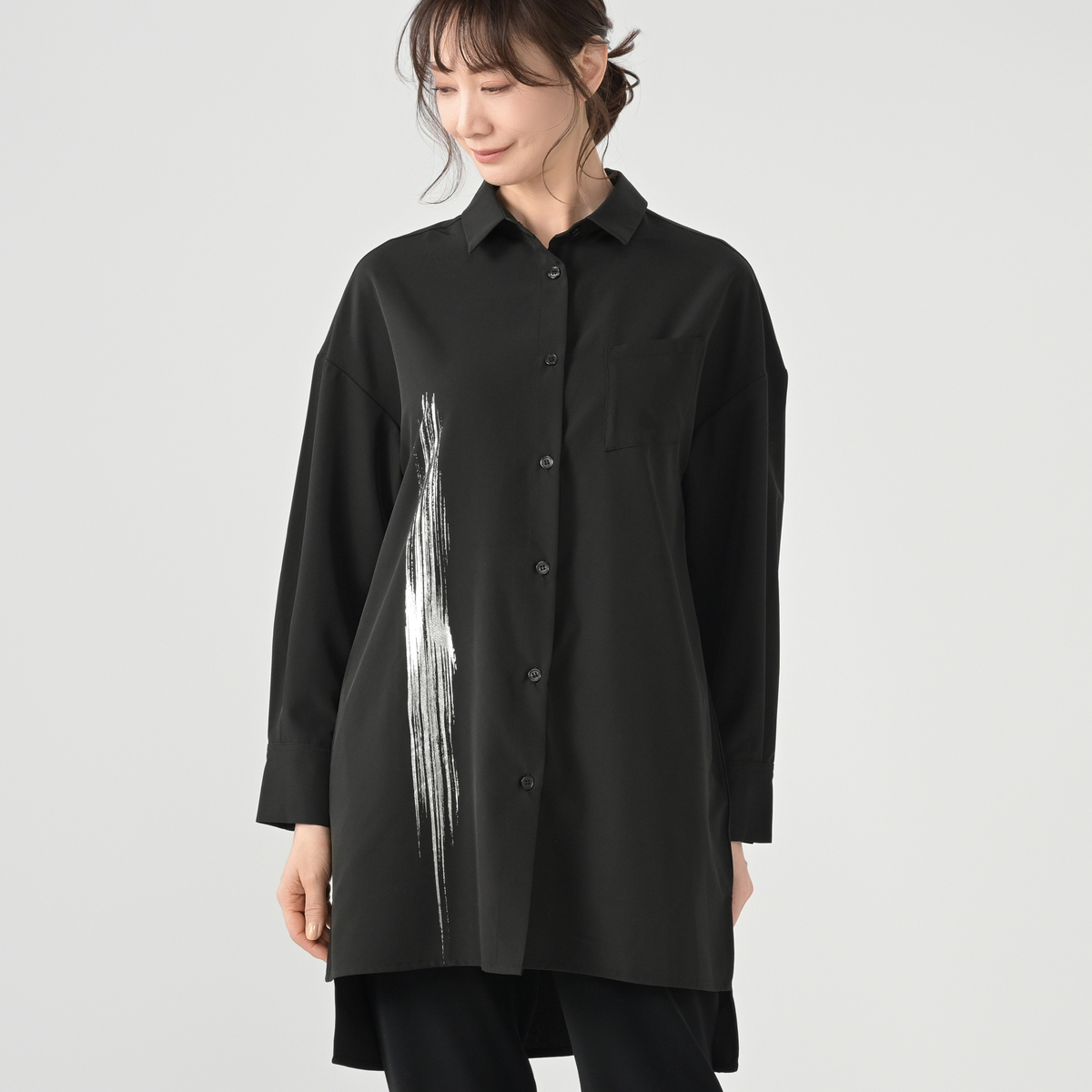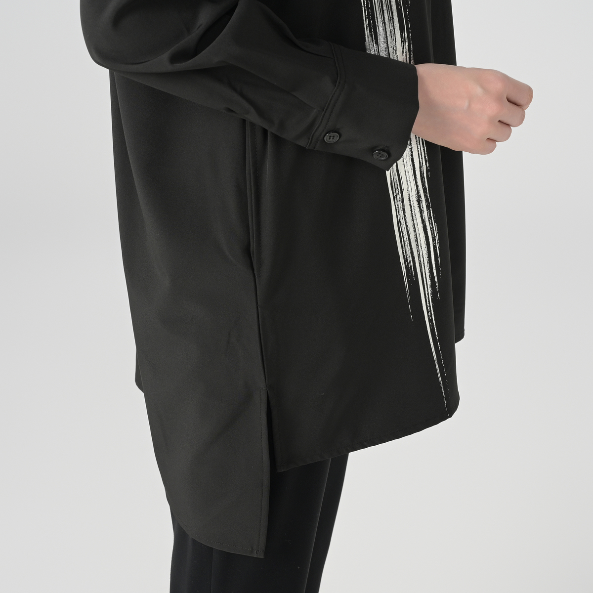 躍動感のある筆のラインが存在感を放つ特別なシャツ。シンプルなボディにコシノジュンコさんのアートワークを大胆にのせ、動きのあるラインが奥行きのある表情をつくります。左胸と両脇のポケット、スリット入りで機能面も備えた一枚です