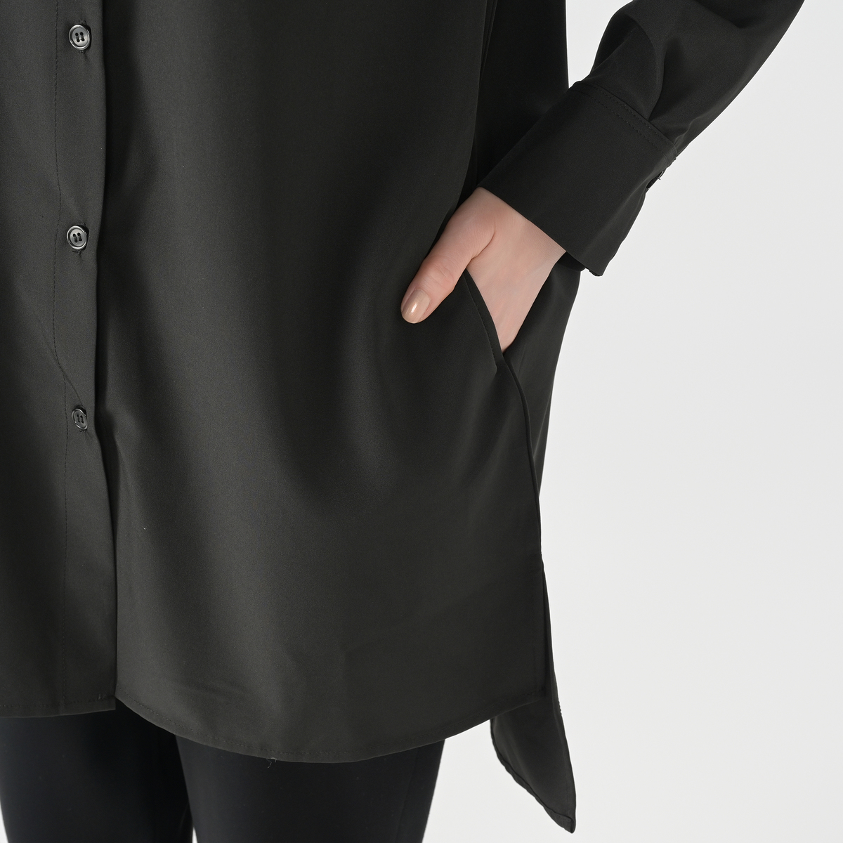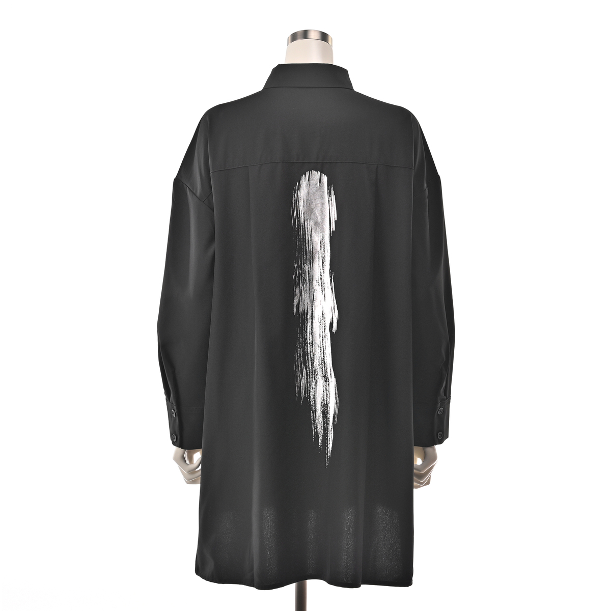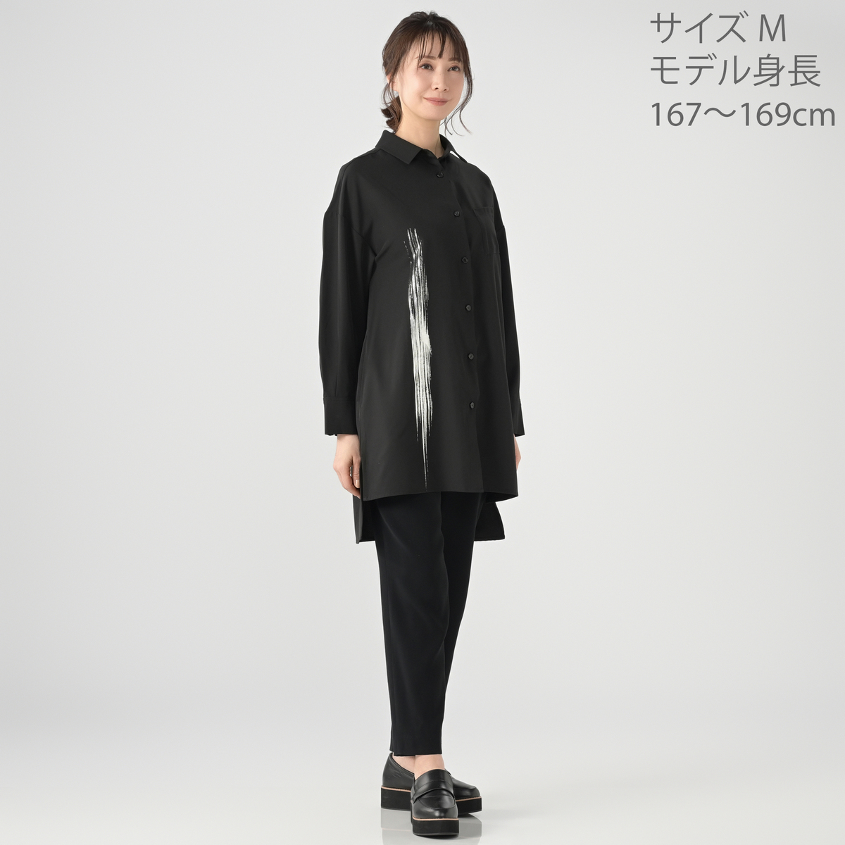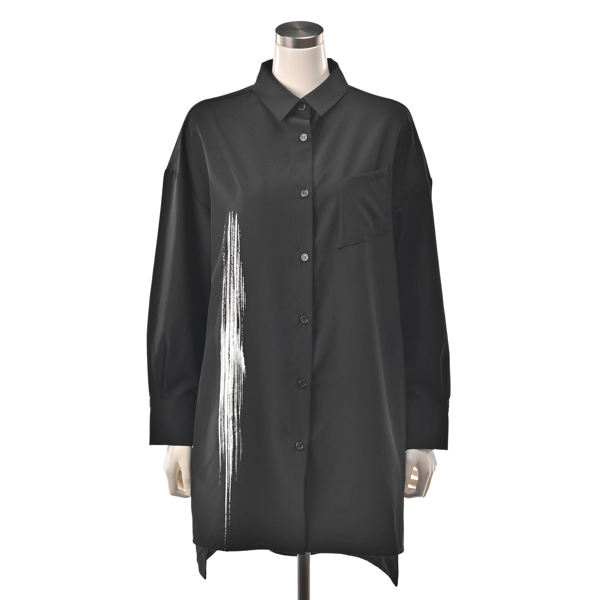 躍動感のある筆のラインが存在感を放つ特別なシャツ。シンプルなボディにコシノジュンコさんのアートワークを大胆にのせ、動きのあるラインが奥行きのある表情をつくります。左胸と両脇のポケット、スリット入りで機能面も備えた一枚です