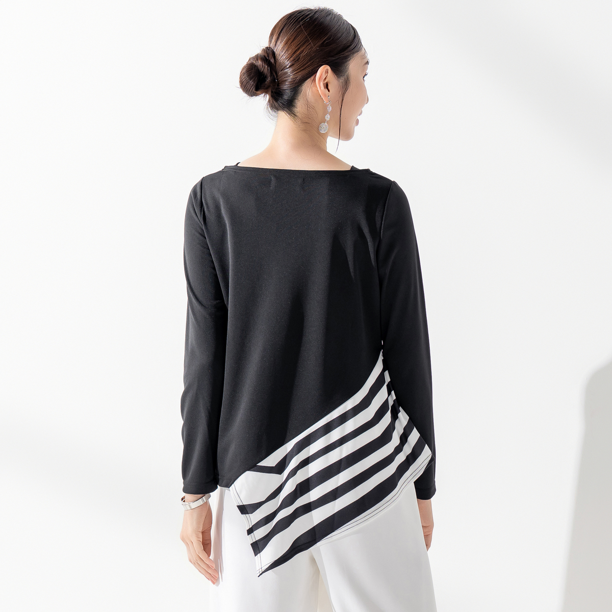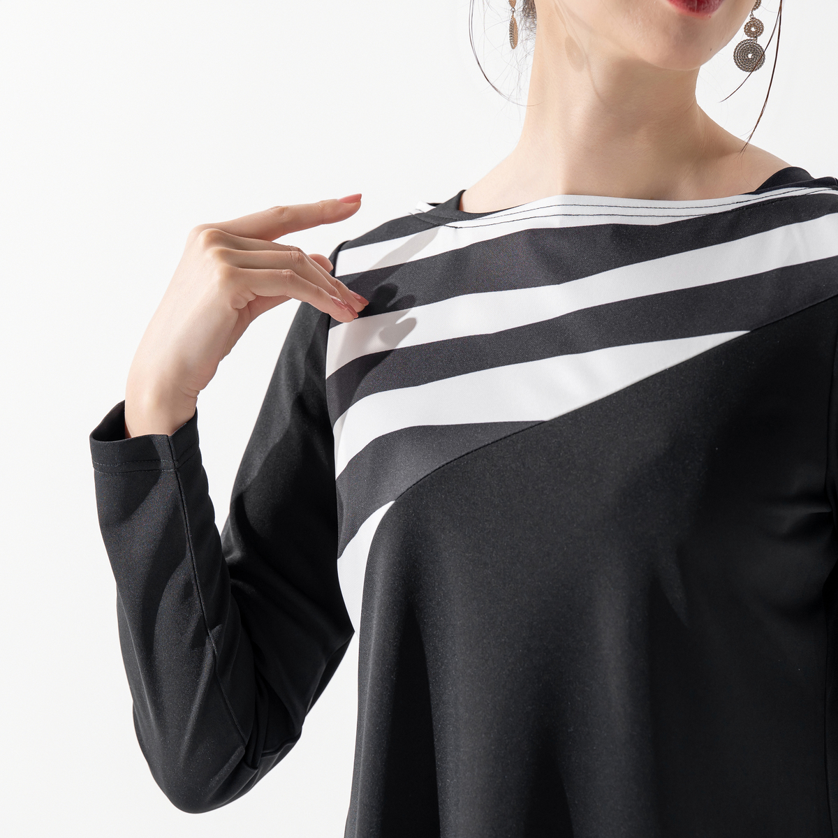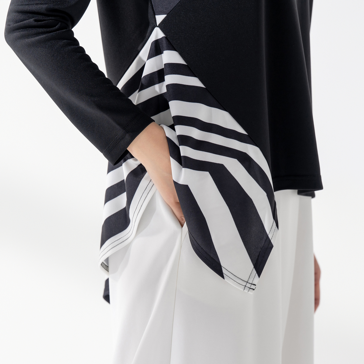 アシンメトリーなデザインがエレガントなプルオーバー。躍動感のある直線を組み合わせ、斜めに切り替えたパーツにプリント。シンプルなパンツやスカートと合わせるだけで、コーディネートにアクセントをプラスしてくれます