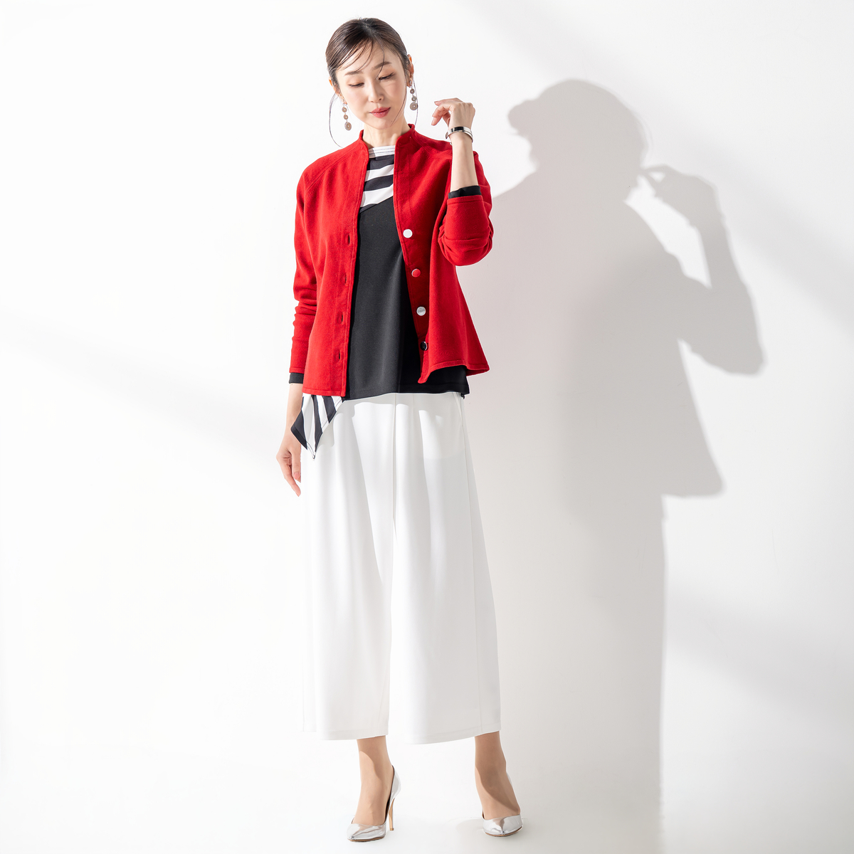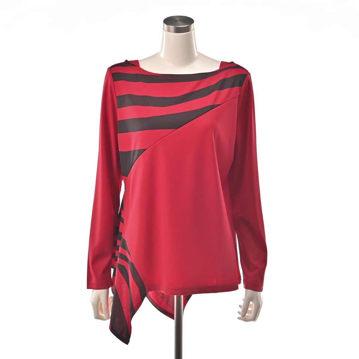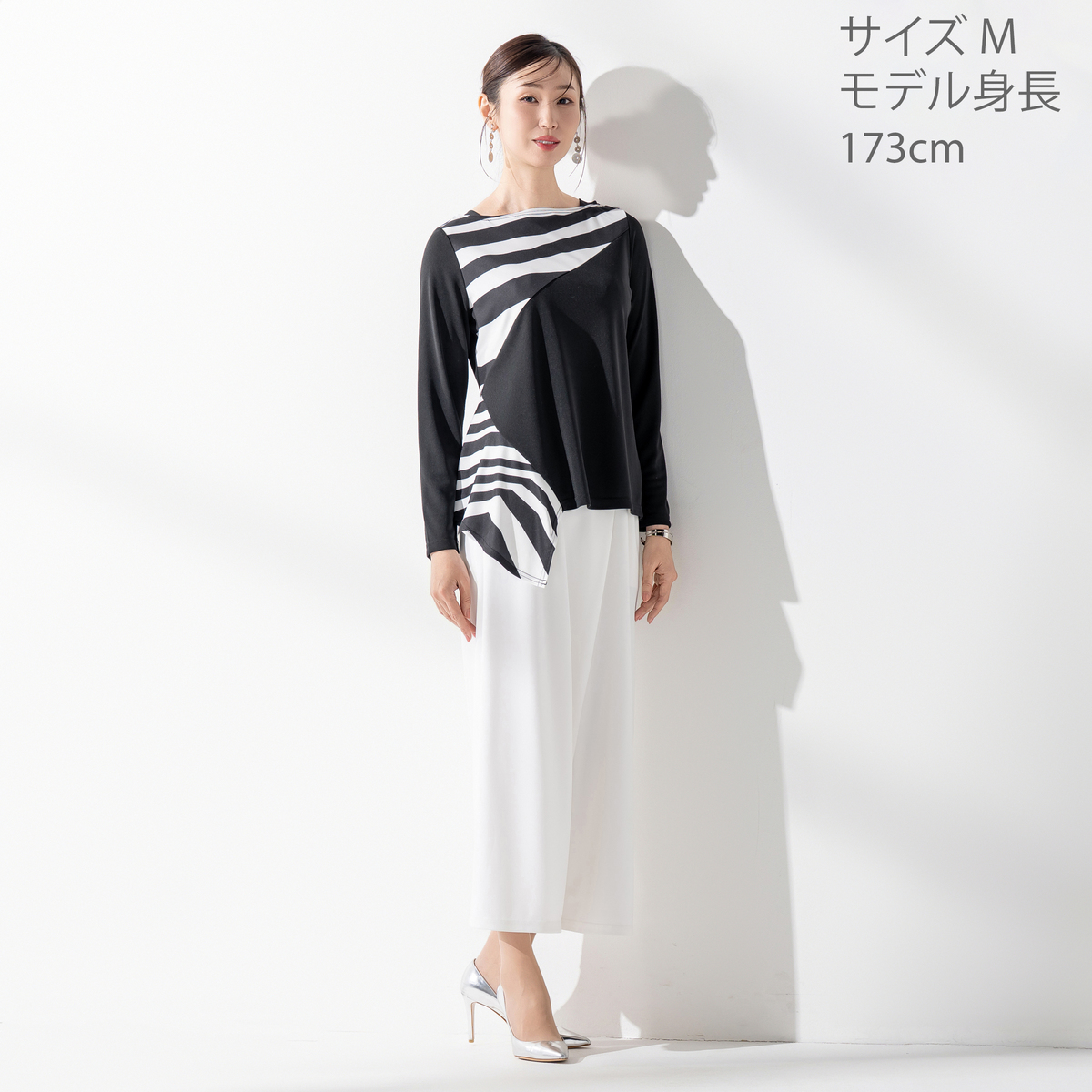 アシンメトリーなデザインがエレガントなプルオーバー。躍動感のある直線を組み合わせ、斜めに切り替えたパーツにプリント。シンプルなパンツやスカートと合わせるだけで、コーディネートにアクセントをプラスしてくれます