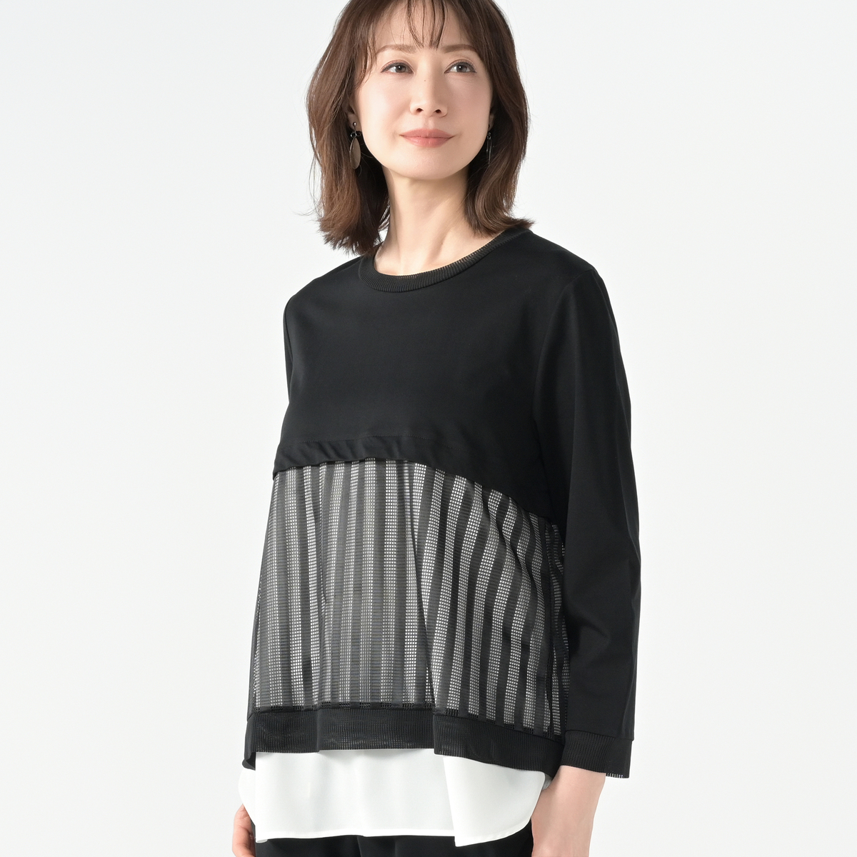 素材を重ねたレイヤードデザインで、一枚着るだけでおしゃれにスタイリング。異素材ミックスが生み出す立体感や透け感が華やかさをプラスしてくれます