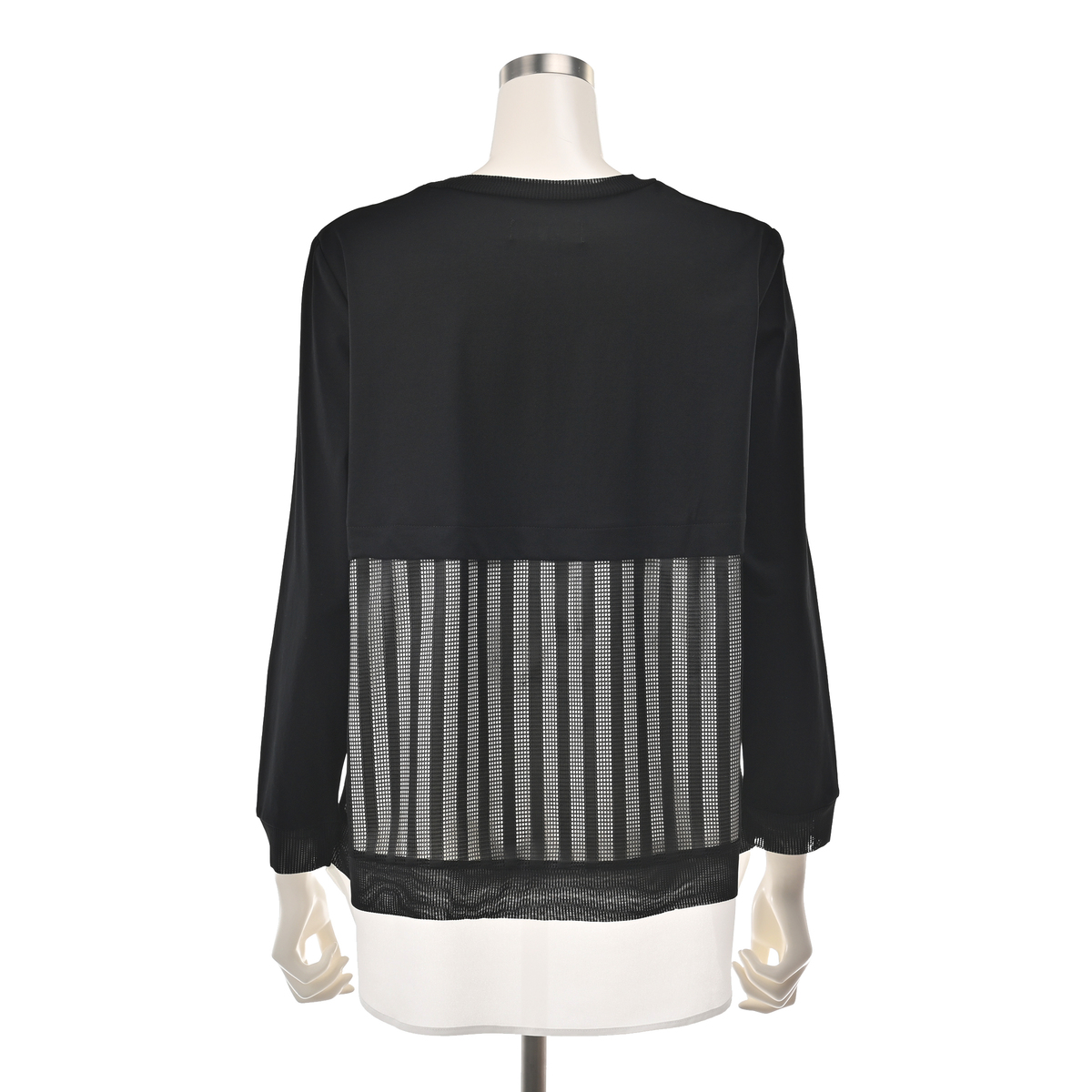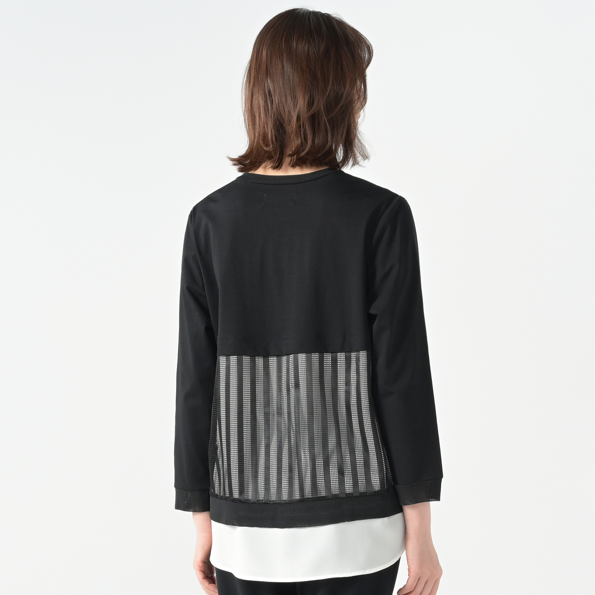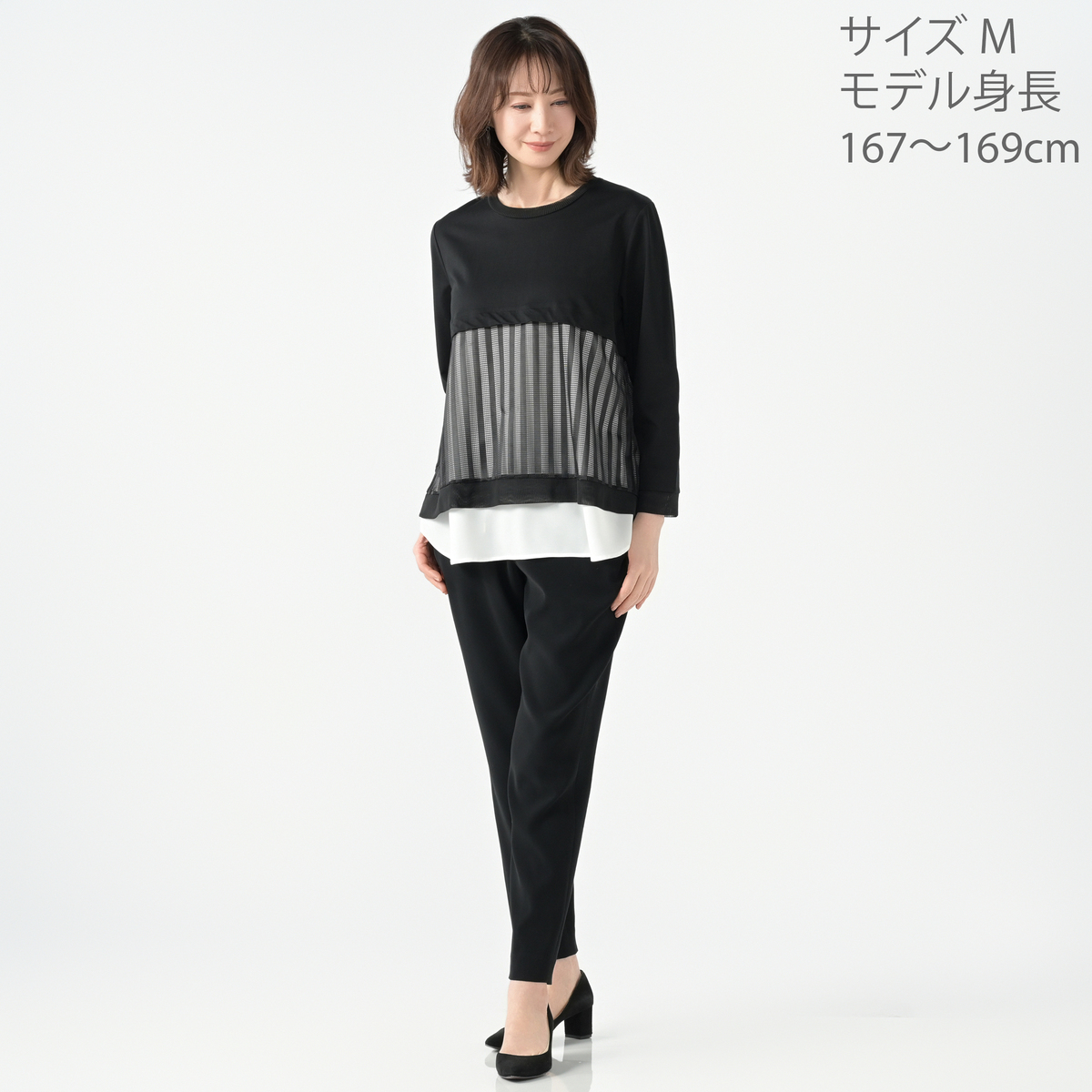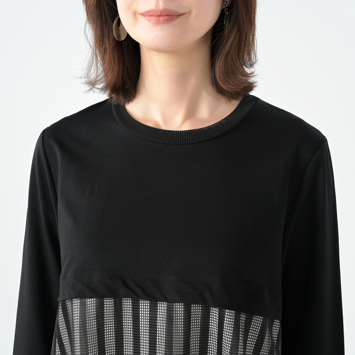 [商品寸法(ヌード)cm] サイズ バスト 着丈 S : 101(73〜81) 65.5 M : 106(79〜87) 67 L : 112(85〜93) 68.5 LL : 118(91〜99) 70 3L : 124(97〜105)71.5 サイズ 肩幅 袖丈 S : 38 52 M : 39 52 L : 40 52 LL : 42 53 3L : 43 53 [素材] 本体:綿70% ポリエステル30% 上裾ネット生地部分:ポリエステル100% 下裾別布部分:ポリエステル100% チュール部分:ポリエステル95% ポリウレタン5% [お手入れ] 洗濯機洗い可 [注意事項] ※商品寸法の誤差は多少発生します。ご了承下さい ※洗濯後は重ね置きしないで下さい ※洗濯後はすぐに脱水し、形を整えて干して下さい。長時間、水につけたままにしないで下さい ※素材の特性上、着用や洗濯・クリーニング時の摩擦により毛羽立ち、毛玉が発生します。その際はお早めに毛玉取り器等で手入れをして下さい ※直射日光や蛍光灯の影響で変色することがありますのでご了承下さい ※濃色製品は着用中の摩擦により色移りすることがあります。また、雨や汗等で濡れた状態で着用すると色移りすることがあります。その際はお早めに洗濯をして下さい ※洗濯やクリーニングにより徐々に色あせします。また、色落ちすることがありますので、他の物と分けて洗って下さい ※洗濯の際は裏返しにし、洗濯ネットを使用して下さい 【中国製】
