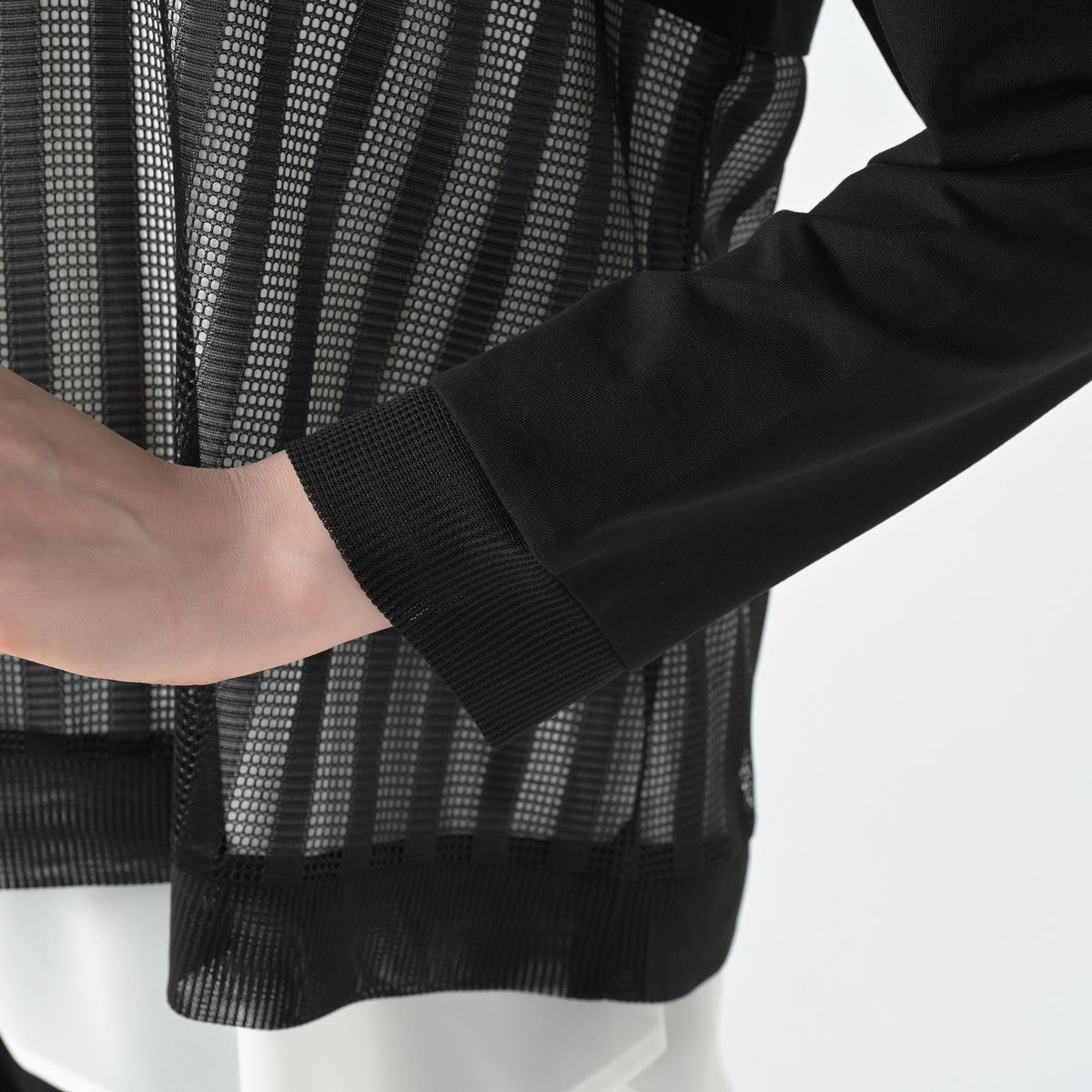 本体にはシルケット素材を使用。ストライプチュール、デシン、ストライプメッシュを組合わせたデザインプルオーバーです