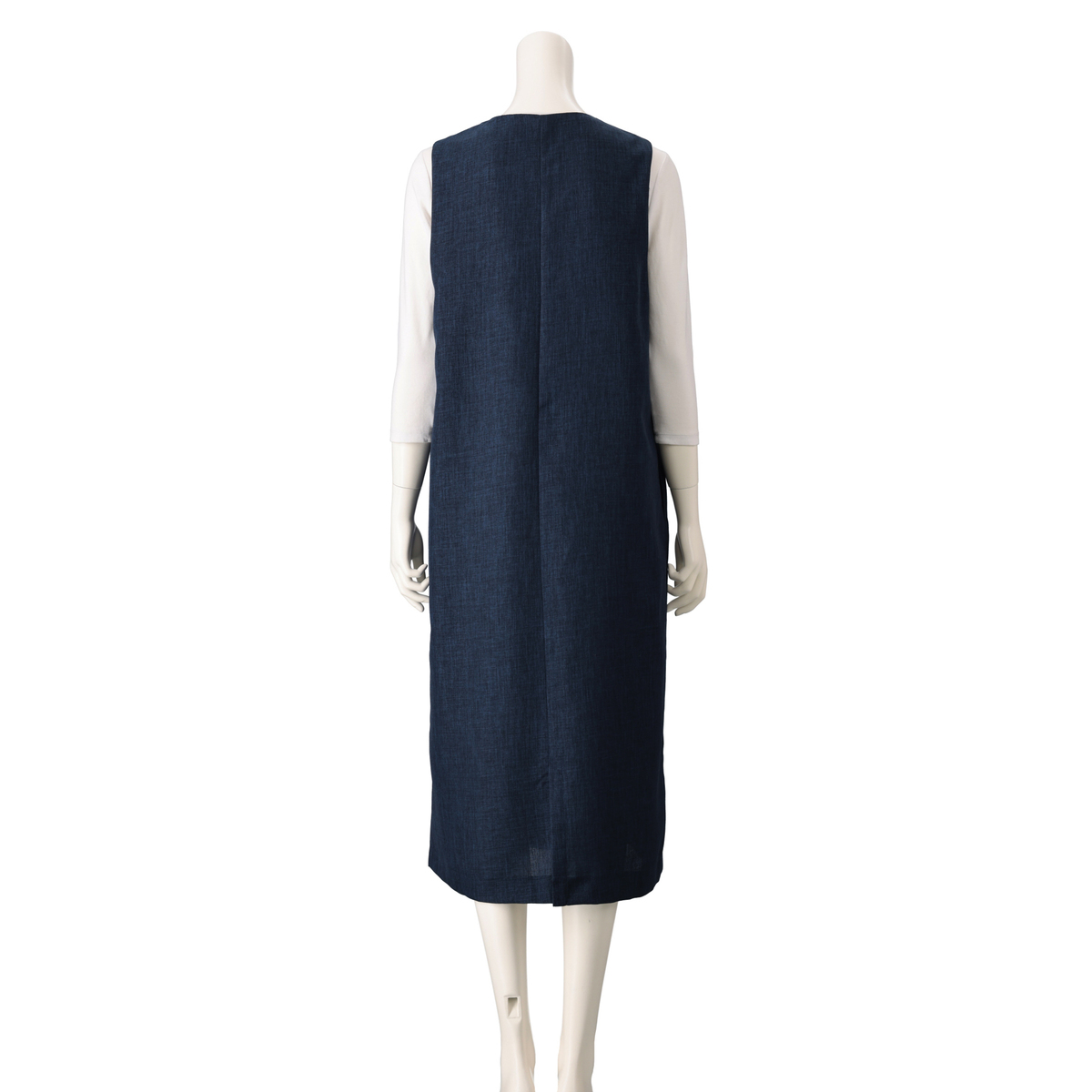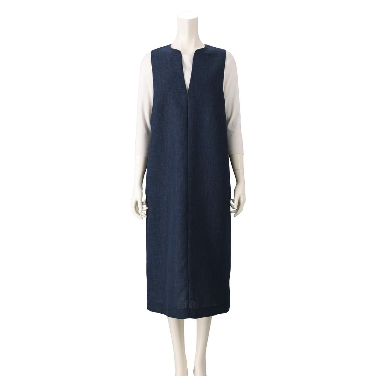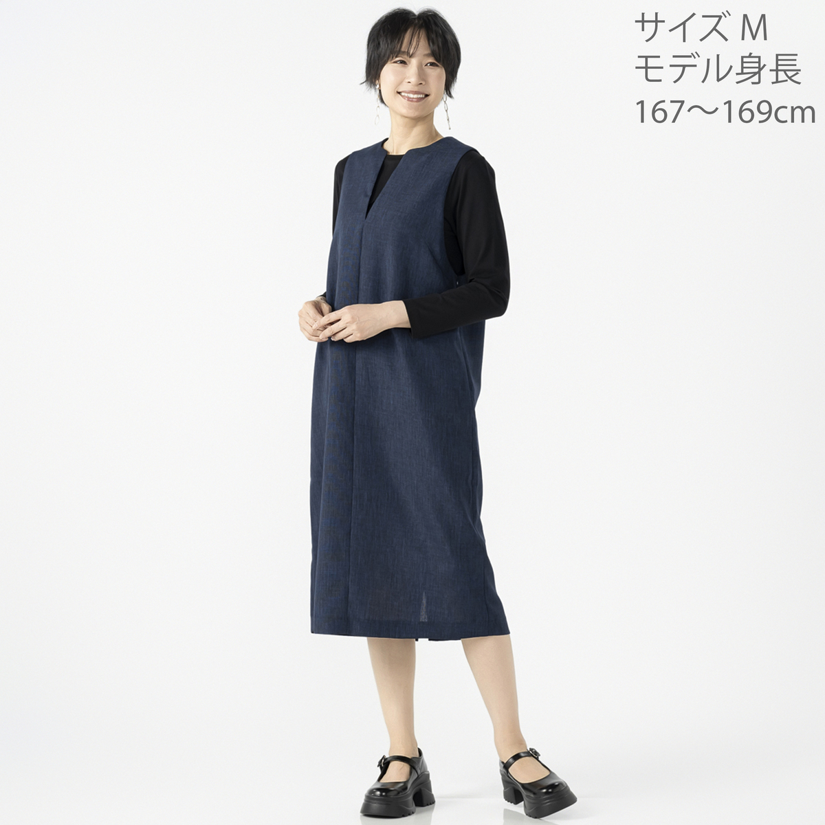 美しいシルエットのシンプルなジャンパースカート。縦畝や横畝が不規則に並ぶブッチャー素材を使用しました。きちんと感があり、上品に着こなせる1枚です