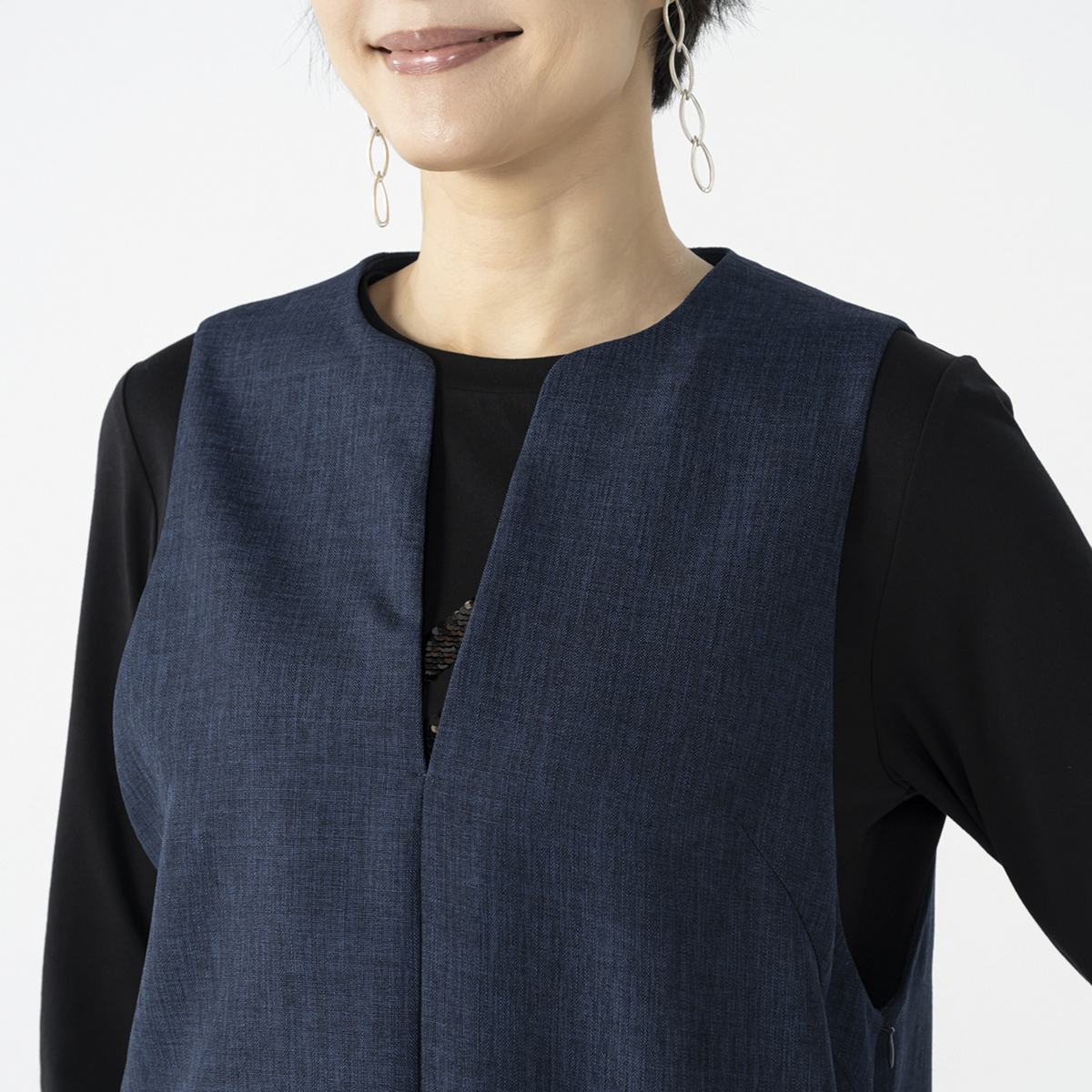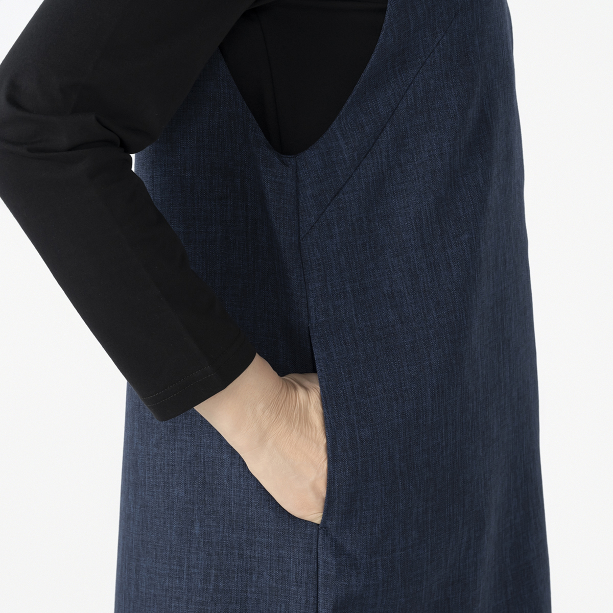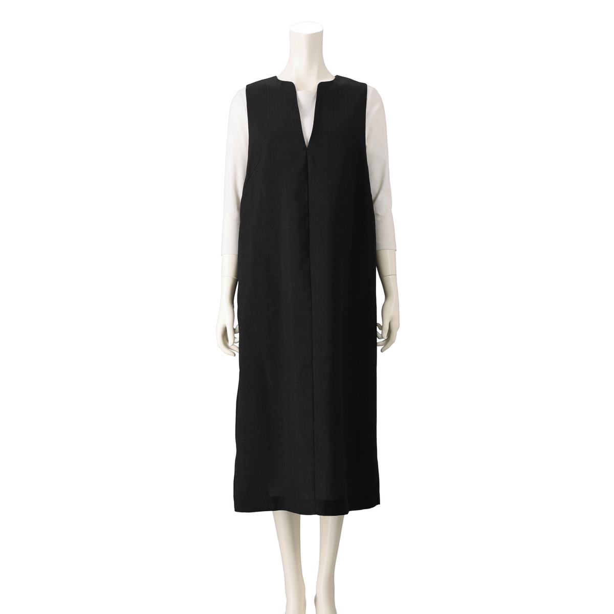 美しいシルエットのシンプルなジャンパースカート。縦畝や横畝が不規則に並ぶブッチャー素材を使用しました。きちんと感があり、上品に着こなせる1枚です