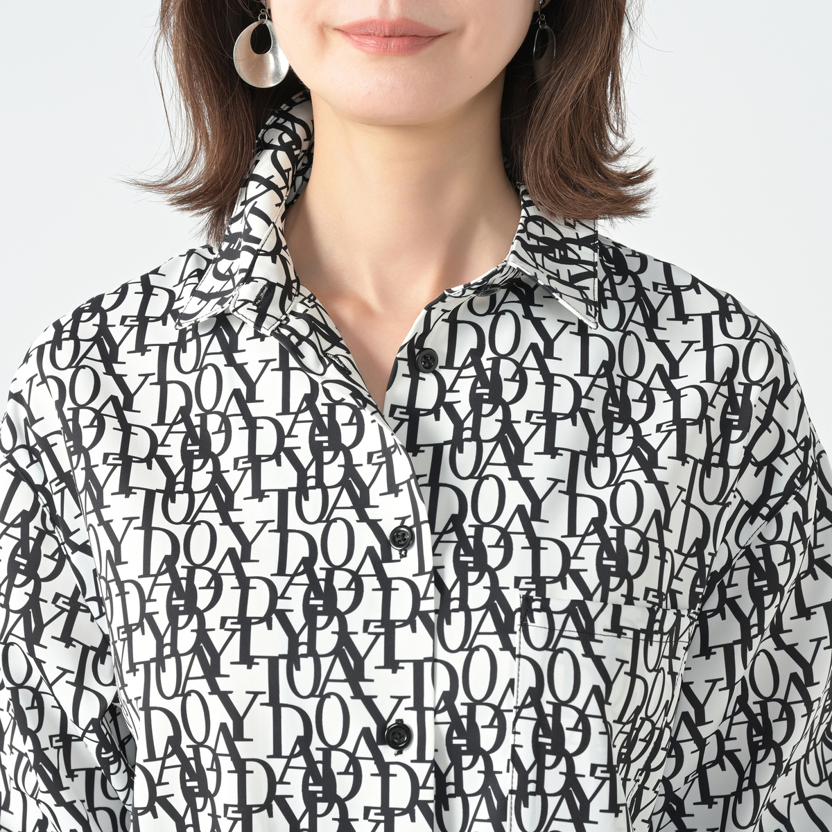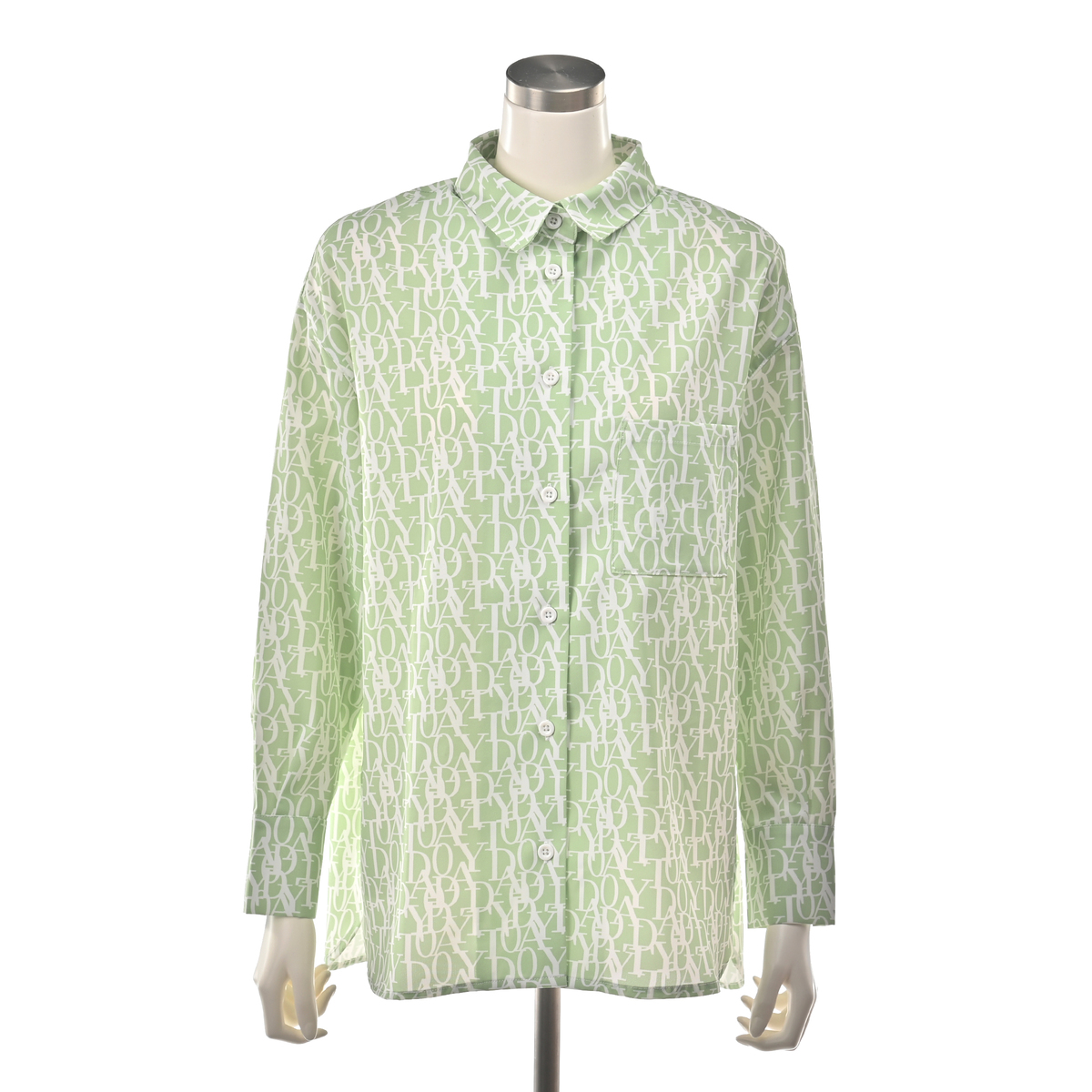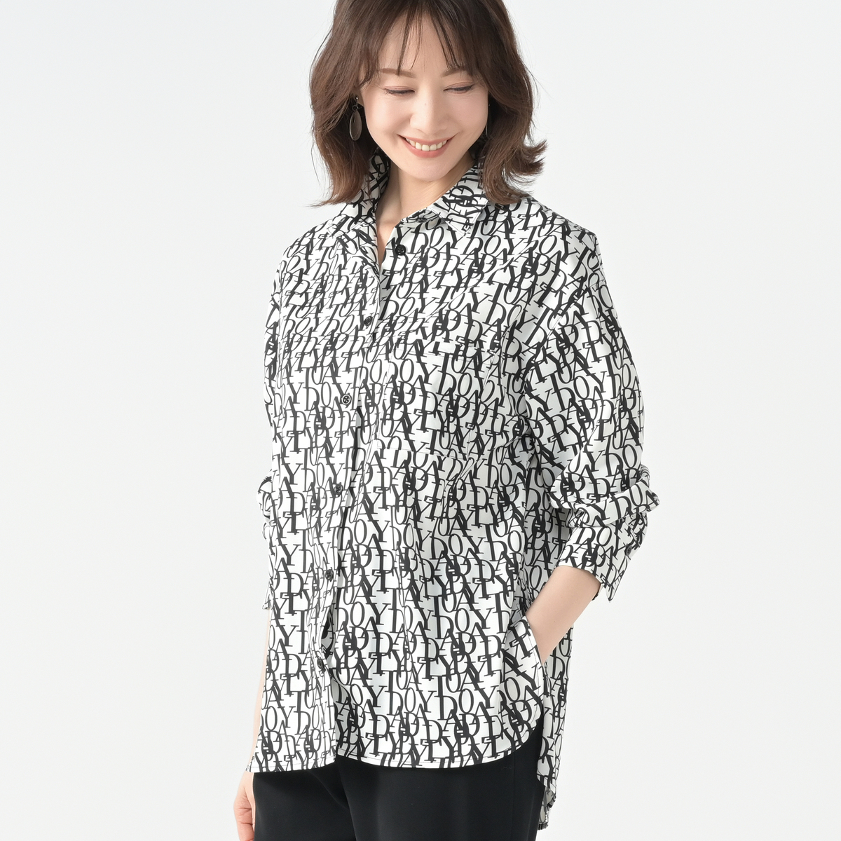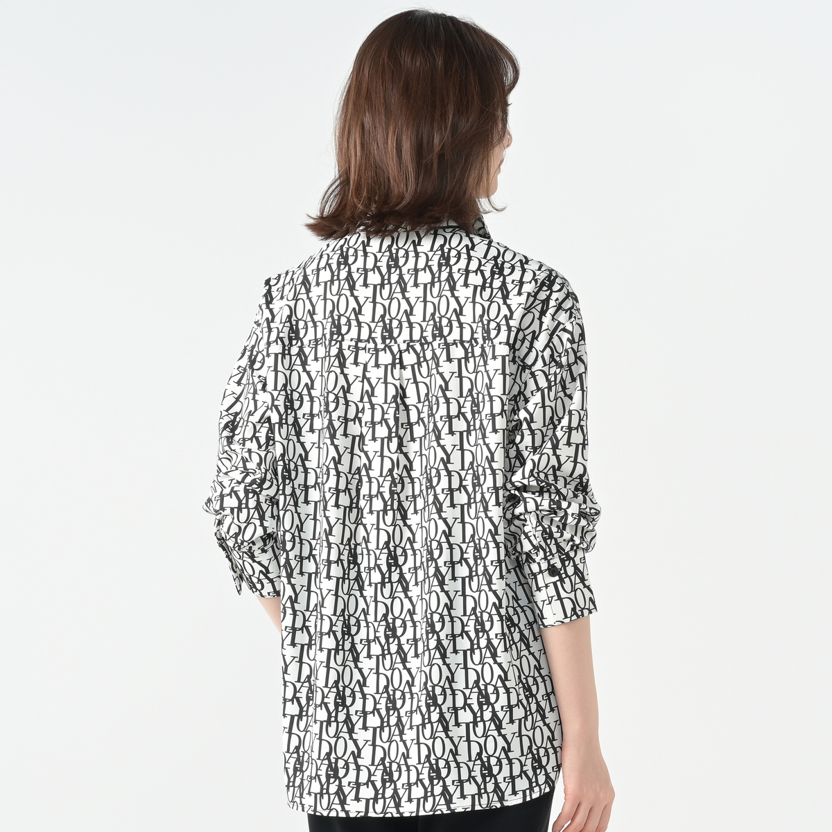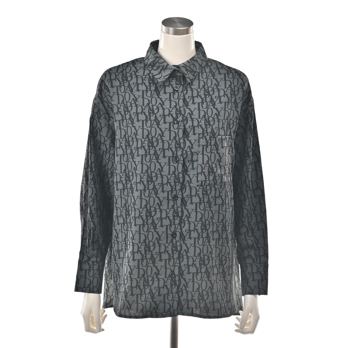 エレガントなフォントをプリントした総柄シャツ。衿腰の高いシャープな衿が特徴。シンプルな中に大人らしいこだわりを感じられる仕上がりです