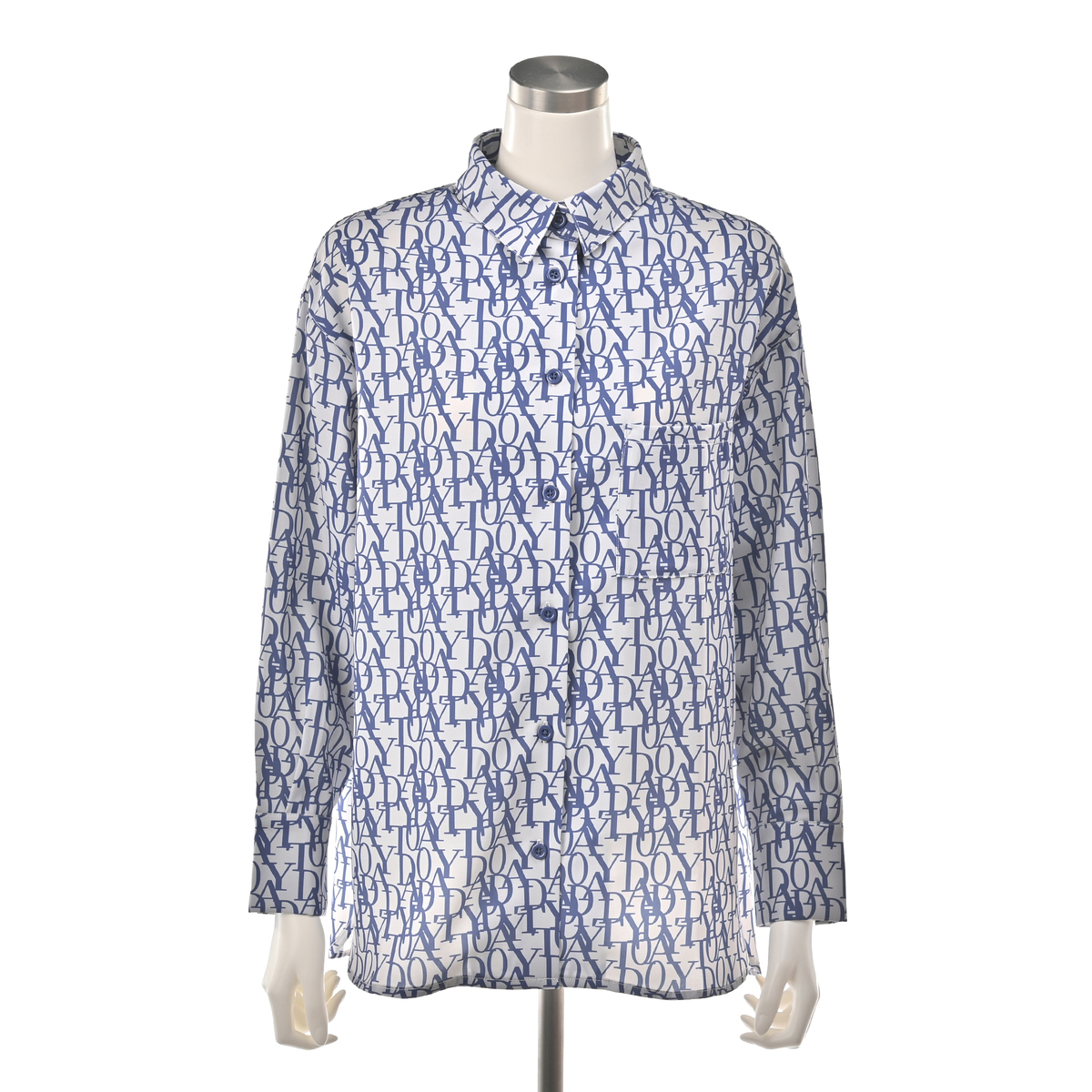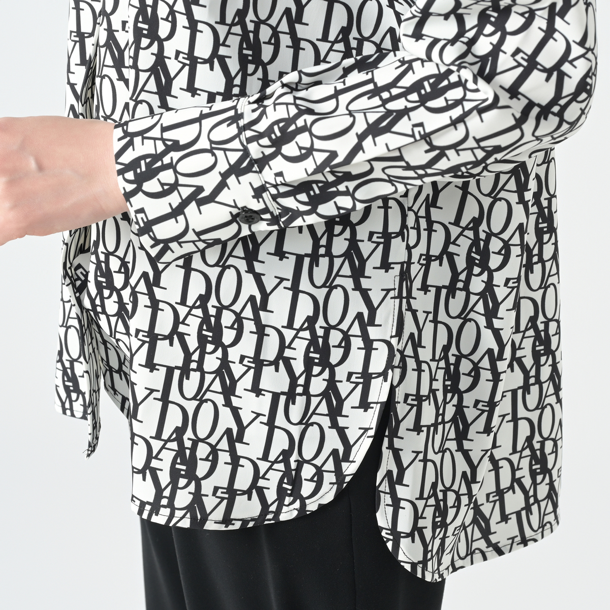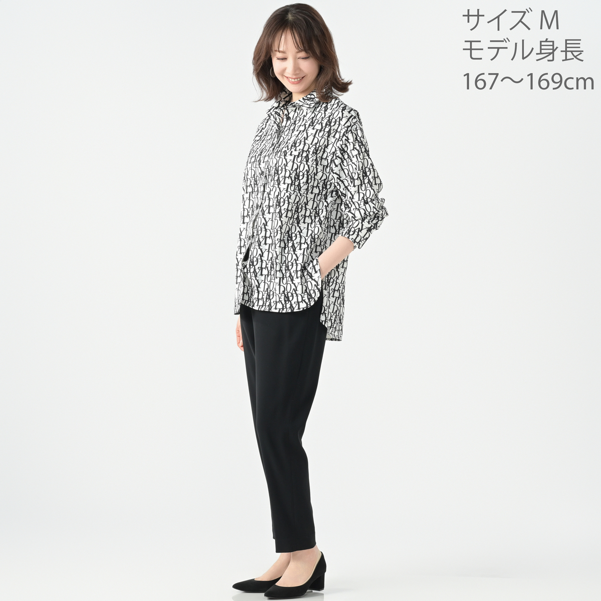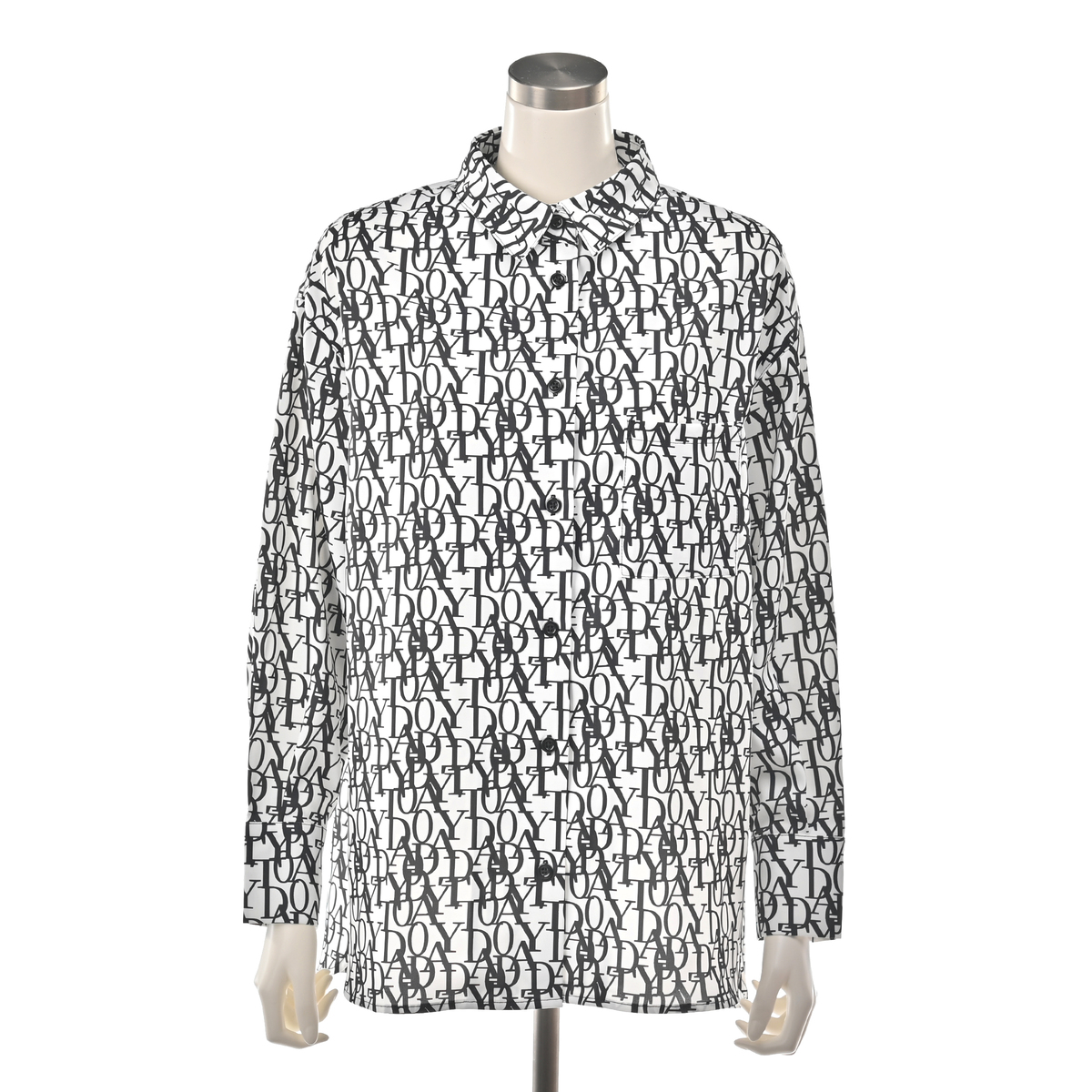 エレガントなフォントをプリントした総柄シャツ。衿腰の高いシャープな衿が特徴。シンプルな中に大人らしいこだわりを感じられる仕上がりです