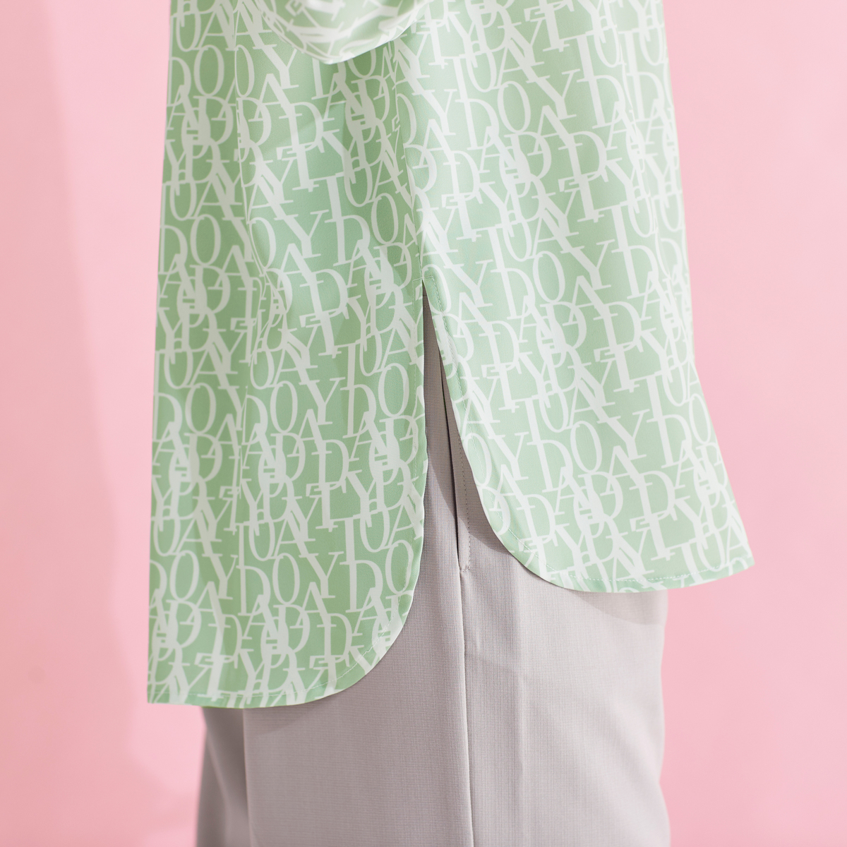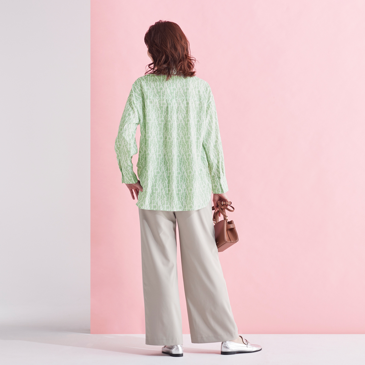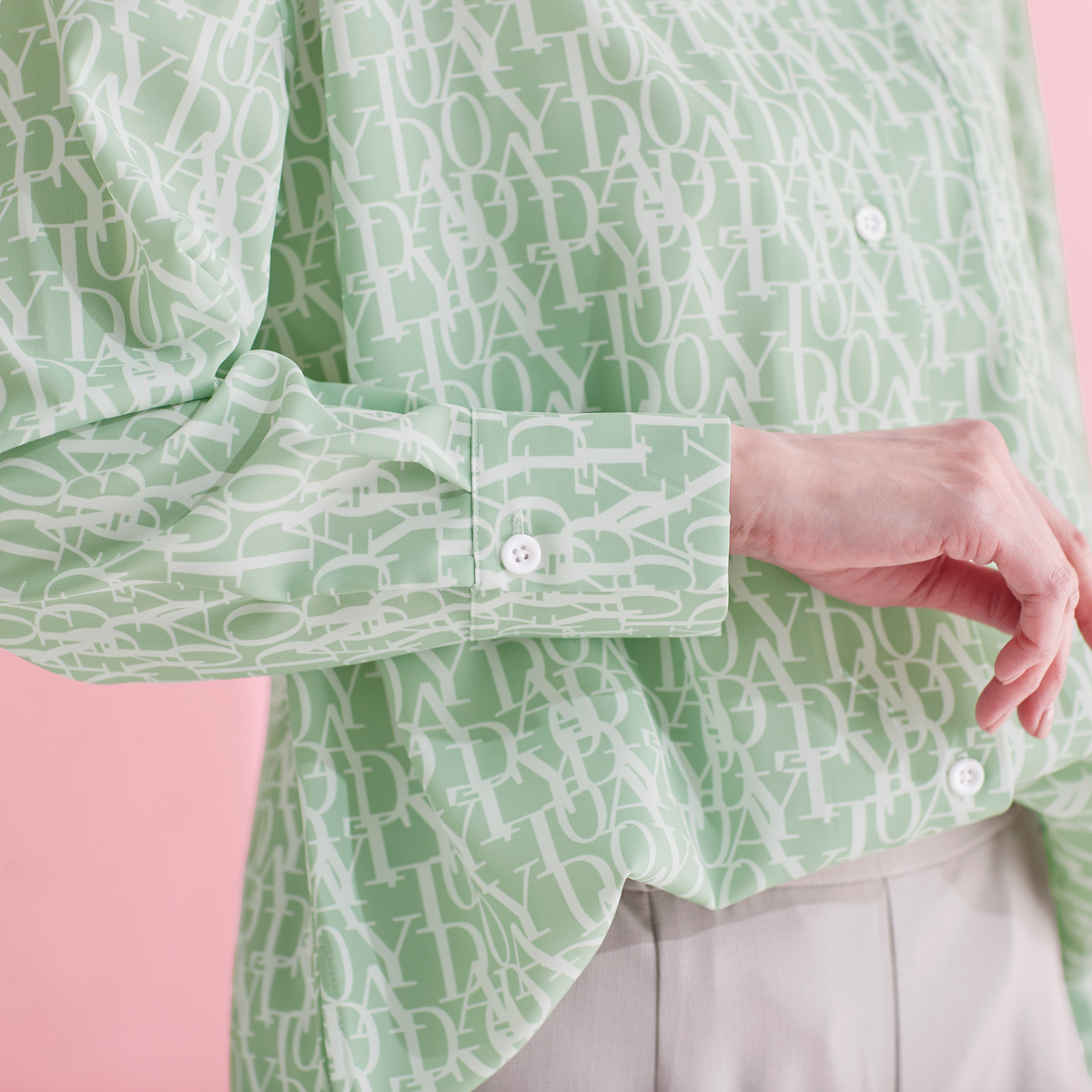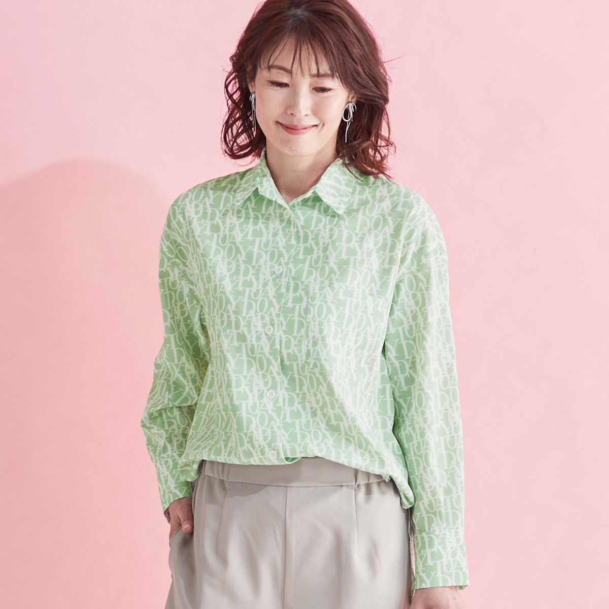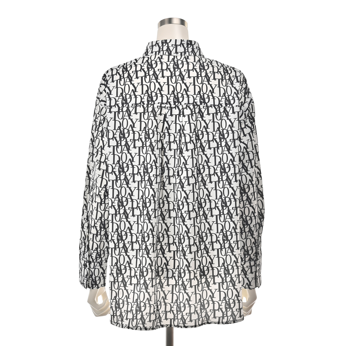 エレガントなフォントをプリントした総柄シャツ。衿腰の高いシャープな衿が特徴。シンプルな中に大人らしいこだわりを感じられる仕上がりです