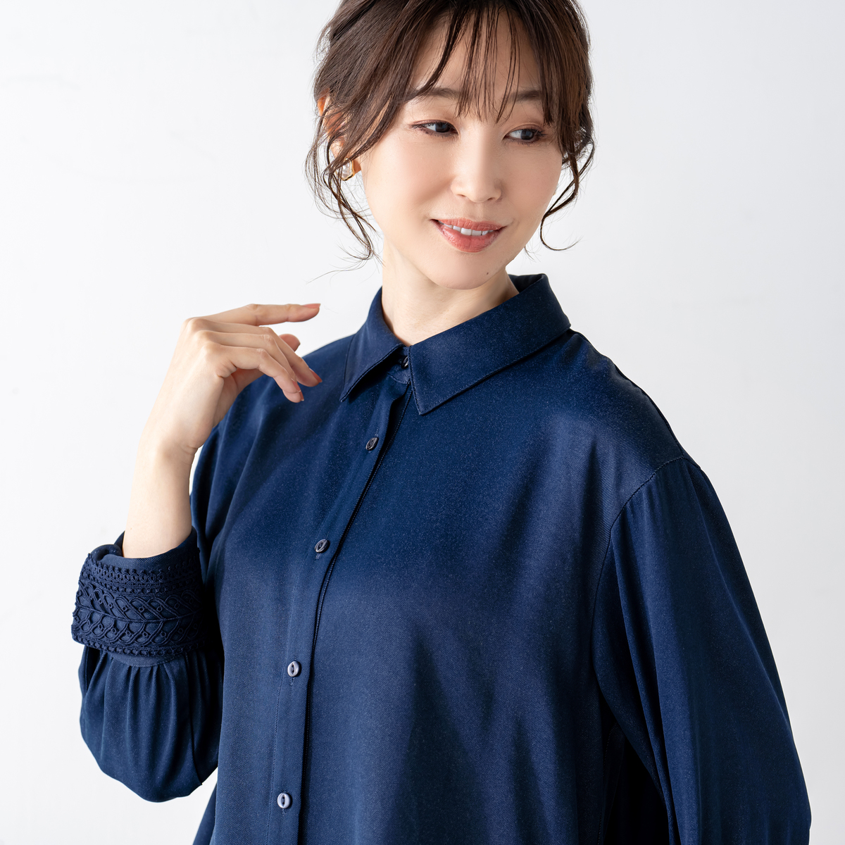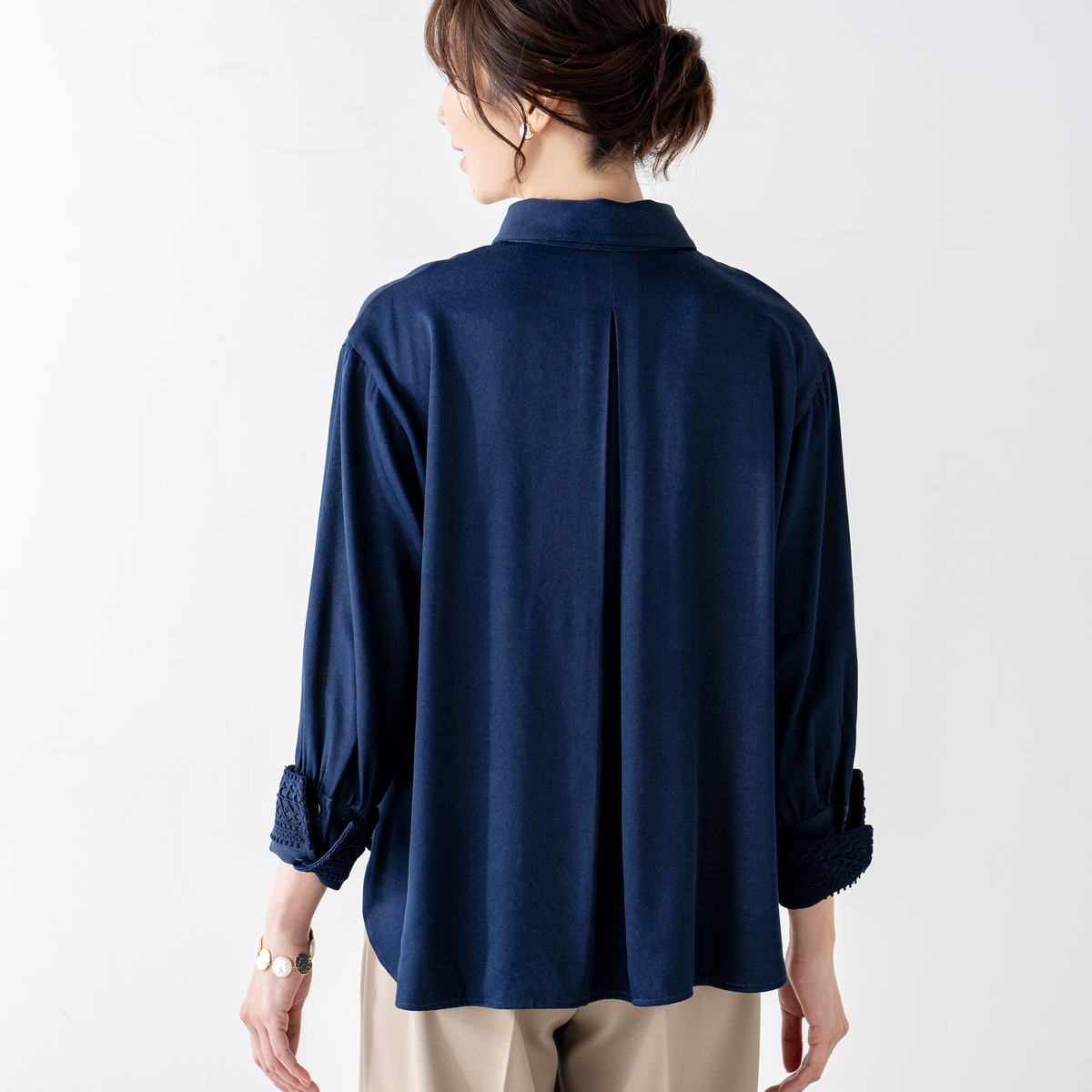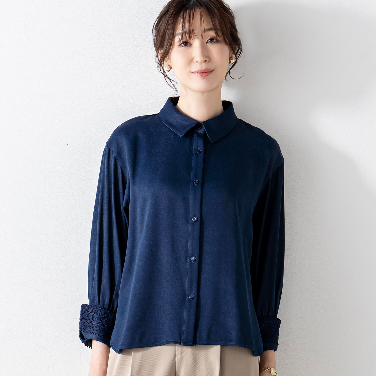 モダンな印象を添えるレースカフスシャツ。袖口のギャザーが立体感を生みシンプルなデザインに華やぎを添えます。カフス裏側には幾何学模様の刺繍レースを施し、折り返せば手元を上品に演出。カフスは2WAY仕様で着こなしに変化を楽しめます