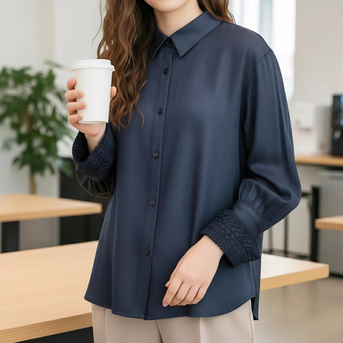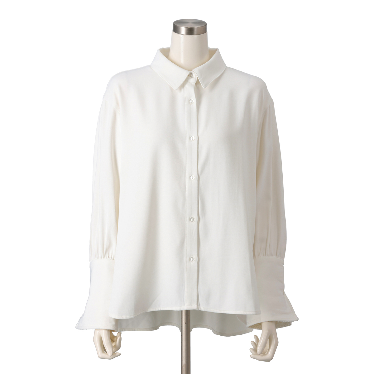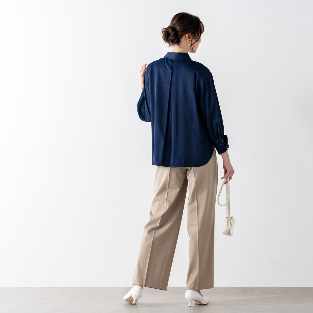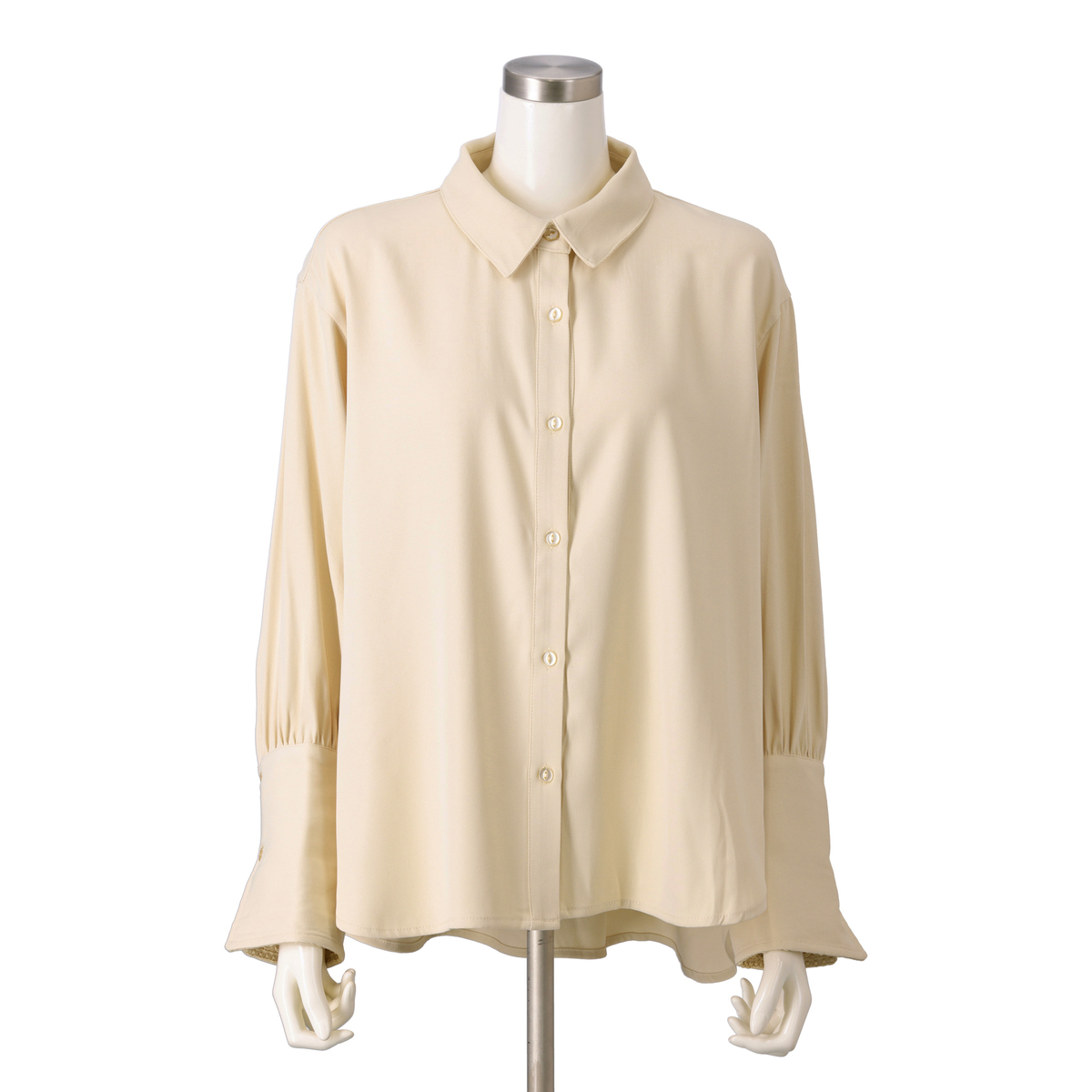モダンな印象を添えるレースカフスシャツ。袖口のギャザーが立体感を生みシンプルなデザインに華やぎを添えます。カフス裏側には幾何学模様の刺繍レースを施し、折り返せば手元を上品に演出。カフスは2WAY仕様で着こなしに変化を楽しめます