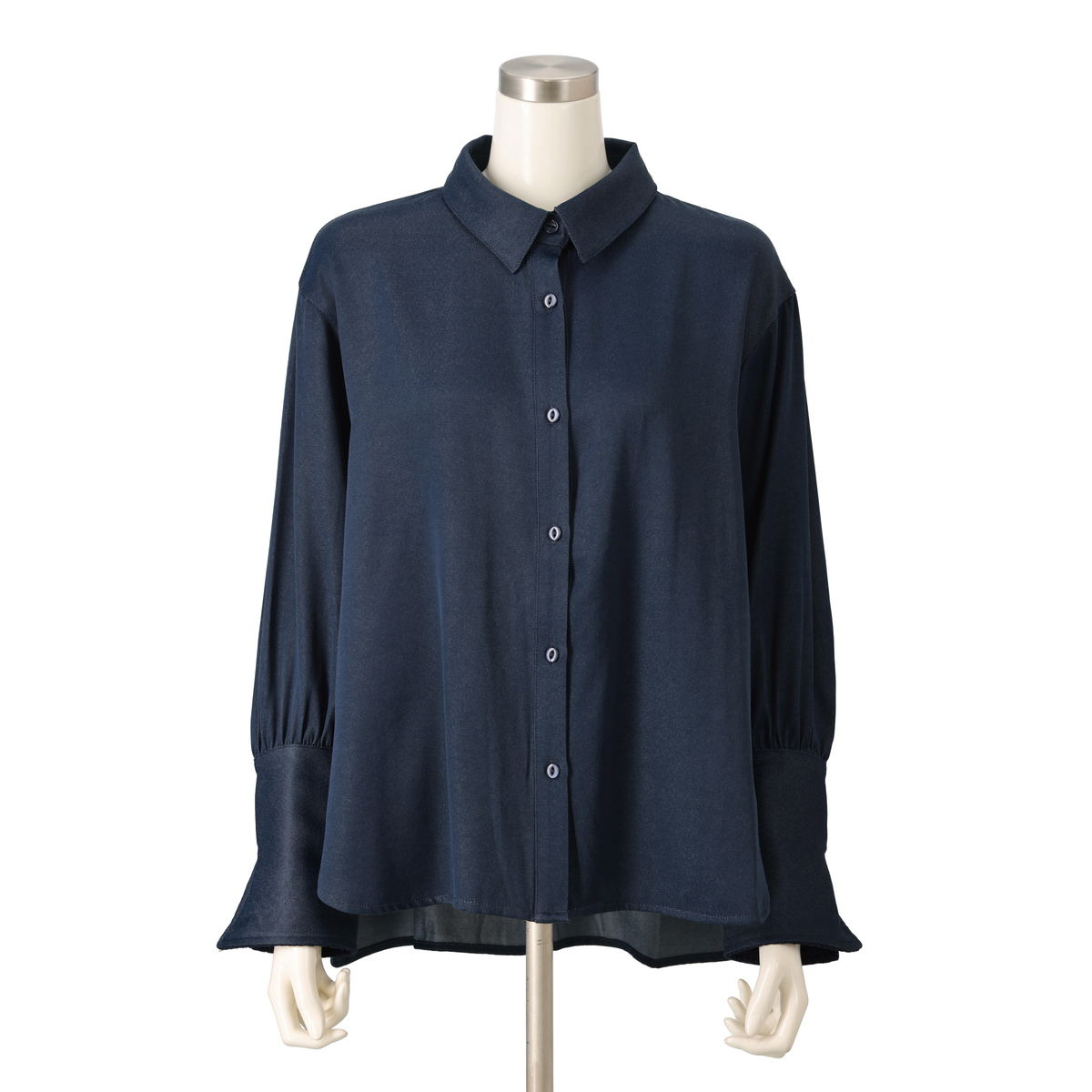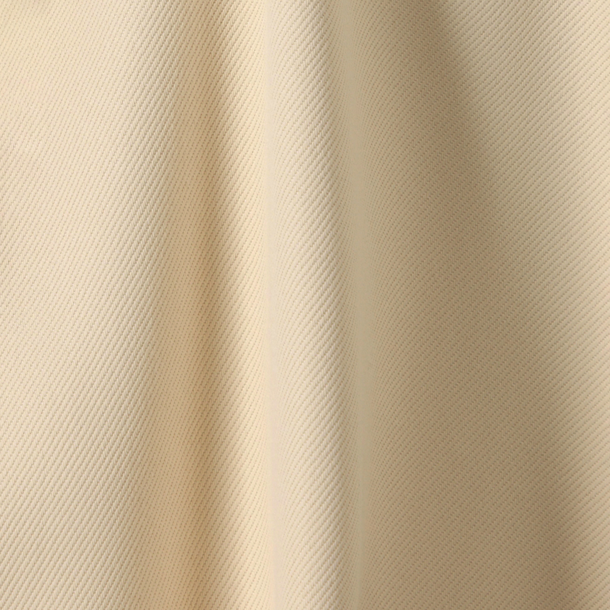 デニムのような外観の素材。ポリエステル・レーヨンならではの繊細な綾目とドレープ性で、カジュアルな表情と滑らかな落ち感を両立しています。見た目はラフでも、着こなしに上品さを添えます