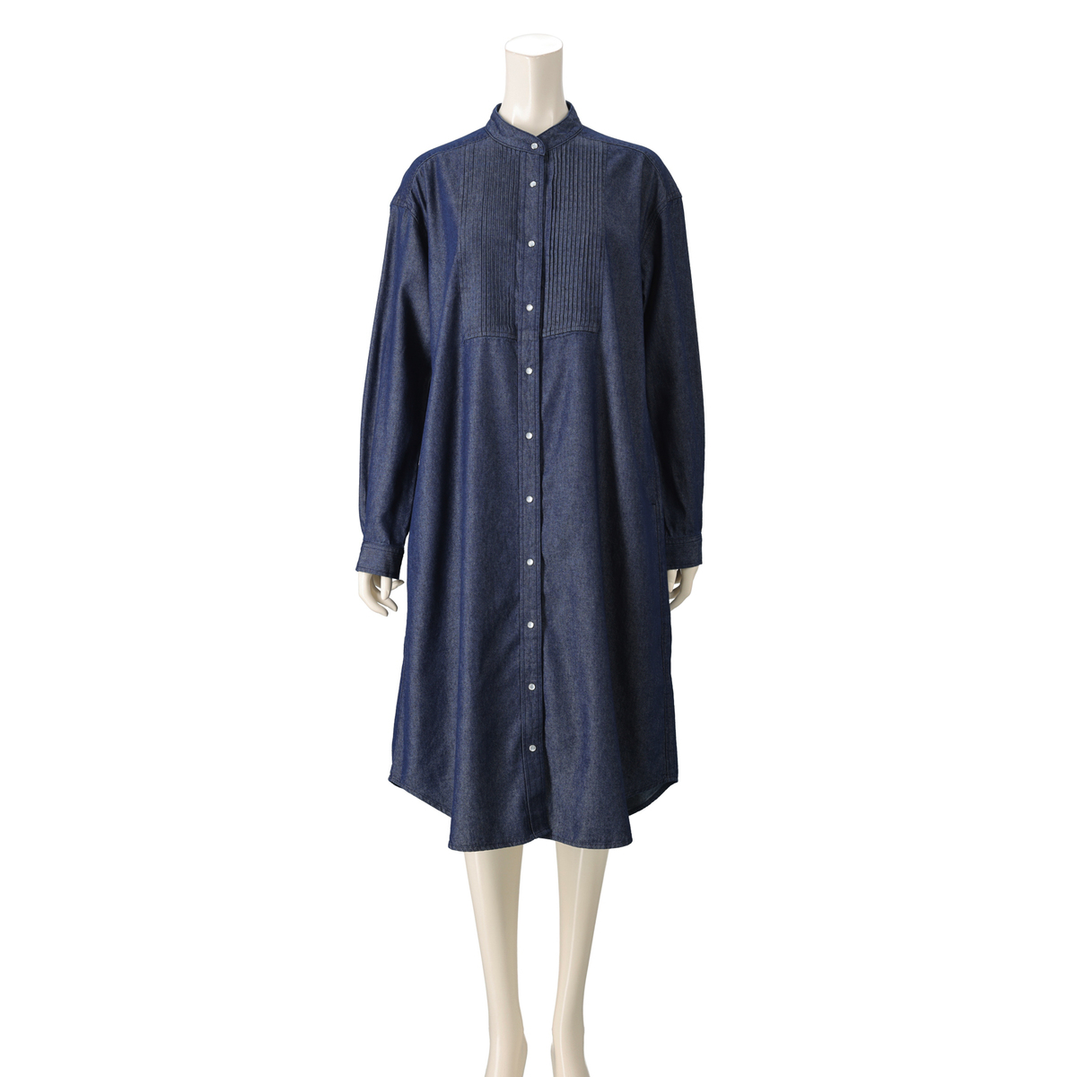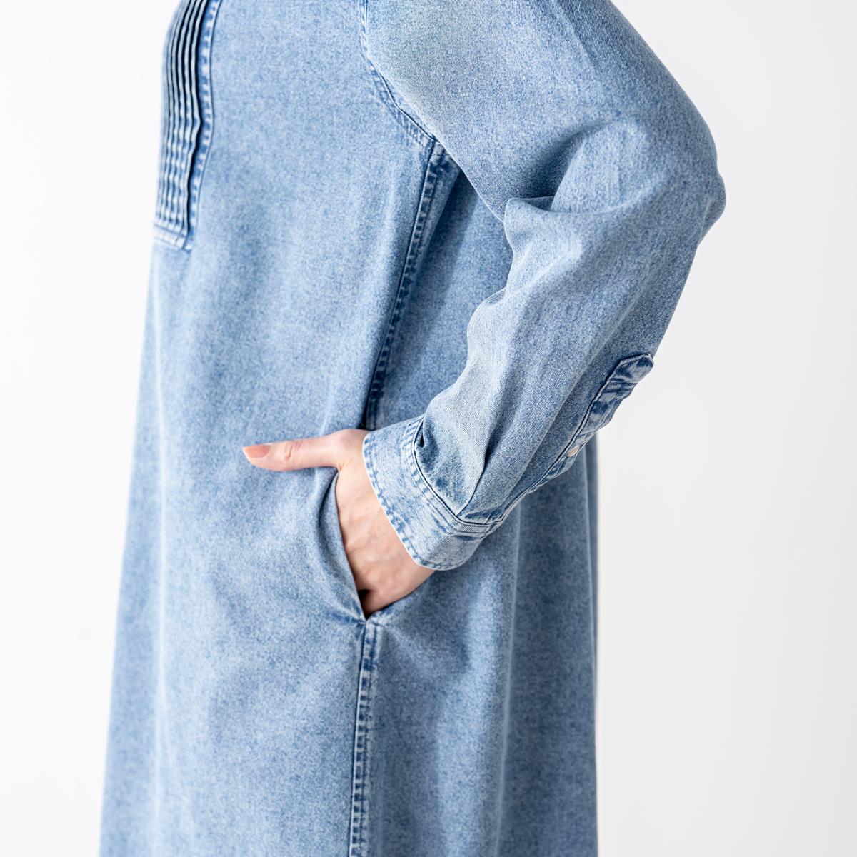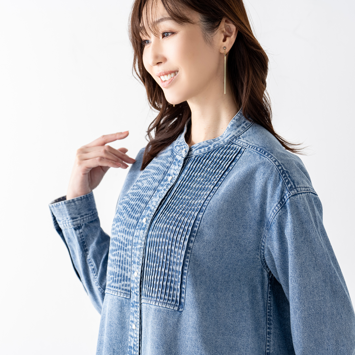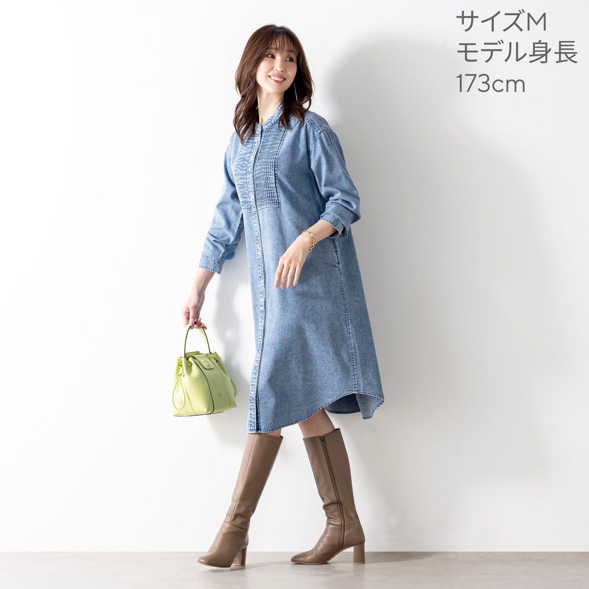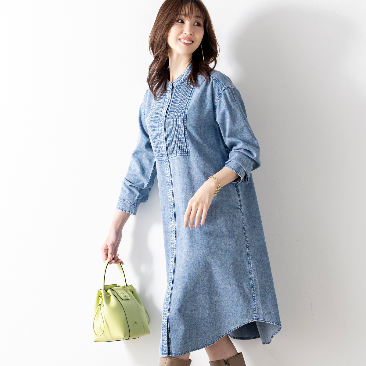 胸元のピンタックが上品なデニムワンピース。ゆったりとしたオーバーサイズのAラインシルエットで、ラウンド裾が軽やかな印象を作ります