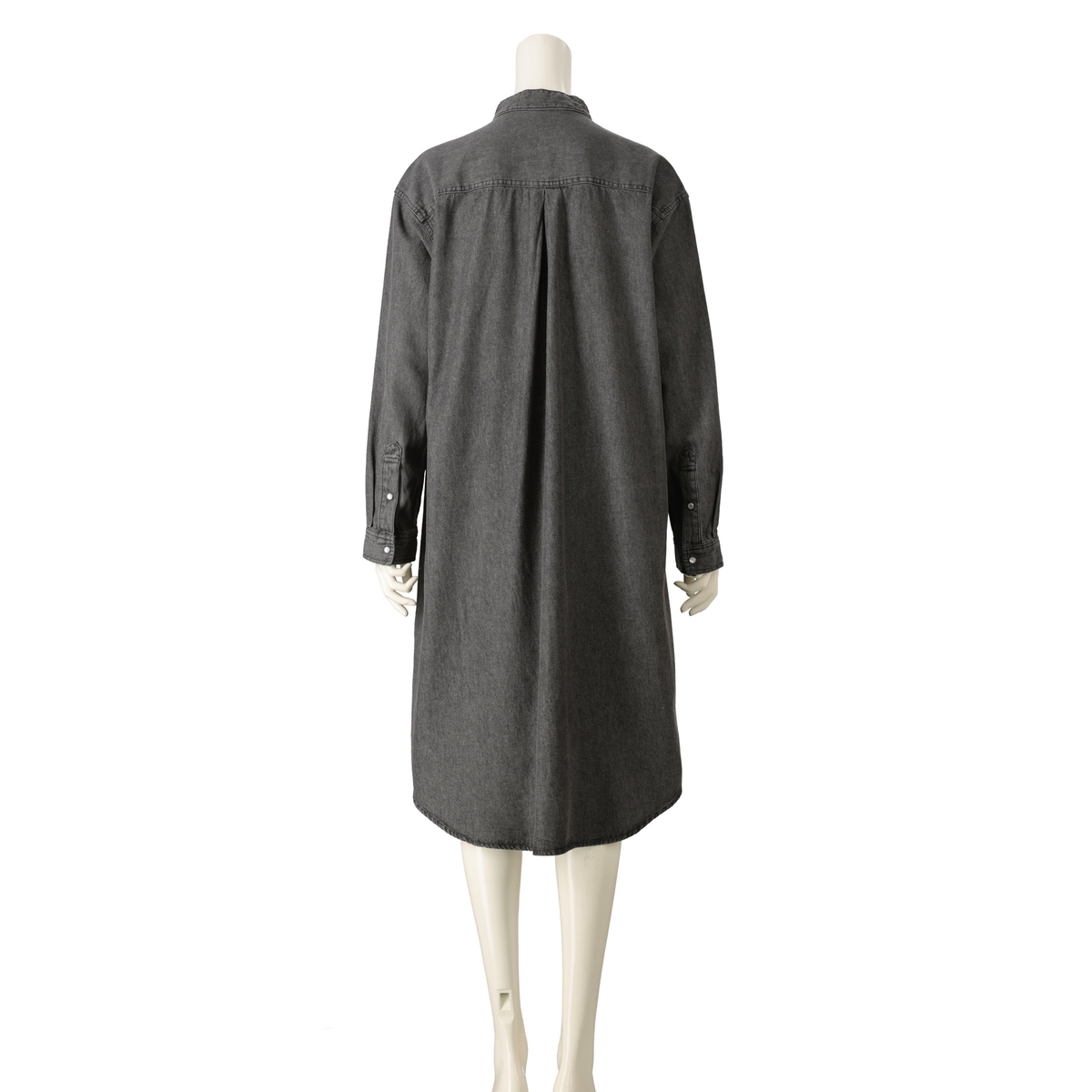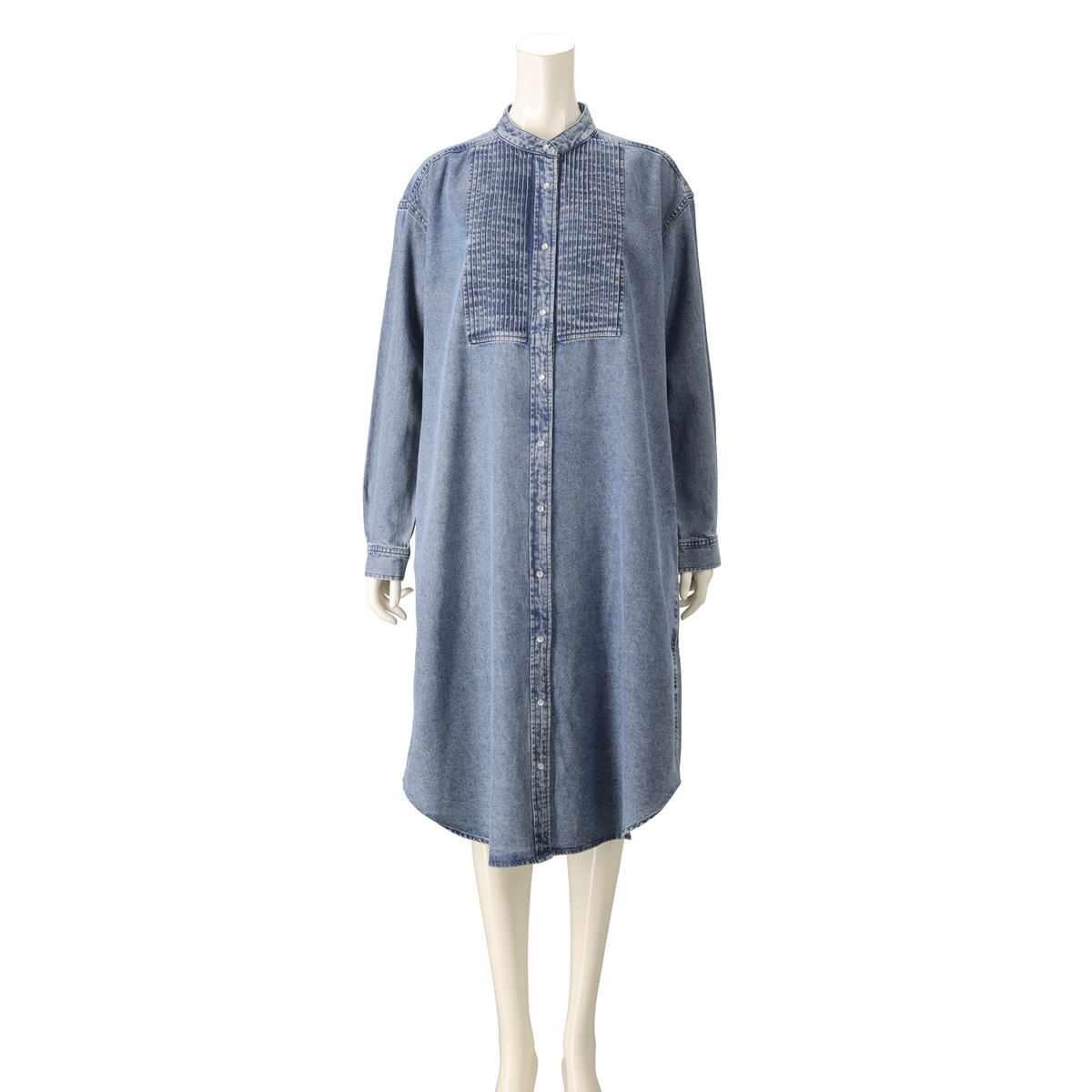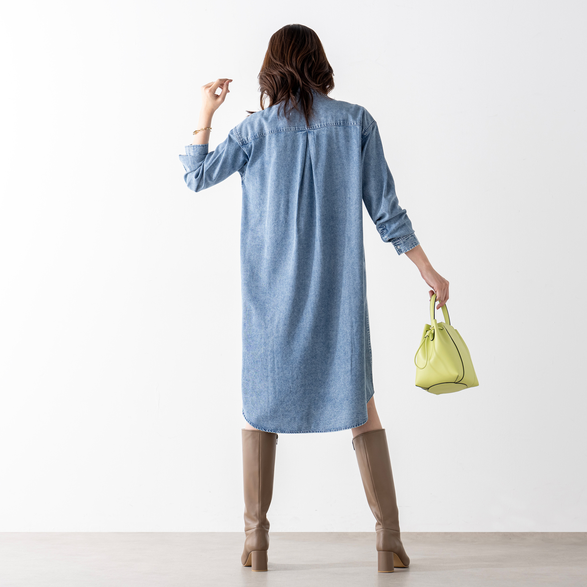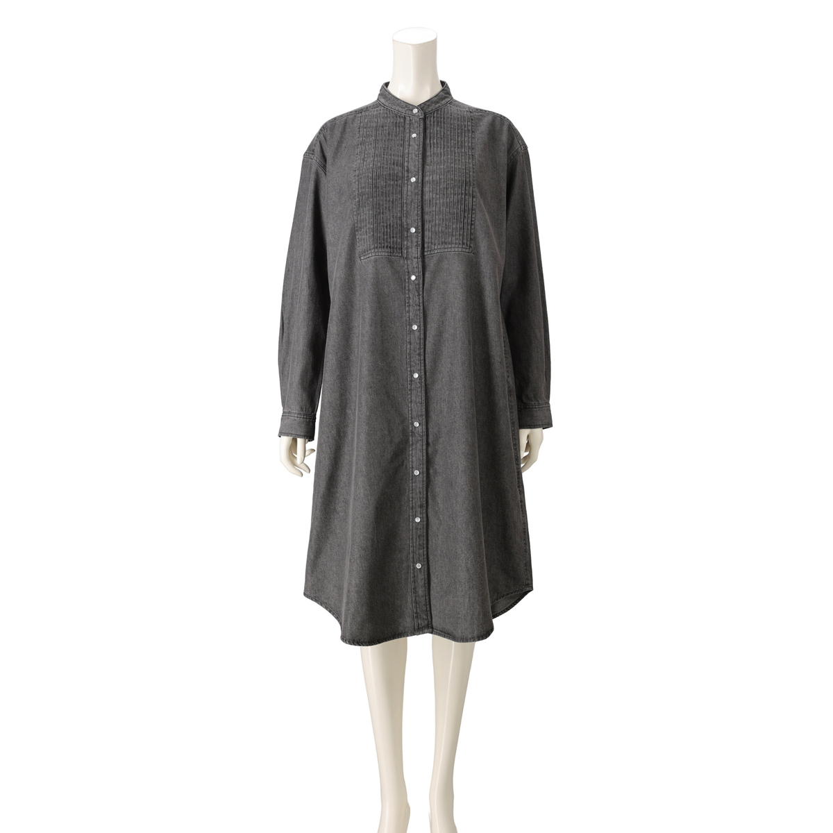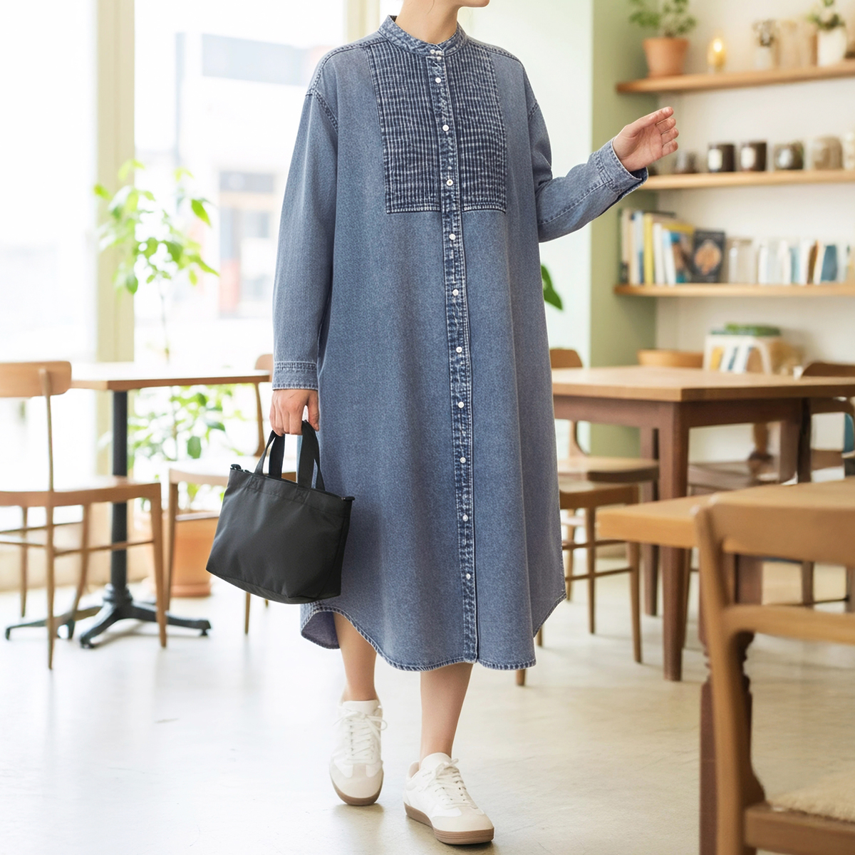 胸元のピンタックが上品なデニムワンピース。ゆったりとしたオーバーサイズのAラインシルエットで、ラウンド裾が軽やかな印象を作ります